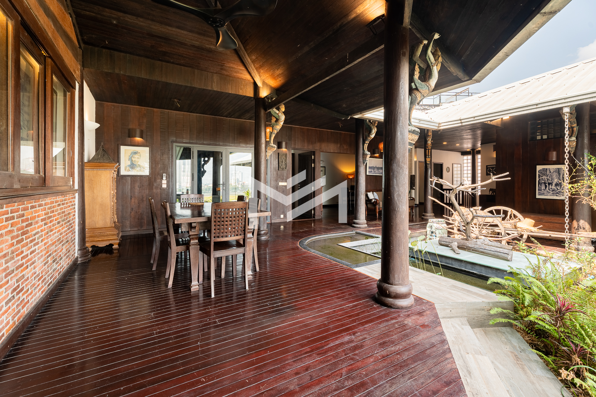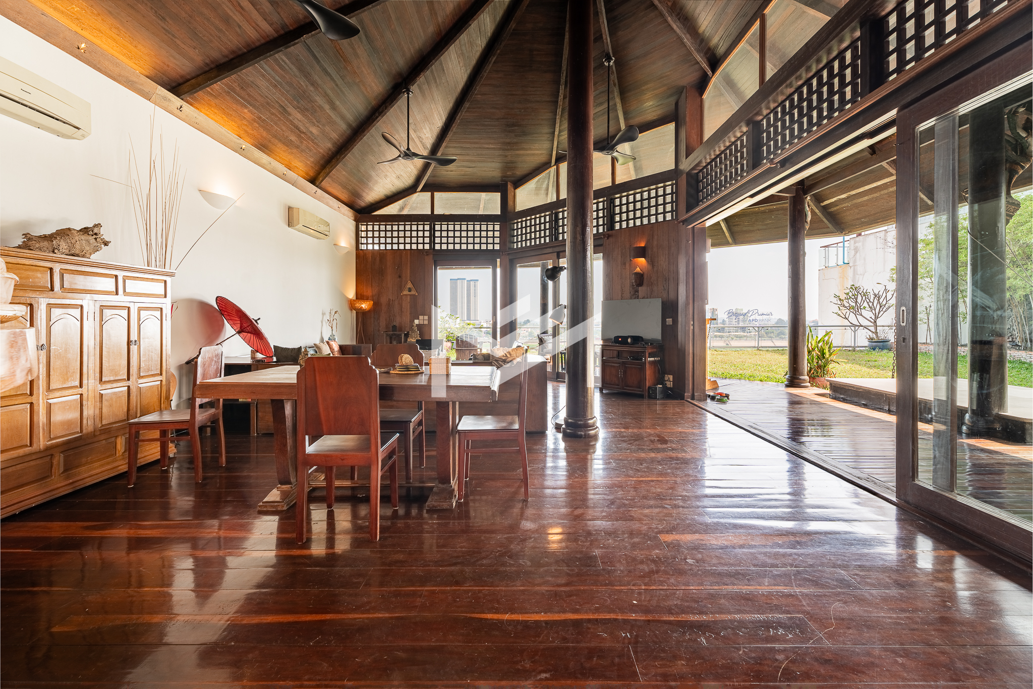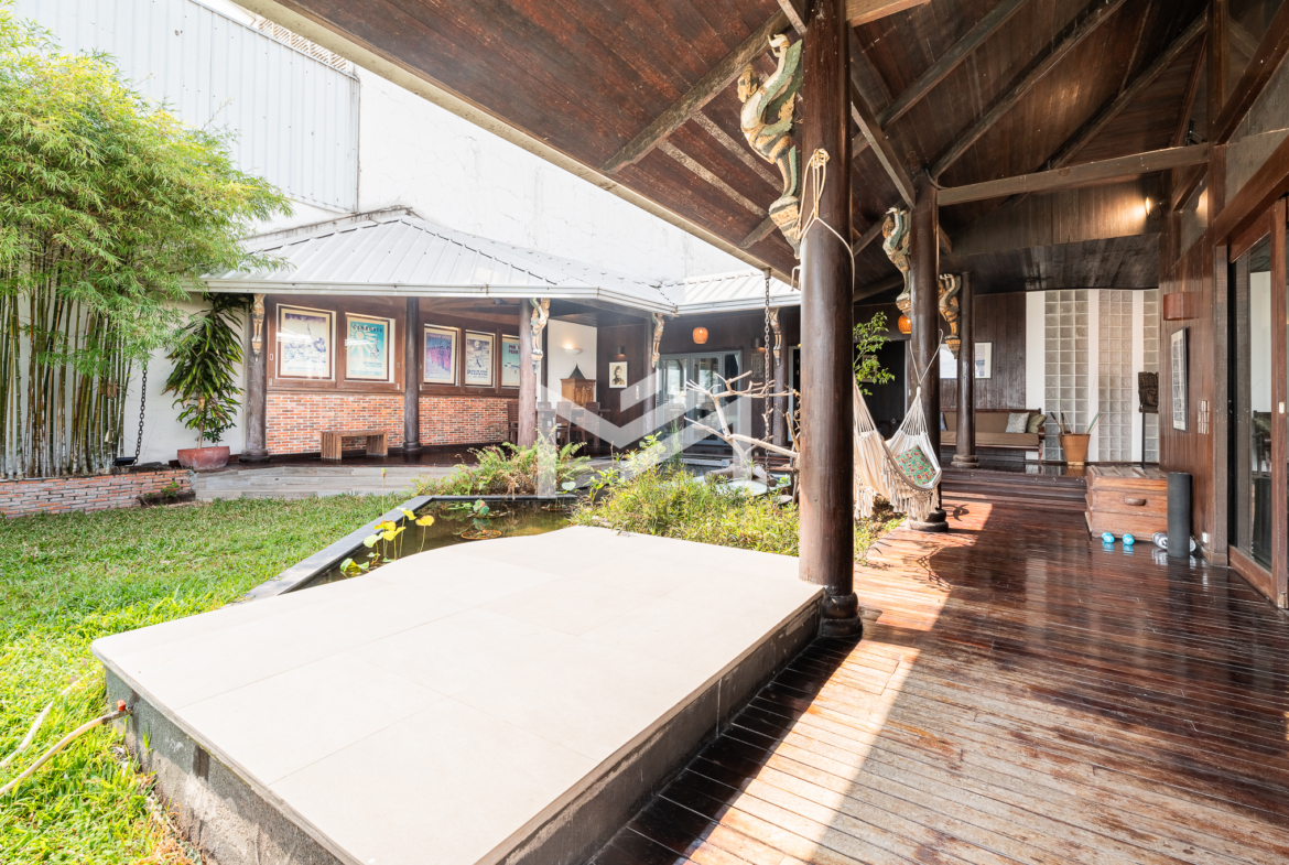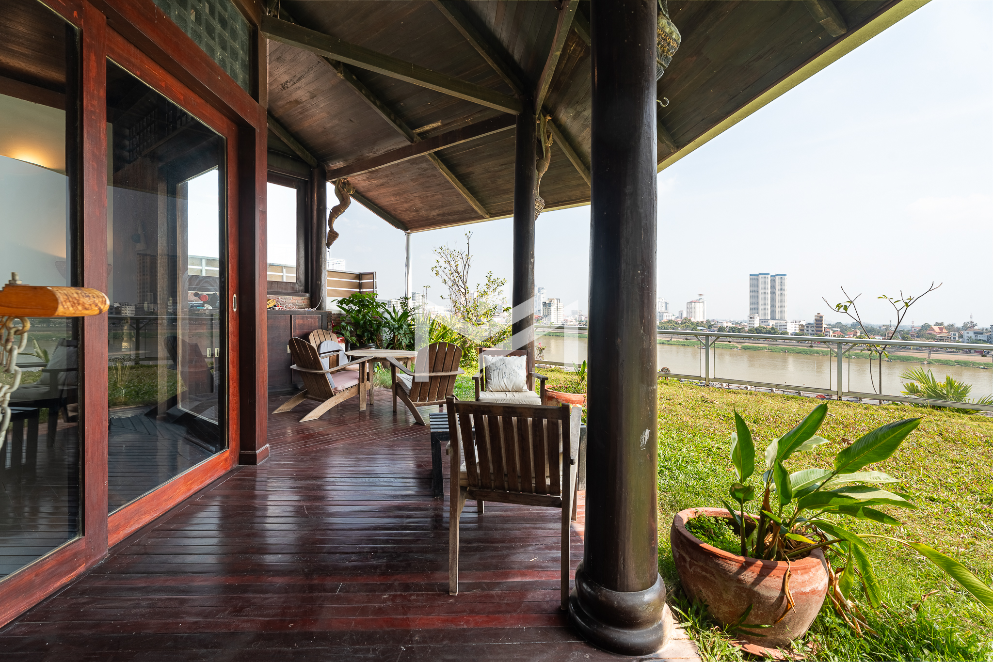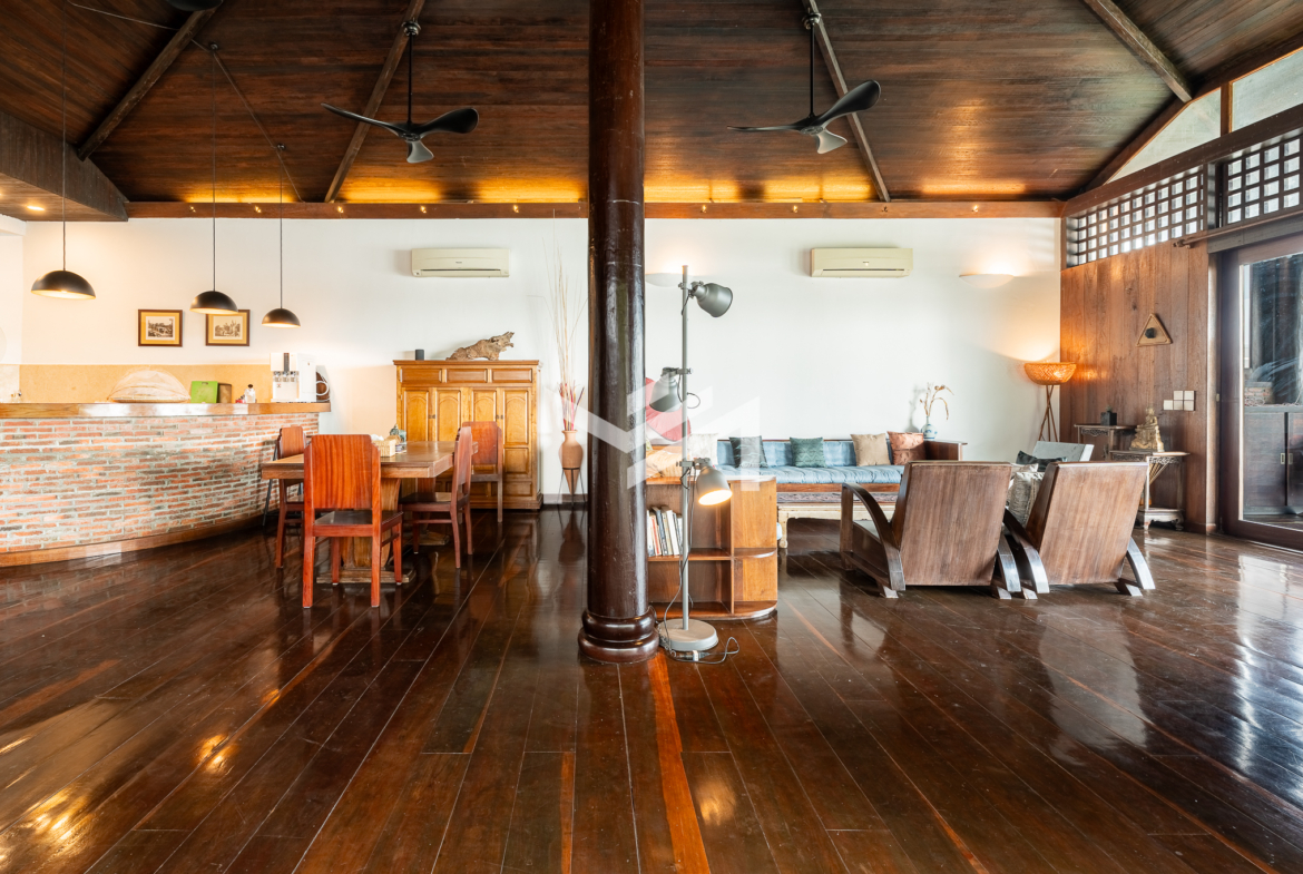 Entrance on the lower floor with a staff room, leading up to an exceptional two-level, 5-bedroom penthouse offering a 16-meter-wide panoramic riverfront view. The residence is beautifully built with extensive use of teak-like hardwood finishes, blending timeless craftsmanship with modern comfort throughout the home. A veranda wraps around the apartment, bordering a large private garden and jacuzzi, creating a rare indoor-outdoor living experience overlooking the river. This historic property, dating back to the 1920s, carries a warm, homey character while being situated in a prime location along Sisowath Quay, within close proximity to the Night Market and key riverside attractions. The building provides 24/7 security and CCTV surveillance, with maintenance services and air-conditioning servicing included, ensuring both comfort and peace of mind for residents seeking a unique heritage living experience in the heart of the city.