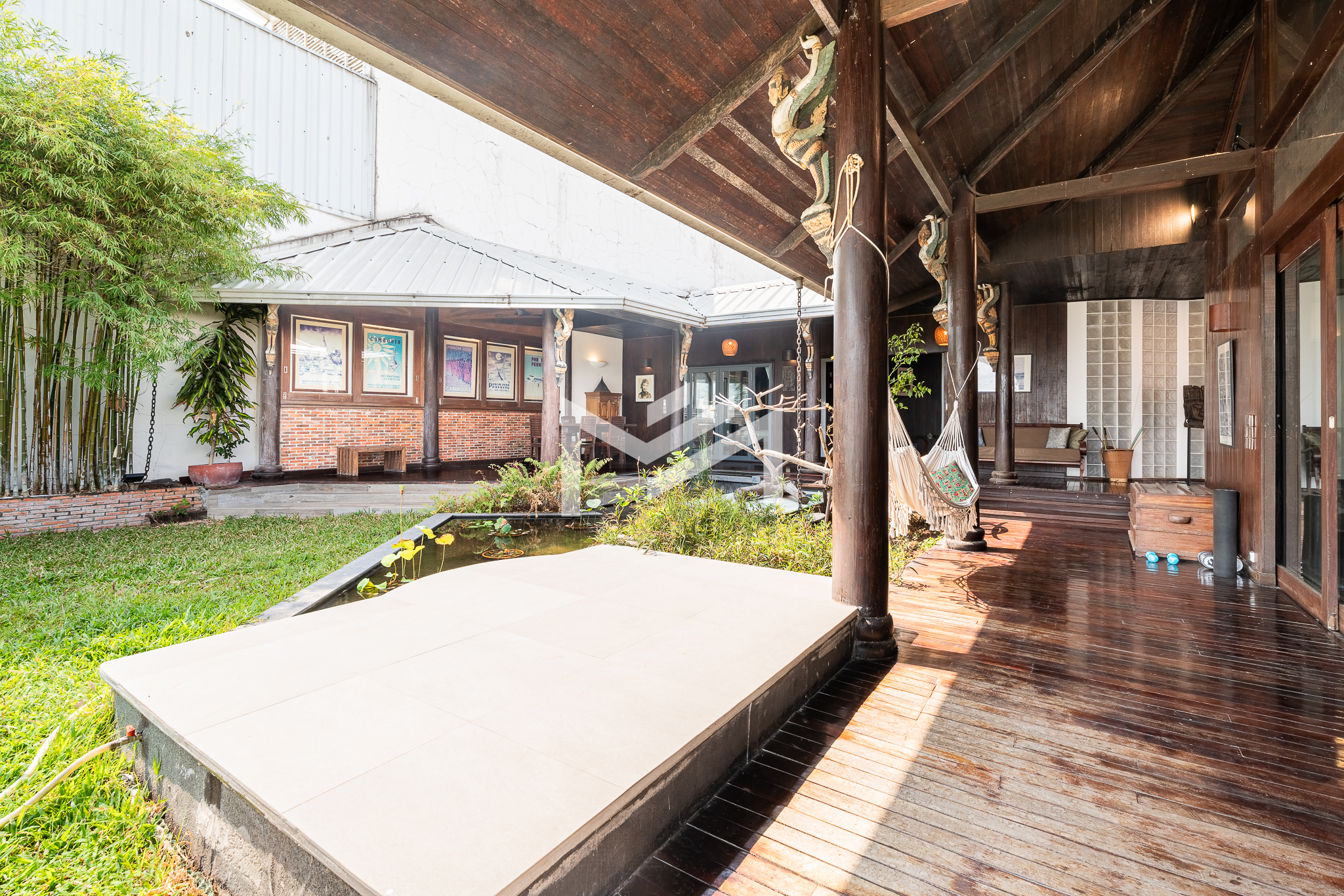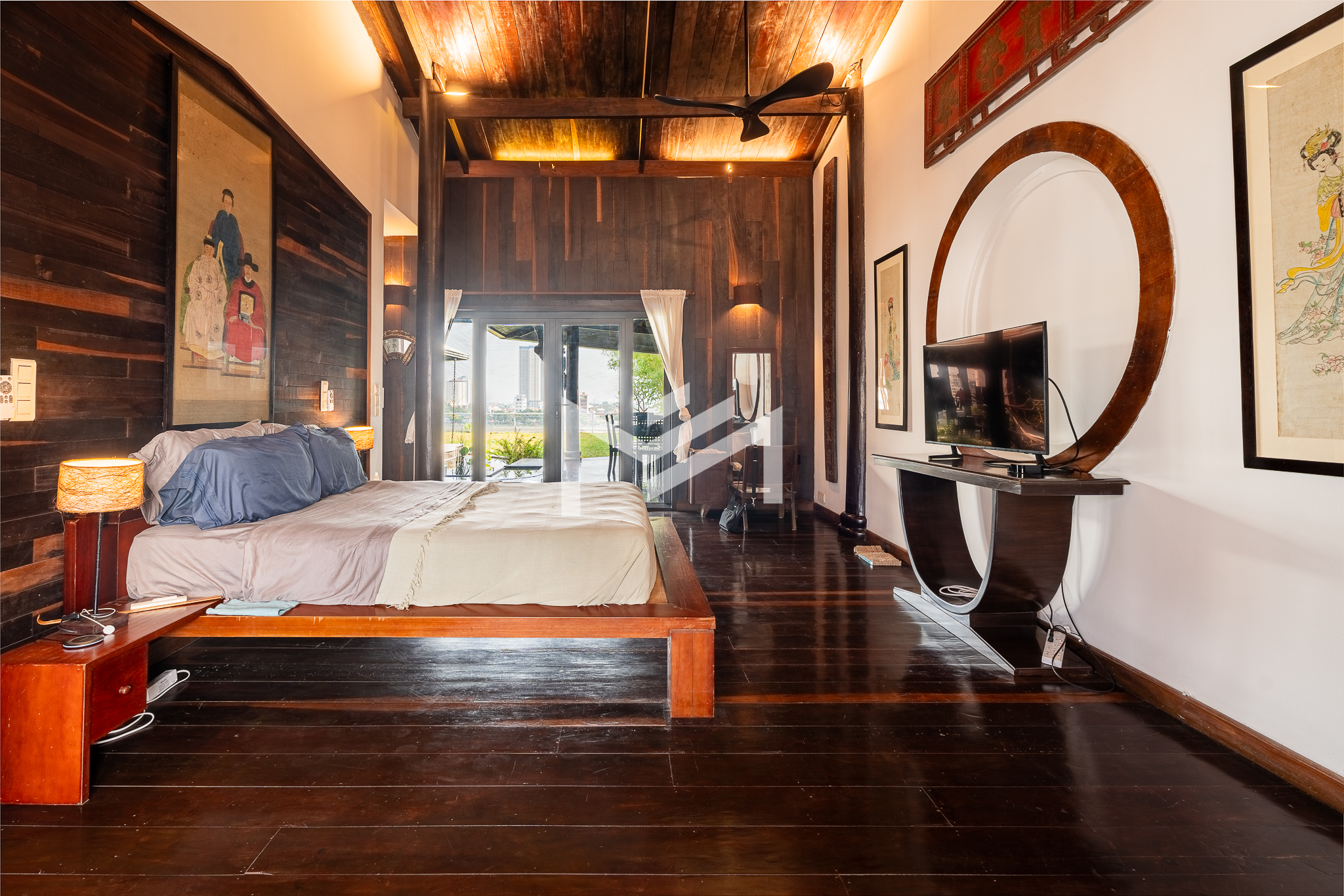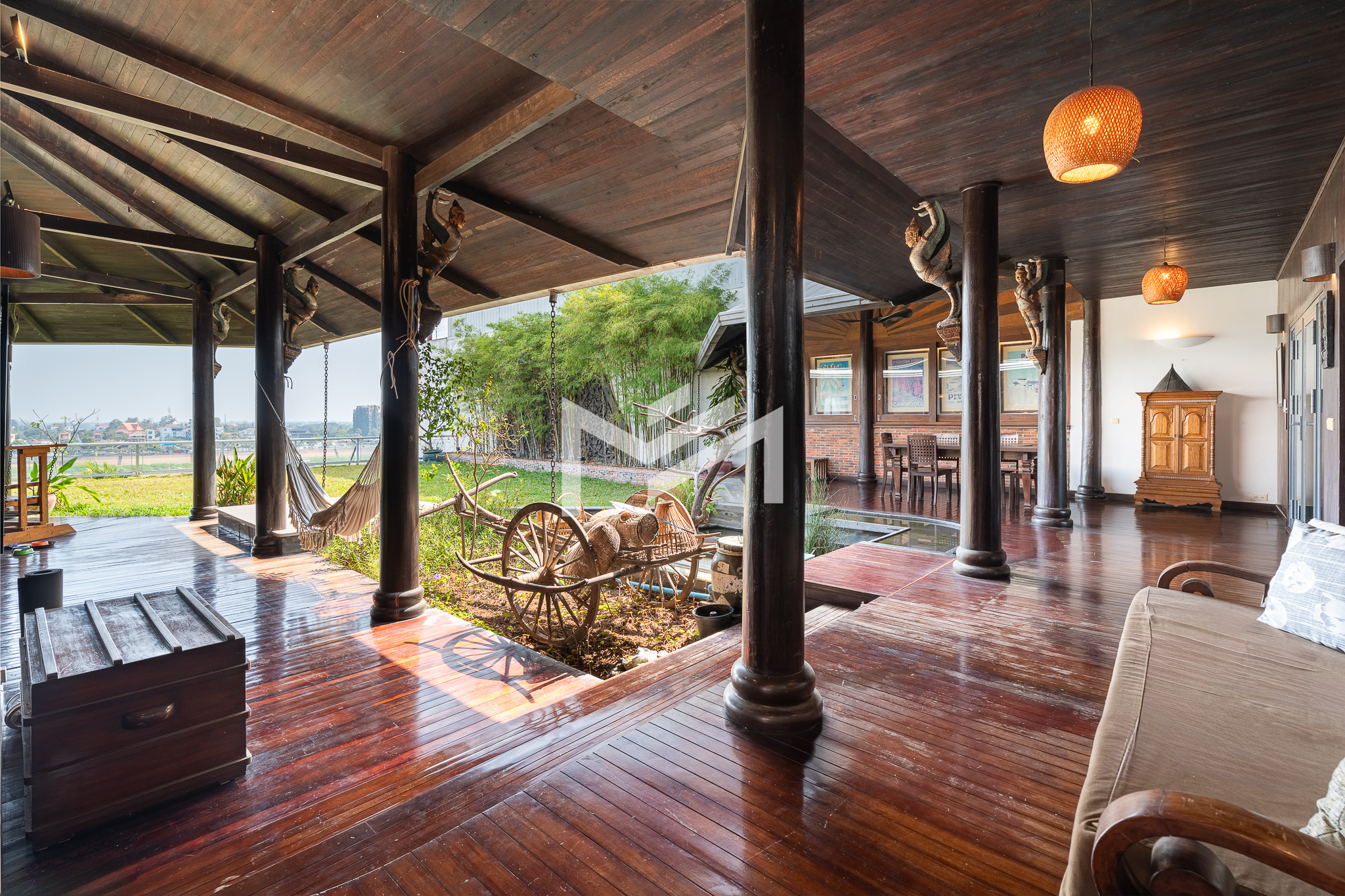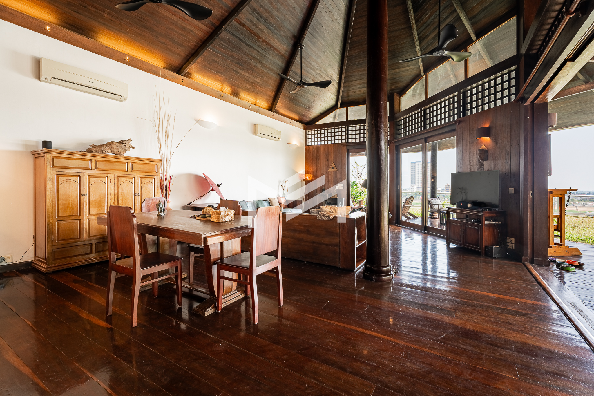 Entrance on the lower floor with a staff room, leading up to an exceptional two-level, 5-bedroom penthouse offering a 16-meter-wide panoramic riverfront view. The residence is beautifully built with extensive use of teak-like hardwood finishes, blending timeless craftsmanship with modern comfort throughout the home. A veranda wraps around the apartment, bordering a large private garden and jacuzzi, creating a rare indoor-outdoor living experience overlooking the river. This historic property, dating back to the 1920s, carries a warm, homey character while being situated in a prime location along Sisowath Quay, within close proximity to the Night Market and key riverside attractions. The building provides 24/7 security and CCTV surveillance, with maintenance services and air-conditioning servicing included, ensuring both comfort and peace of mind for residents seeking a unique heritage living experience in the heart of the city.