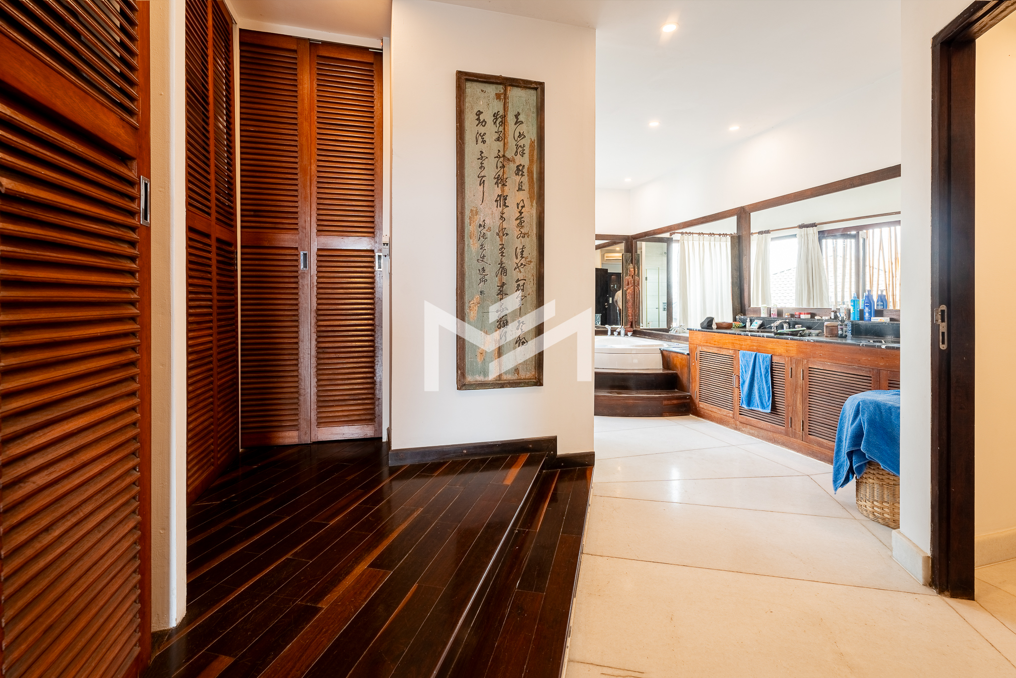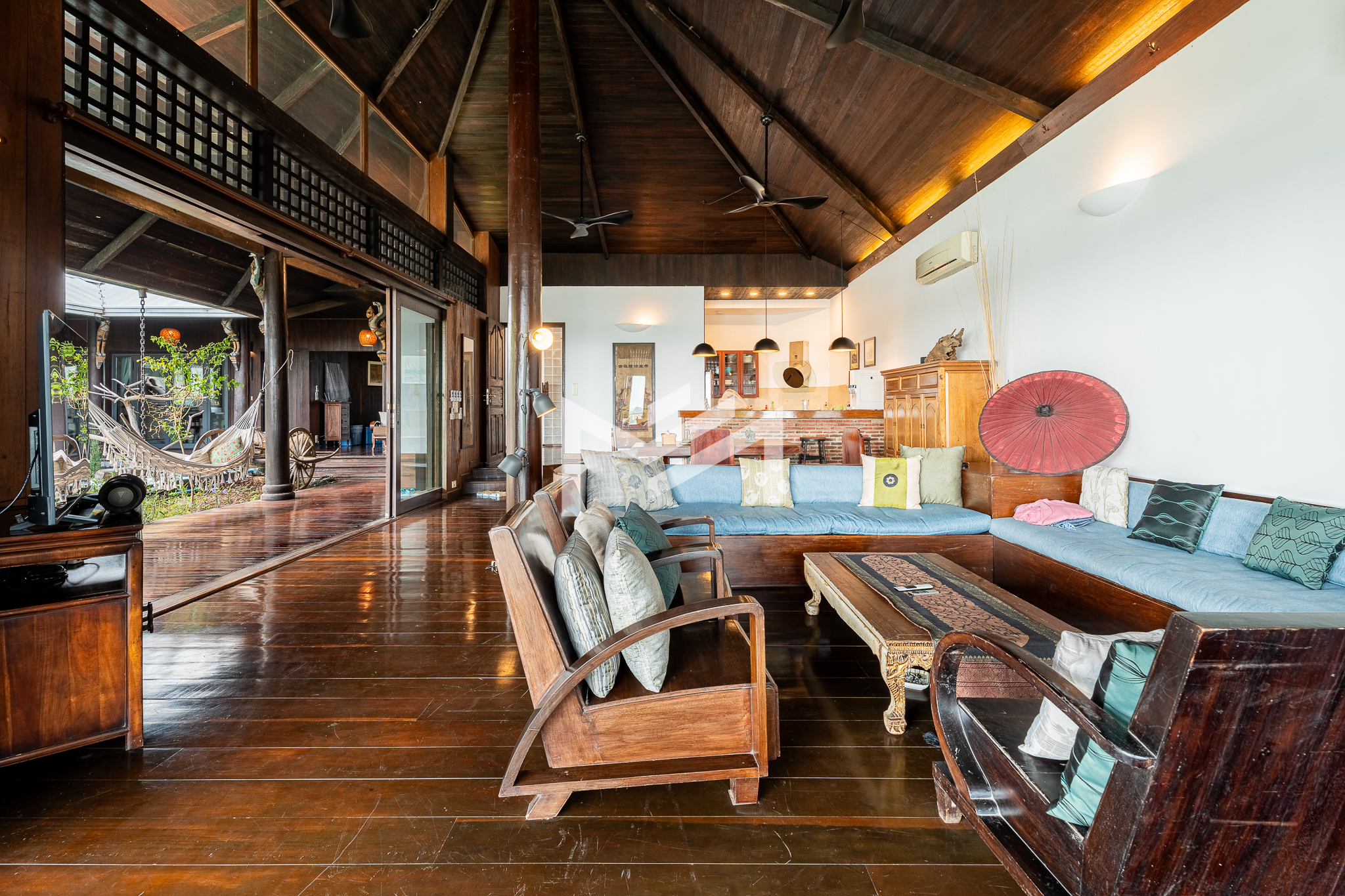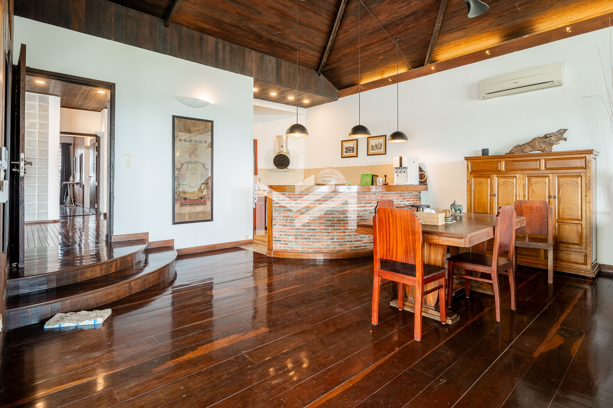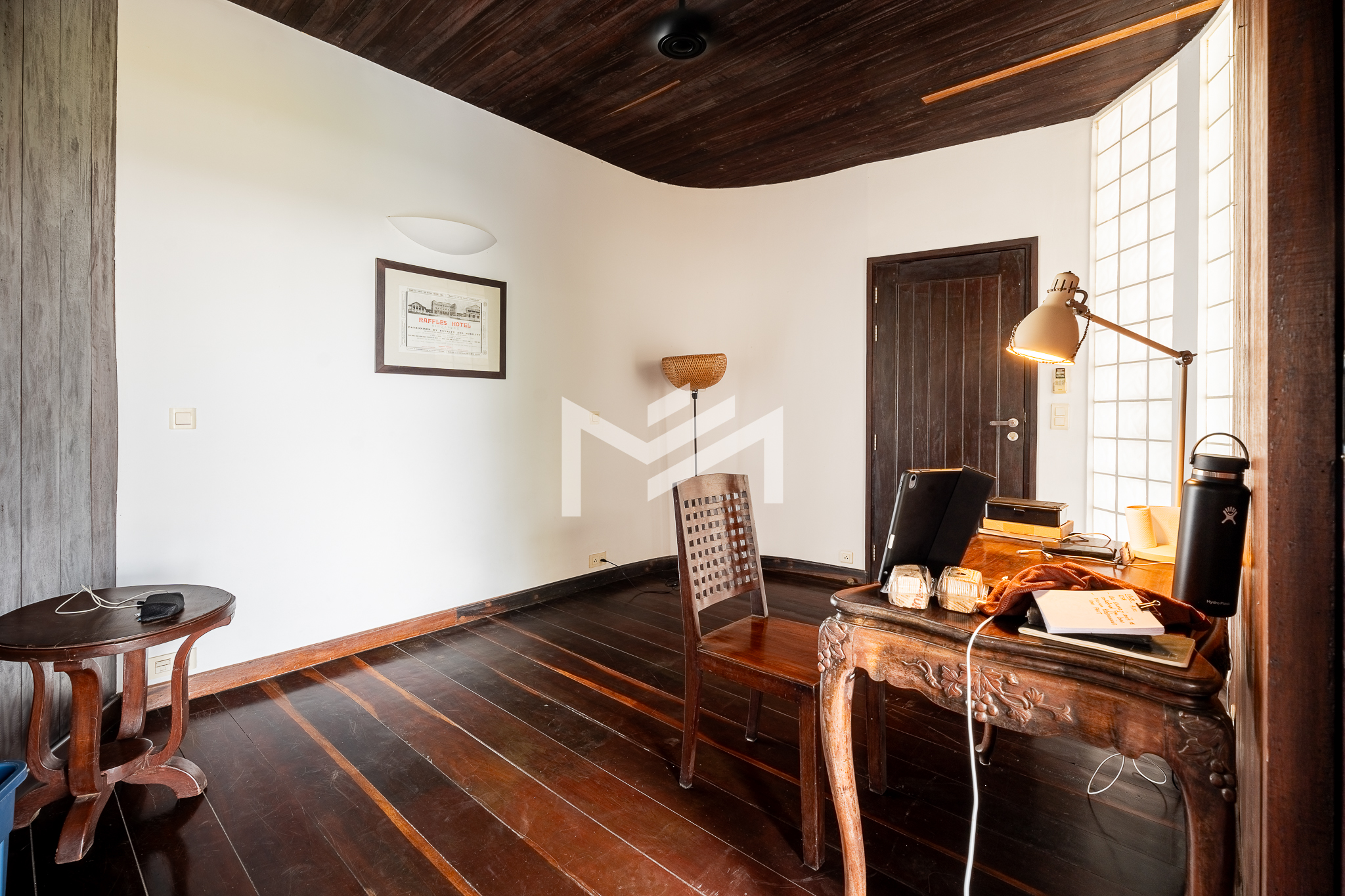 Entrance on the lower floor with a staff room, leading up to an exceptional two-level, 5-bedroom penthouse offering a 16-meter-wide panoramic riverfront view. The residence is beautifully built with extensive use of teak-like hardwood finishes, blending timeless craftsmanship with modern comfort throughout the home. A veranda wraps around the apartment, bordering a large private garden and jacuzzi, creating a rare indoor-outdoor living experience overlooking the river. This historic property, dating back to the 1920s, carries a warm, homey character while being situated in a prime location along Sisowath Quay, within close proximity to the Night Market and key riverside attractions. The building provides 24/7 security and CCTV surveillance, with maintenance services and air-conditioning servicing included, ensuring both comfort and peace of mind for residents seeking a unique heritage living experience in the heart of the city.