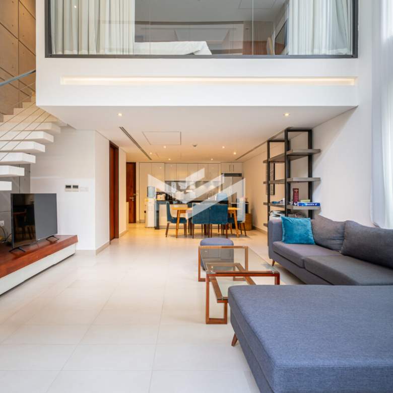 This duplex unit features a smart layout, with both bedrooms on the upper level and a spacious living room, kitchen, and guest toilet on the lower level. Located in a premium area on Street 240, one of the best roads in Phnom Penh, it is near Independence Monument, Riverside, and just 5 minutes from BKK1. The building also houses Enso Café, serving quality Western food, making it a perfect low-rise residence in the area.