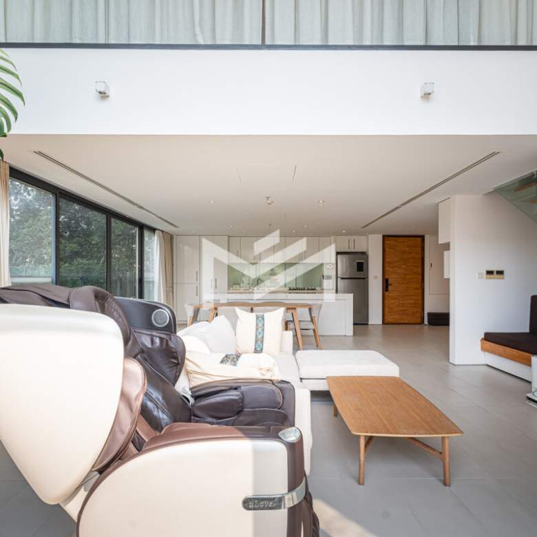 This spacious corner unit offers lush greenery views from its windows, creating a refreshing living environment. The lower floor features a second bedroom, a large kitchen, and ample storage space, while the upper floor boasts a huge master bedroom, a bathroom with scenic views, and a utility room for added convenience.