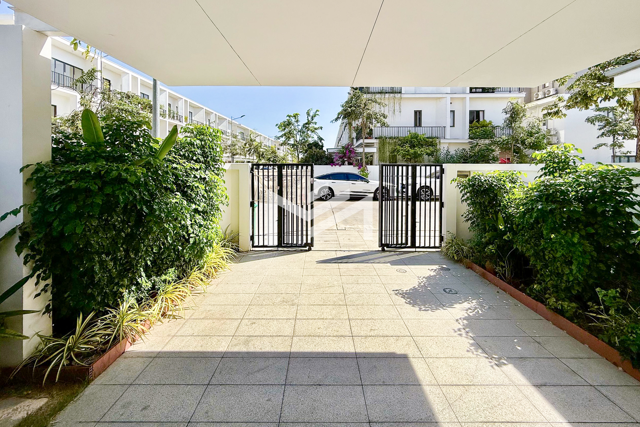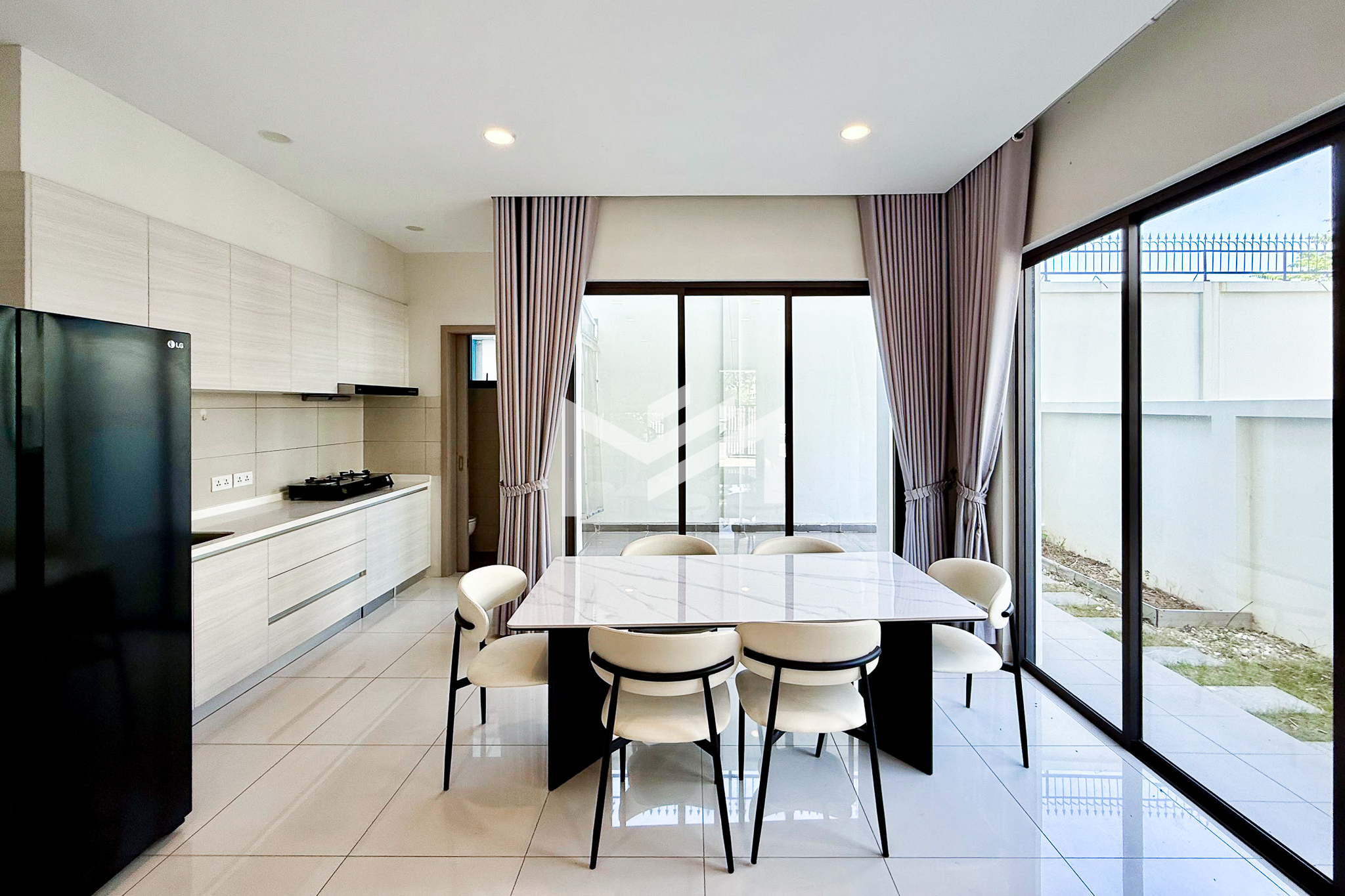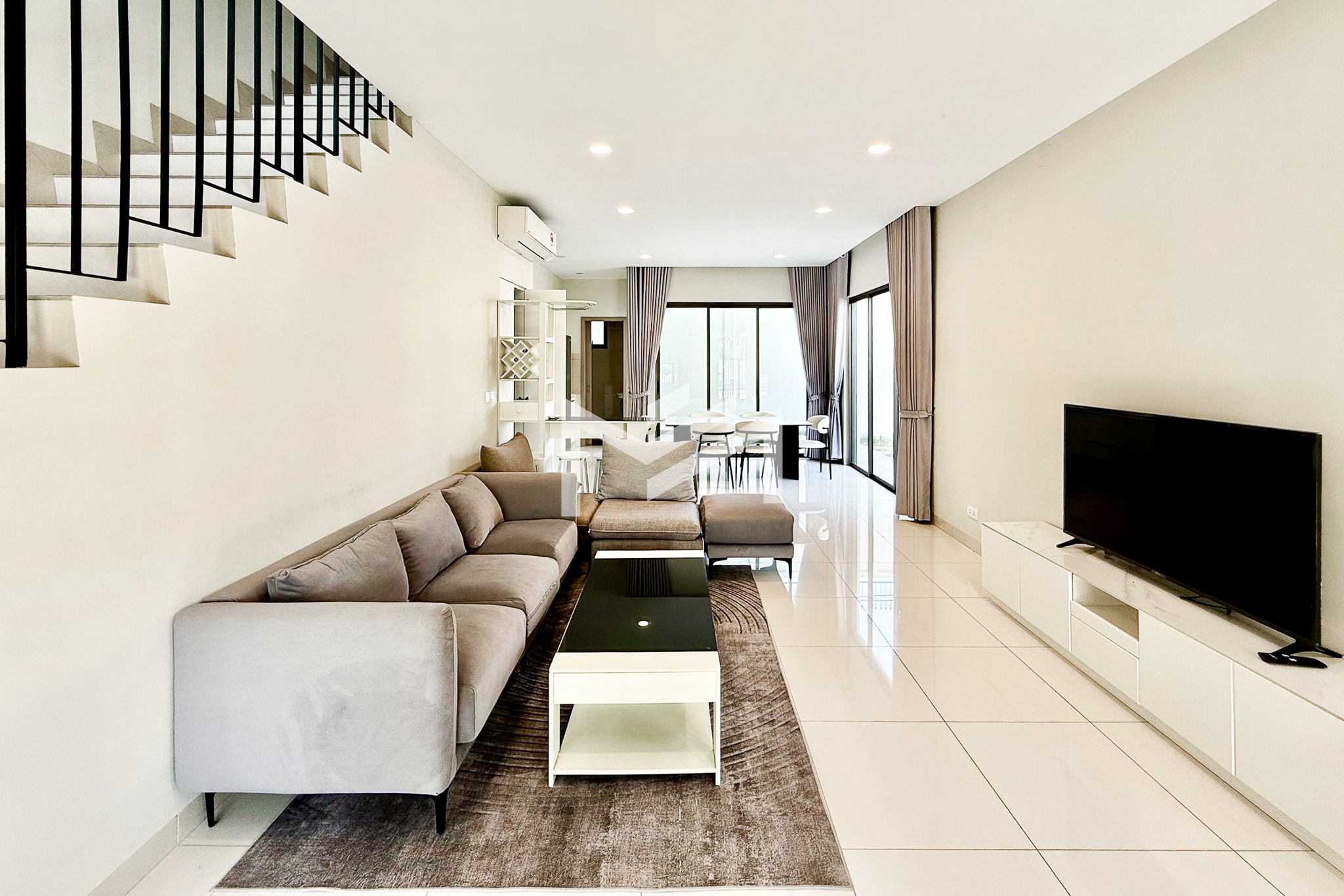 Corner unit with a northeast-facing orientation. The ground floor features a bright living room with an open kitchen, storage space, and a guest toilet. The first floor offers a master bedroom and a family room sharing one bathroom. On the second floor, there are two junior bedrooms sharing one bathroom, along with an additional storage area. Outdoor landscaping provides space for plants, grass, and a small play area. Conveniently located with K-Mall at the entrance of the community, just 5 minutes to AEON Mean Chey and 15 minutes to Techo International Airport.