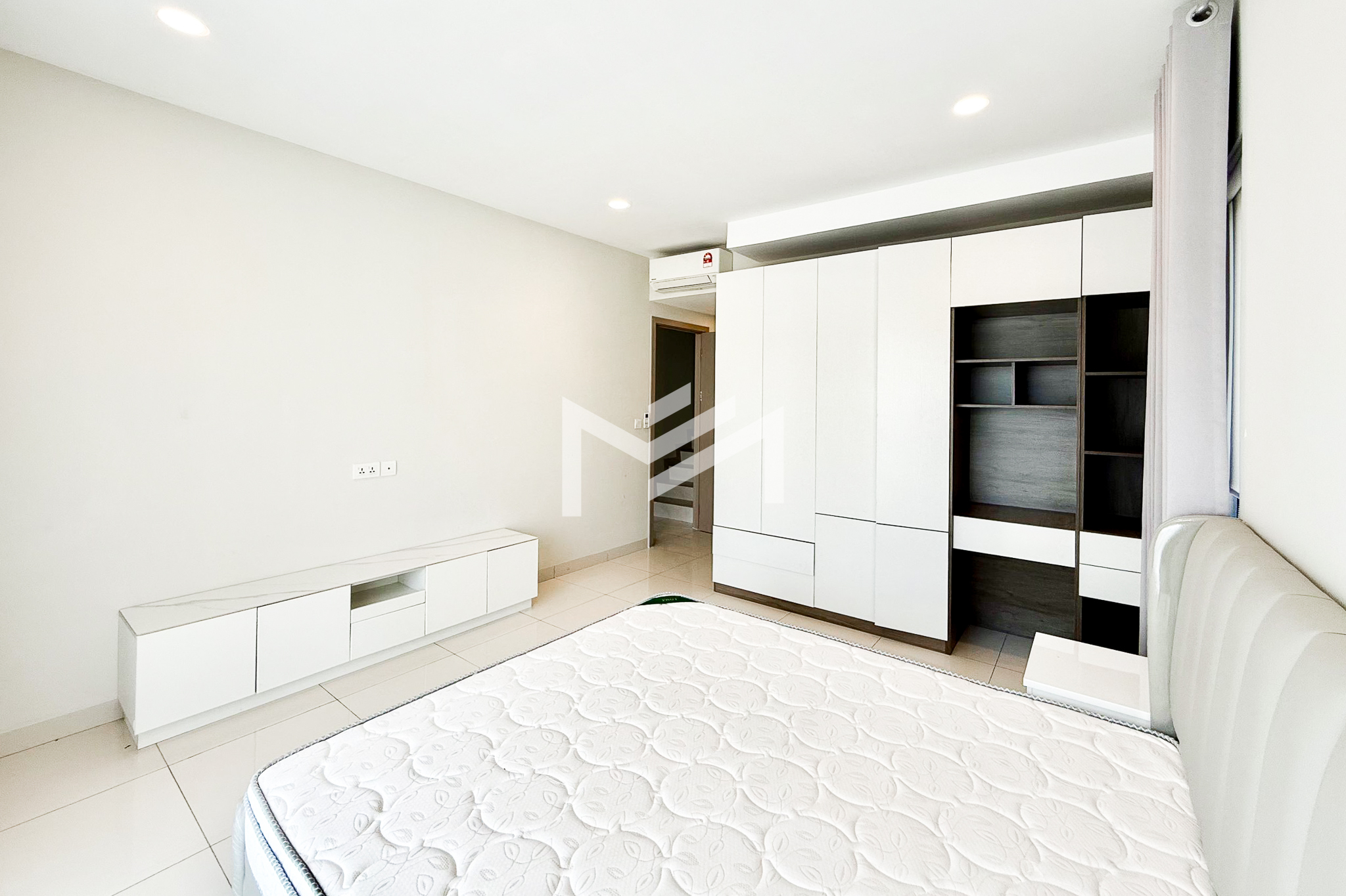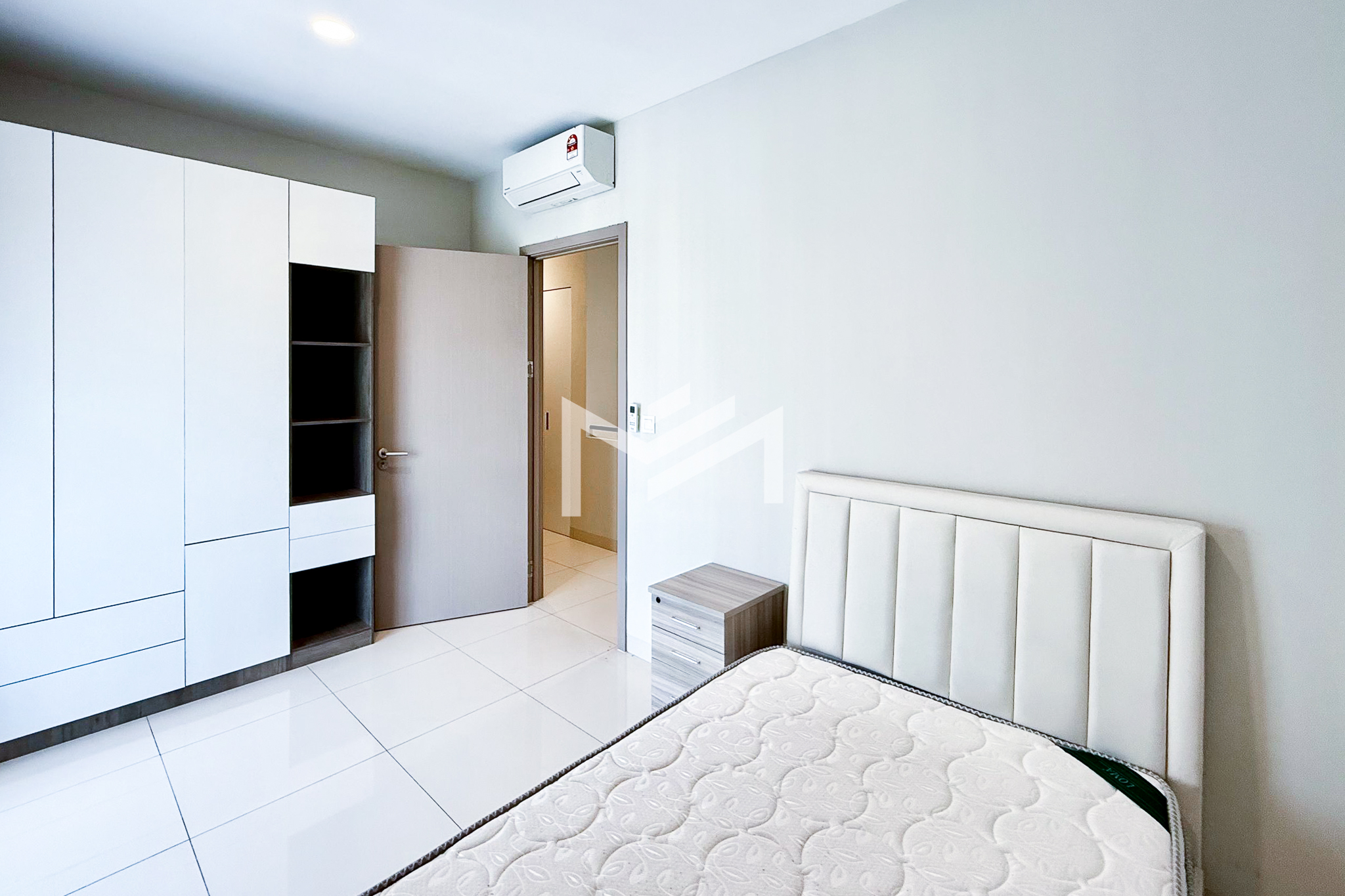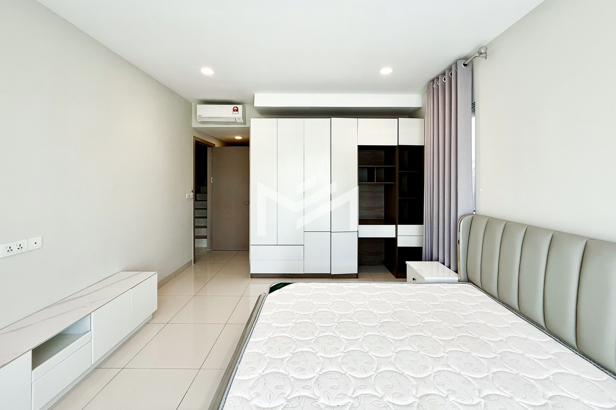 Corner unit with a northeast-facing orientation. The ground floor features a bright living room with an open kitchen, storage space, and a guest toilet. The first floor offers a master bedroom and a family room sharing one bathroom. On the second floor, there are two junior bedrooms sharing one bathroom, along with an additional storage area. Outdoor landscaping provides space for plants, grass, and a small play area. Conveniently located with K-Mall at the entrance of the community, just 5 minutes to AEON Mean Chey and 15 minutes to Techo International Airport.