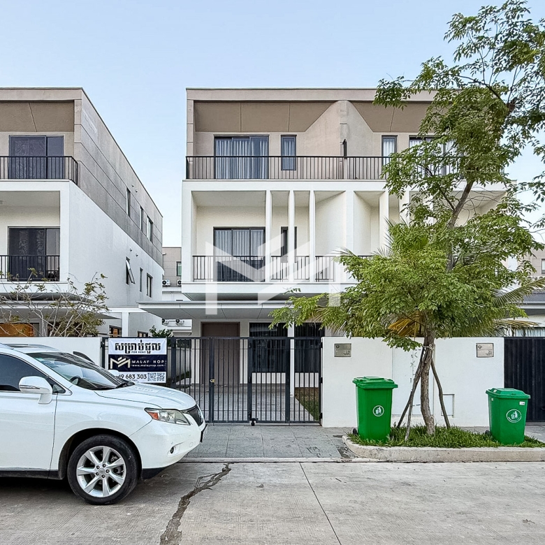 This spacious twin villa offers four bedrooms, each with an attached bathroom. The property is nearly fully furnished, with every bedroom equipped with a wardrobe, bed, and mattress. On the ground floor, you’ll find a guest toilet, storage space, a closed kitchen, and a helper room. A mini garden about two meters wide adds a touch of greenery. Located in a beautiful compound of over 300 homes, the property features a large shared garden and 24-hour security. It’s approximately 15KM from the BKK1 area, making it a peaceful yet convenient choice for families or individuals seeking a comfortable residence outside the busy city center.