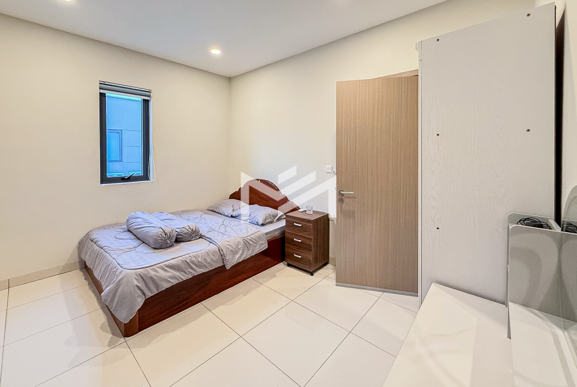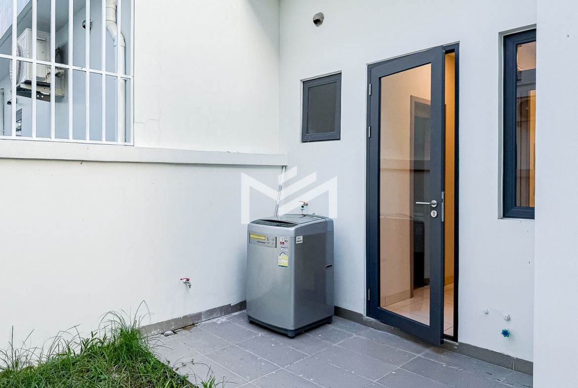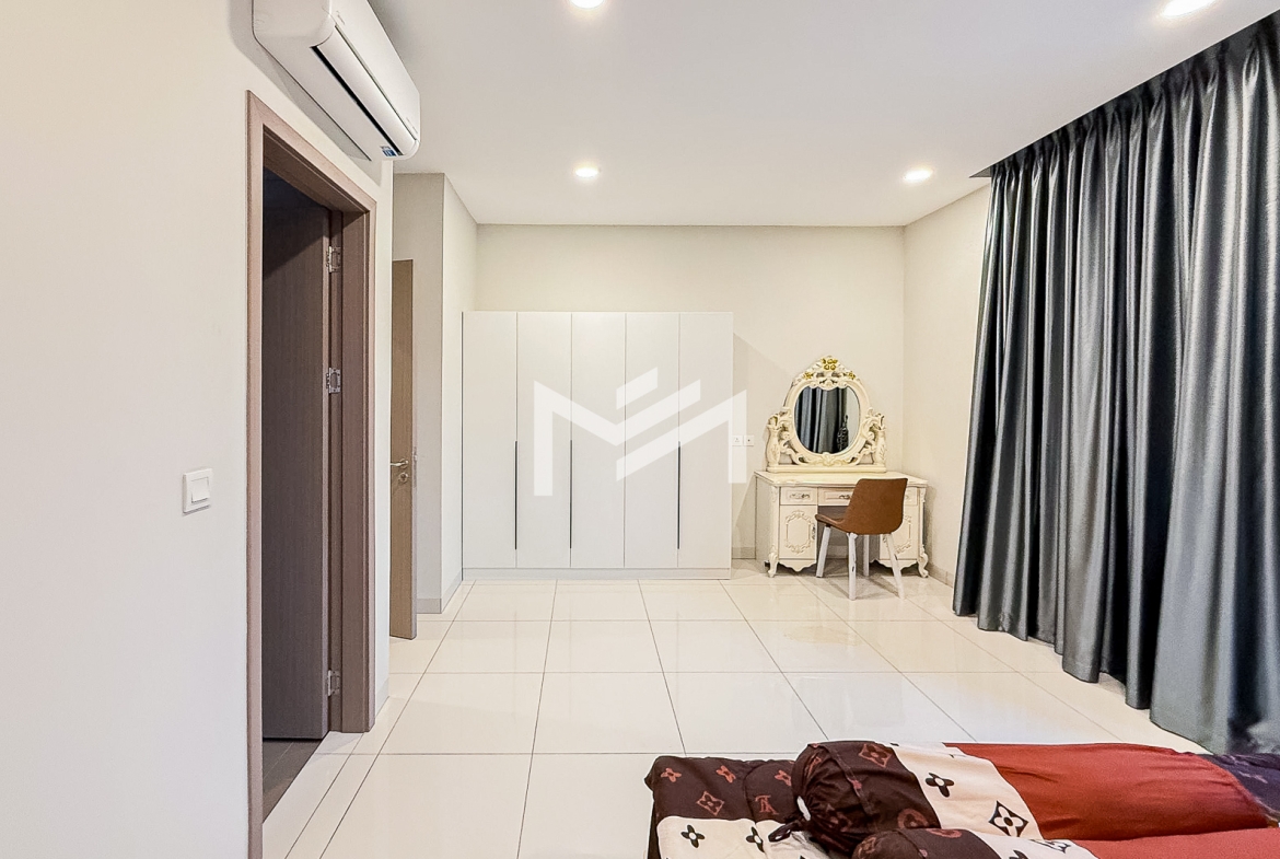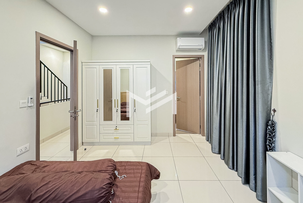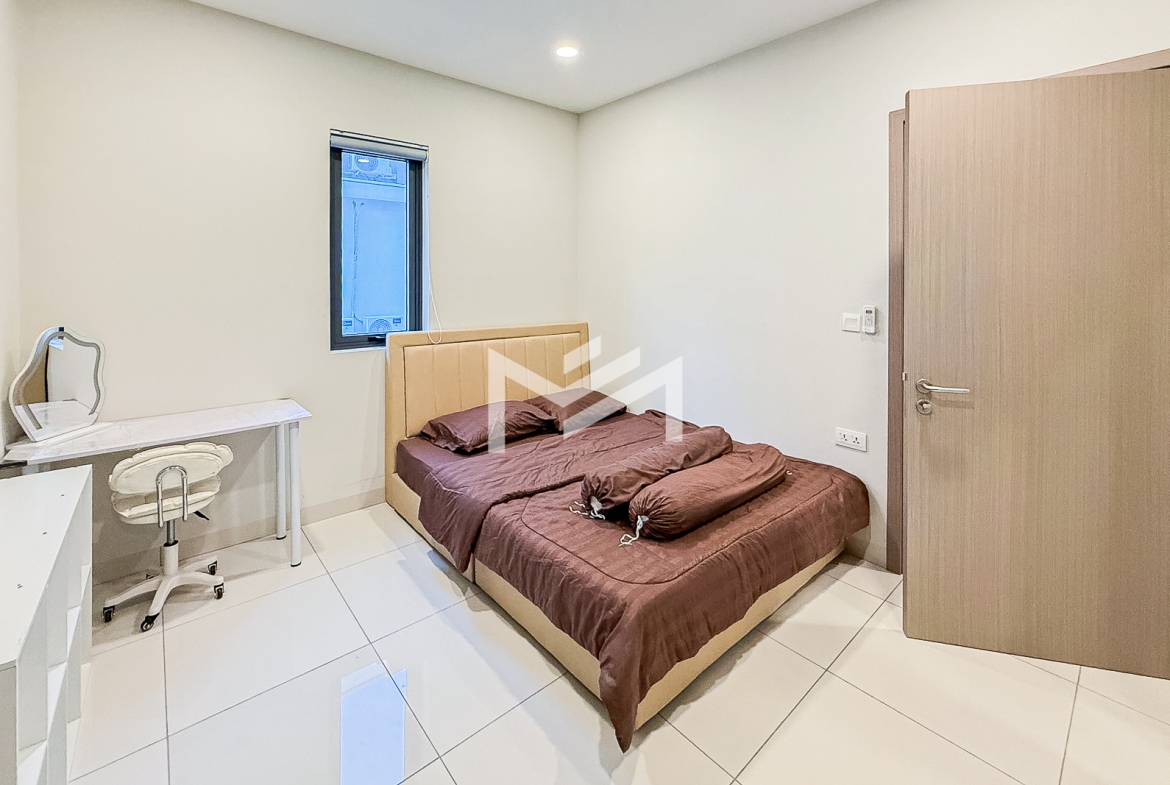 This spacious twin villa offers four bedrooms, each with an attached bathroom. The property is nearly fully furnished, with every bedroom equipped with a wardrobe, bed, and mattress. On the ground floor, you’ll find a guest toilet, storage space, a closed kitchen, and a helper room. A mini garden about two meters wide adds a touch of greenery. Located in a beautiful compound of over 300 homes, the property features a large shared garden and 24-hour security. It’s approximately 15KM from the BKK1 area, making it a peaceful yet convenient choice for families or individuals seeking a comfortable residence outside the busy city center.