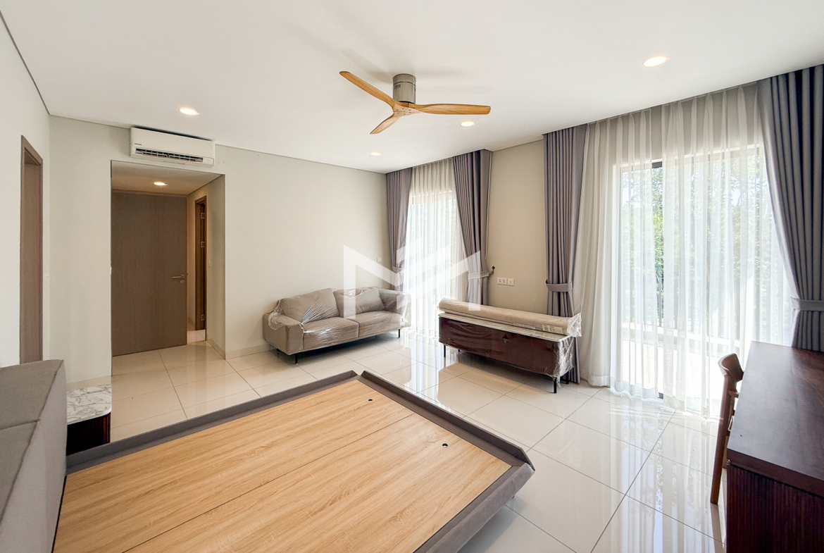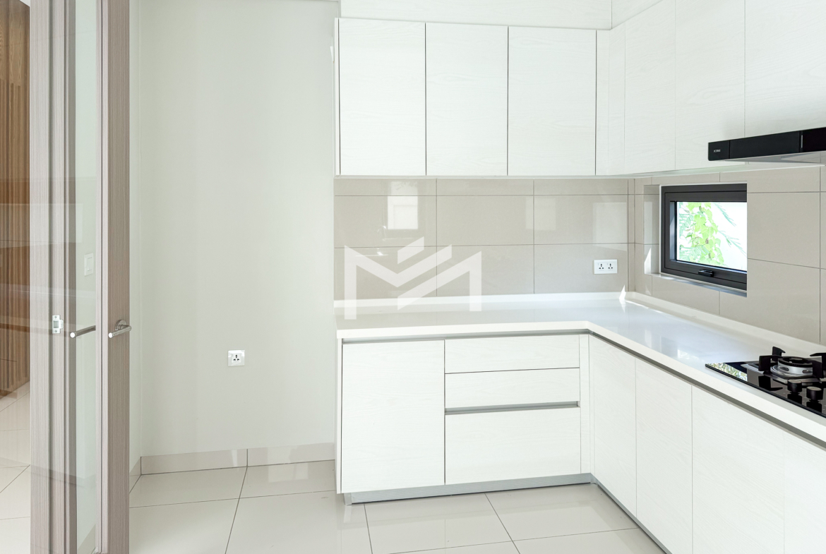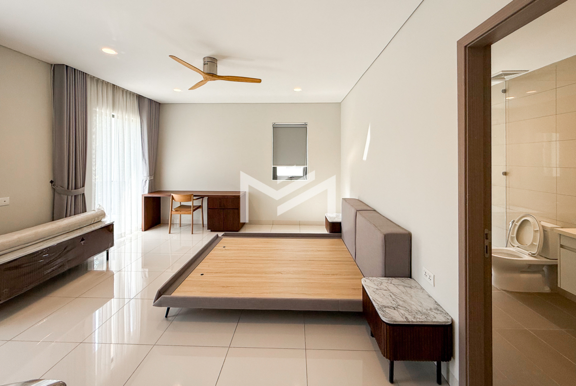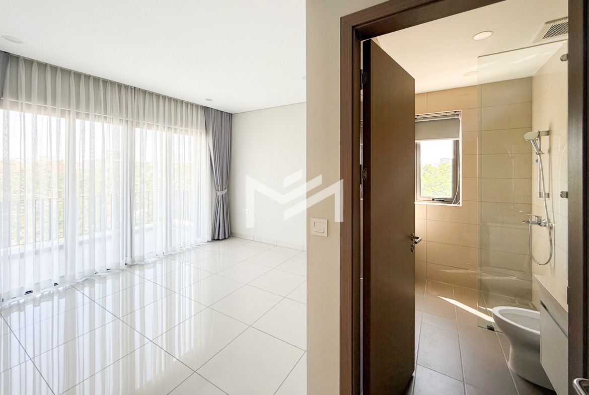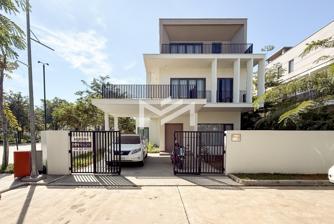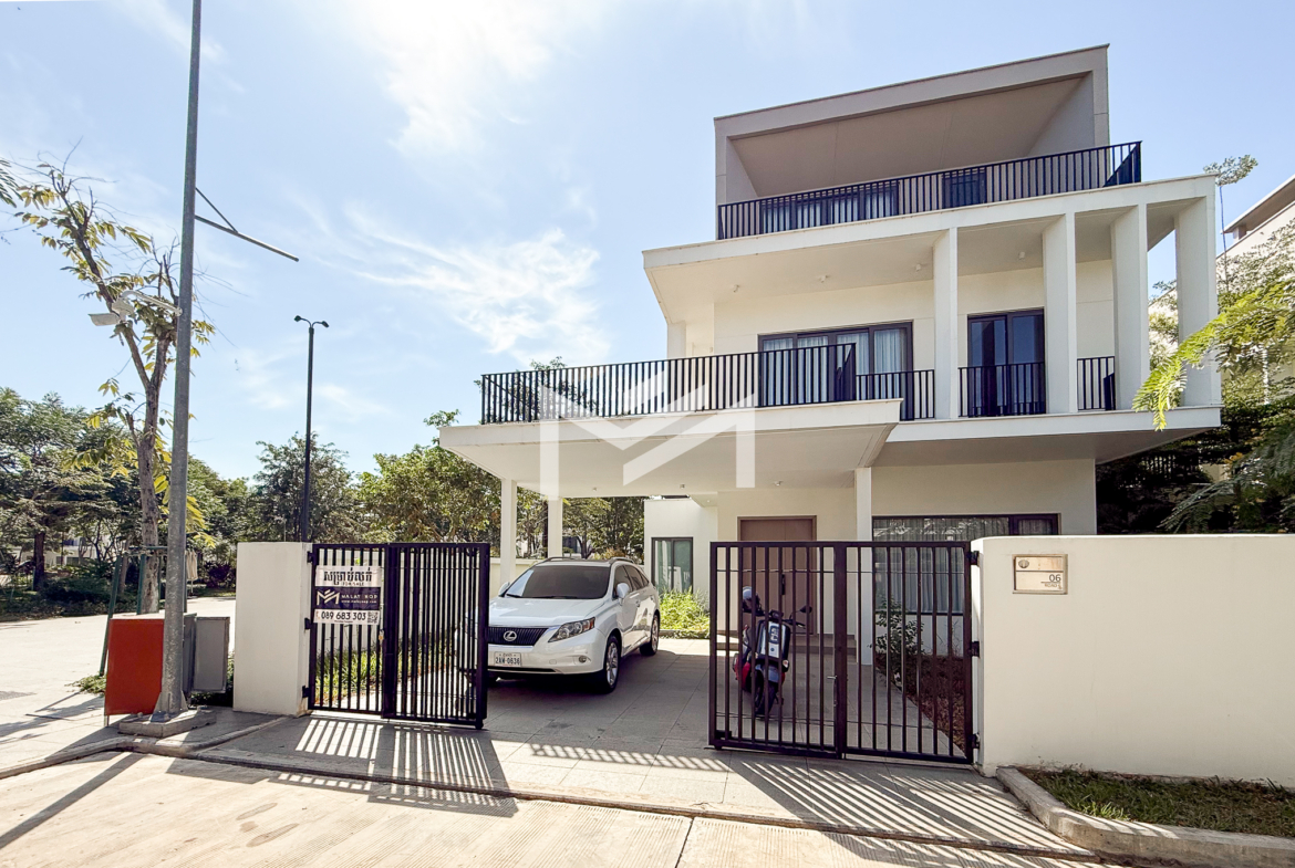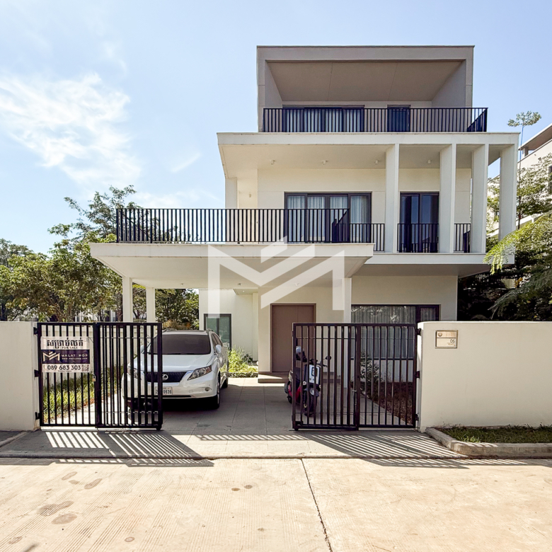 North-east facing, brand-new house with beautiful Central Park views, located in a secure and well-maintained gated community. The ground floor features a spacious living room, a guest room, a guest bathroom, a closed kitchen, a storage room, and a guest toilet. An external helper’s room with its own bathroom is also provided for added convenience. The first and second floors each offer two ensuite bedrooms, providing comfort and privacy for family members. The master bedroom on the first floor includes a huge private terrace overlooking Central Park, creating a perfect space for relaxation. Ideally located in a comfortable gated community, just 5 minutes from AEON Mall Mean Chey (AEON 3), 15 minutes to Techo International Airport, and only a 2-minute walk to K-Mall Prek Thnot, which is conveniently situated right at the entrance of the community. The property benefits from 24-hour security, making it an excellent choice for family living.