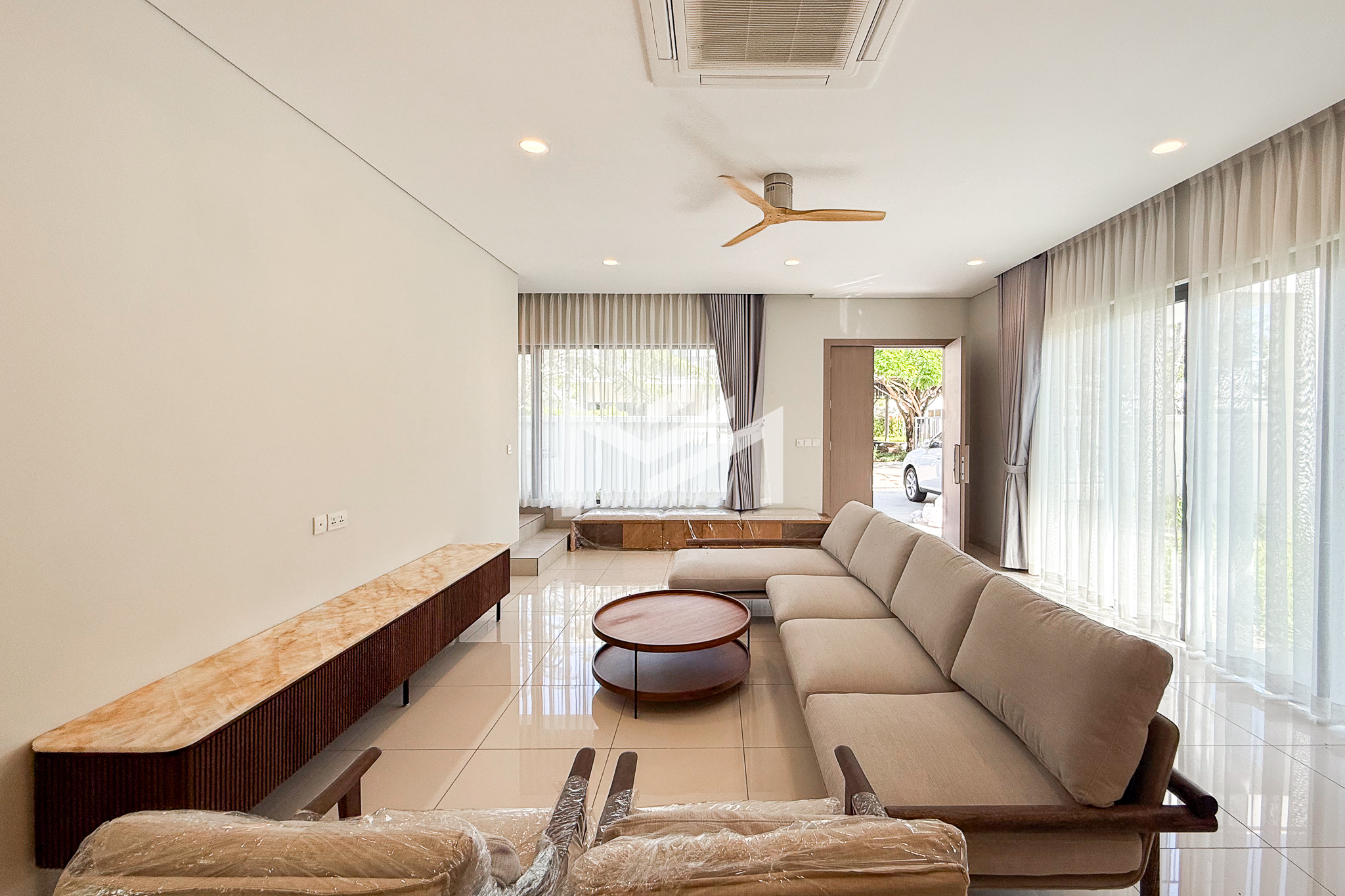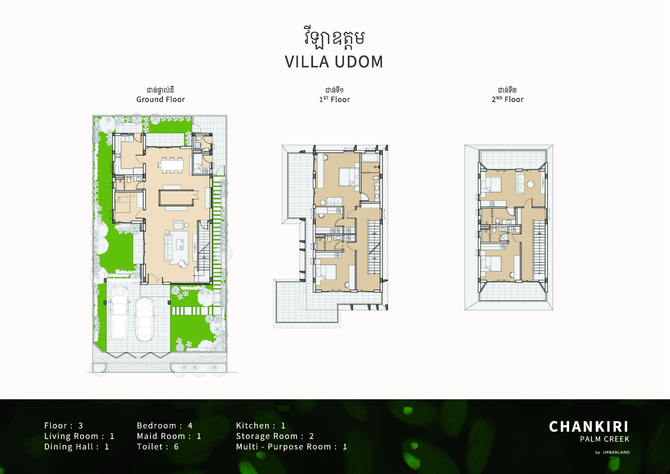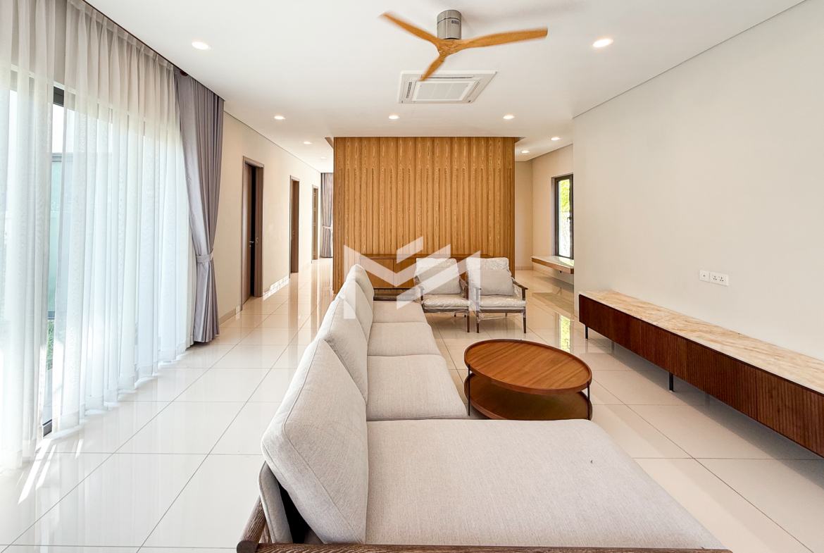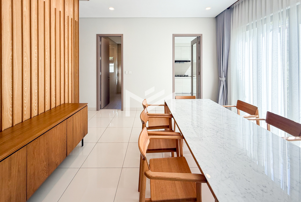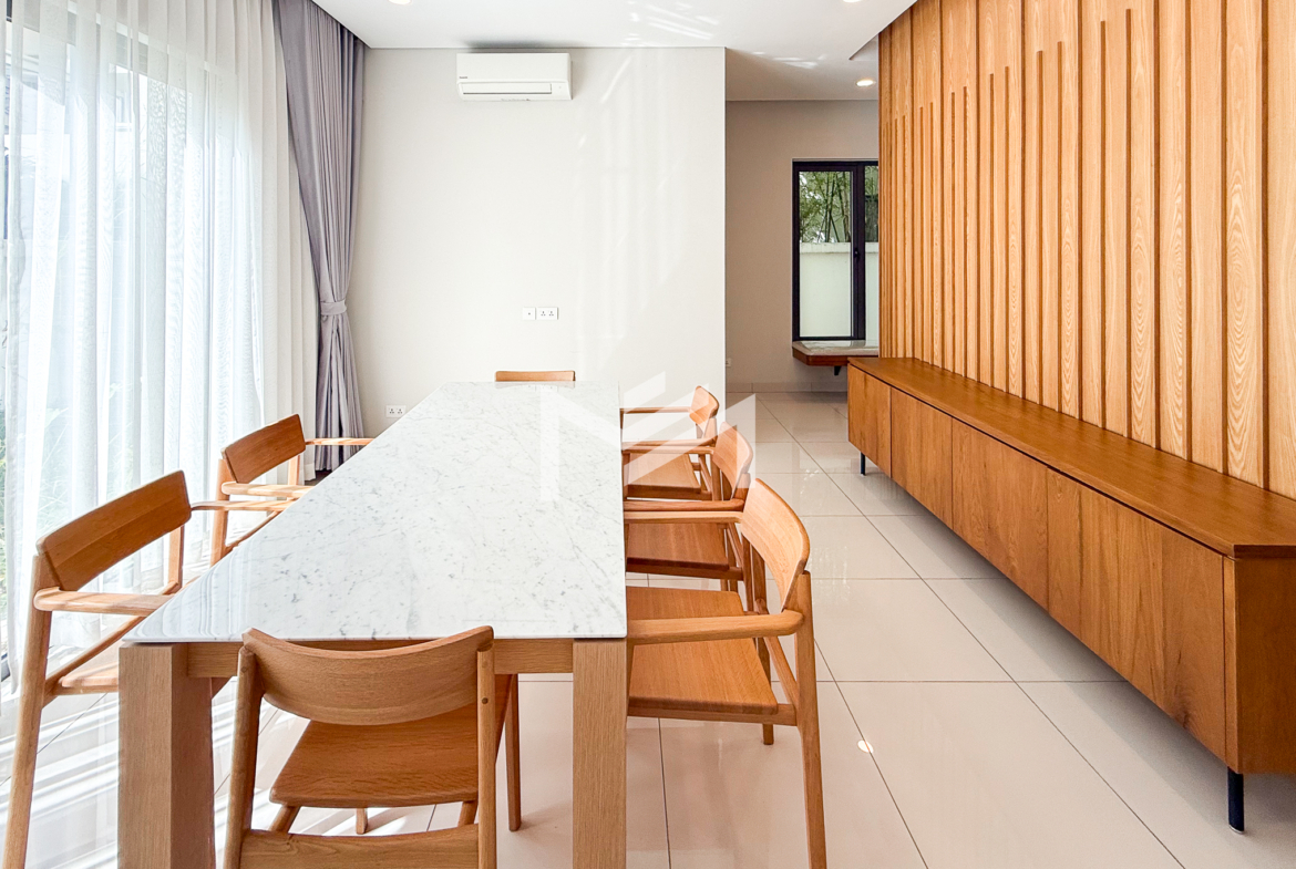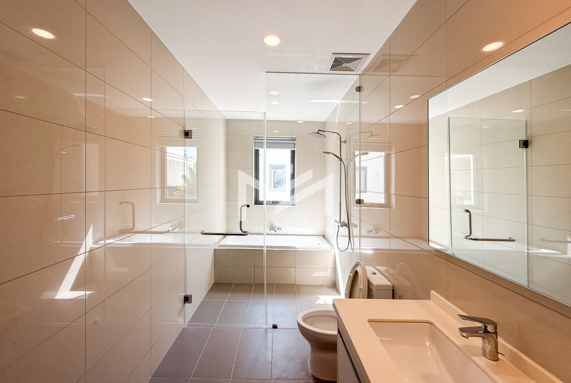 North-east facing, brand-new house with beautiful Central Park views, located in a secure and well-maintained gated community. The ground floor features a spacious living room, a guest room, a guest bathroom, a closed kitchen, a storage room, and a guest toilet. An external helper’s room with its own bathroom is also provided for added convenience. The first and second floors each offer two ensuite bedrooms, providing comfort and privacy for family members. The master bedroom on the first floor includes a huge private terrace overlooking Central Park, creating a perfect space for relaxation. Ideally located in a comfortable gated community, just 5 minutes from AEON Mall Mean Chey (AEON 3), 15 minutes to Techo International Airport, and only a 2-minute walk to K-Mall Prek Thnot, which is conveniently situated right at the entrance of the community. The property benefits from 24-hour security, making it an excellent choice for family living.