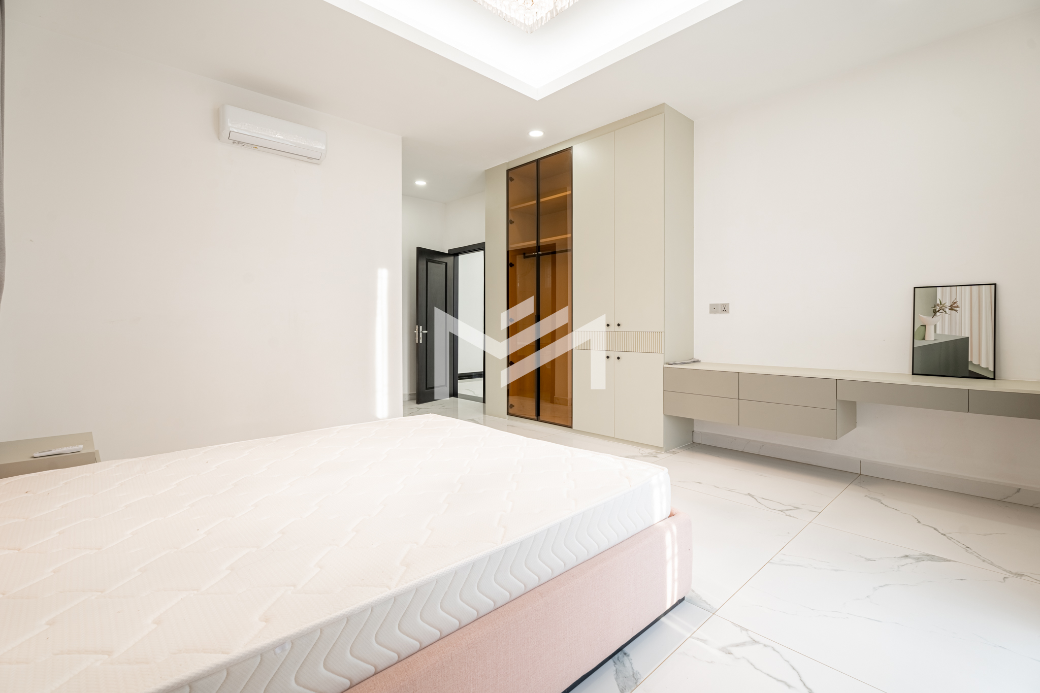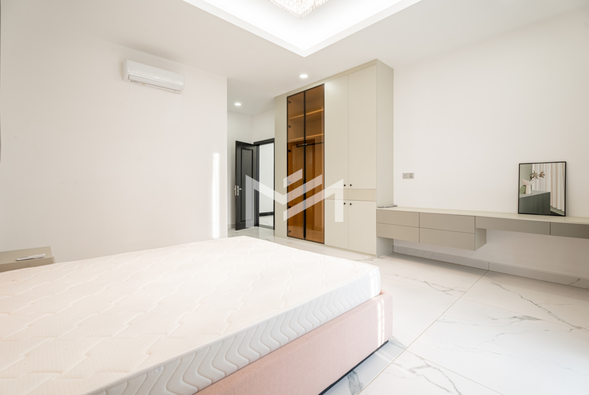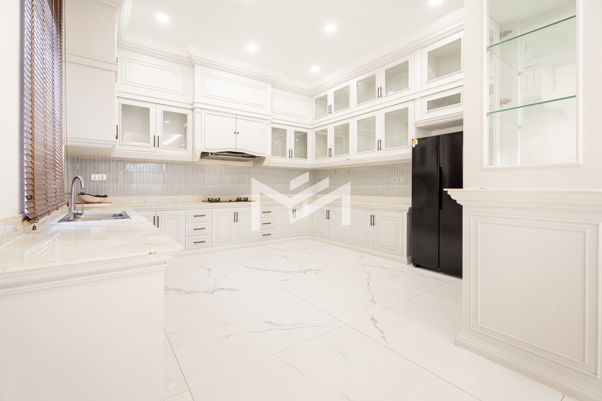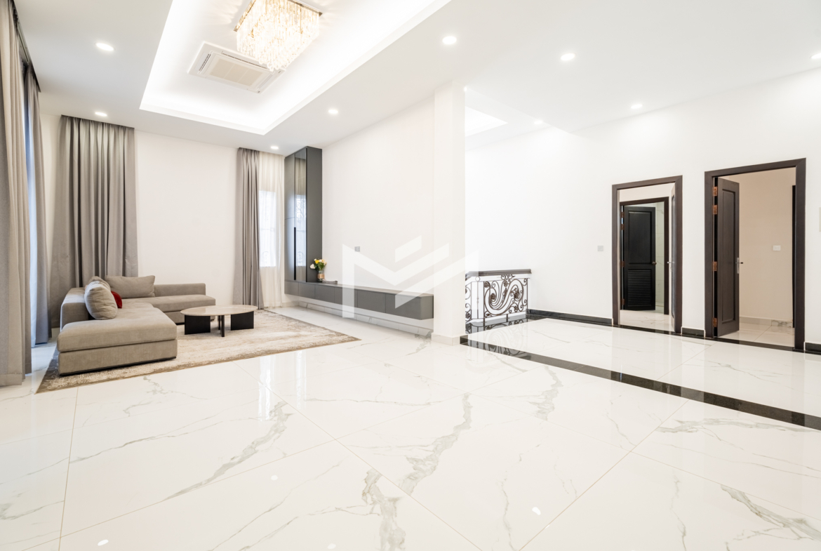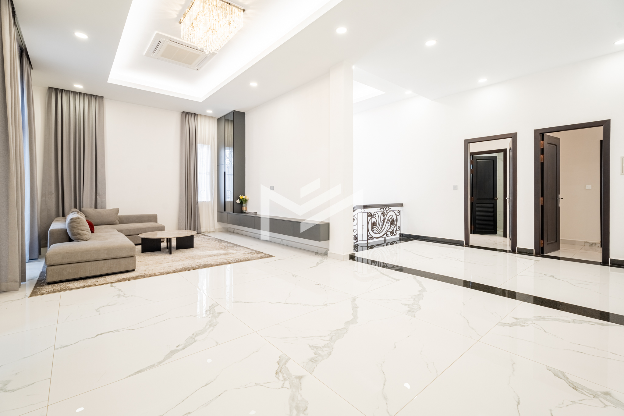 Luxury King Villa for rent in a secured gated community in the north of Phnom Penh, close to AEON Mall 2 and the Ministry of Land. This elegant villa is fully furnished with premium, high-quality furniture and is completely ready to move in. The neighborhood offers 24-hour security, green parks and a peaceful environment suitable for both families and professionals. The location is highly convenient, only about 15 minutes from the Toul Kork area, with easy access to schools, shopping and main roads. Spacious and comfortable, this property is ideal for group sharing or a large family looking for a luxurious home in a safe and well-managed community.