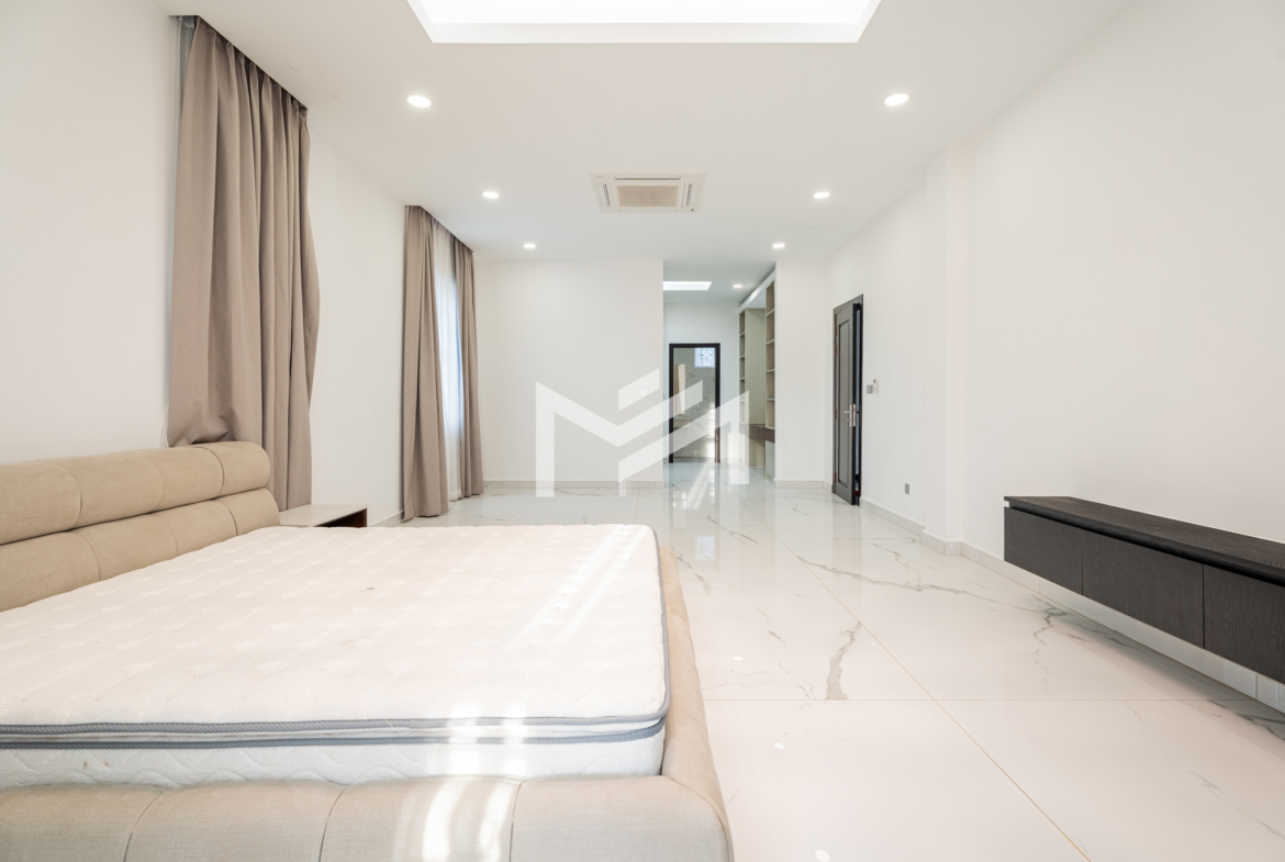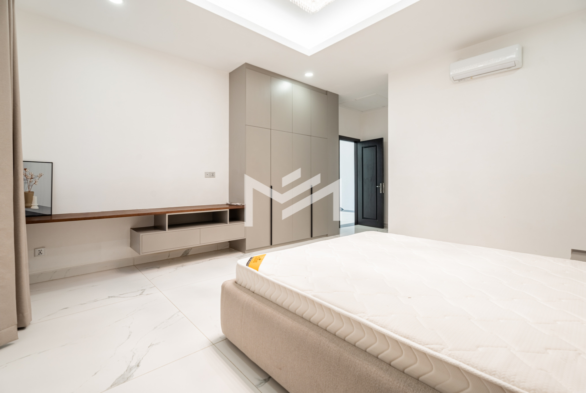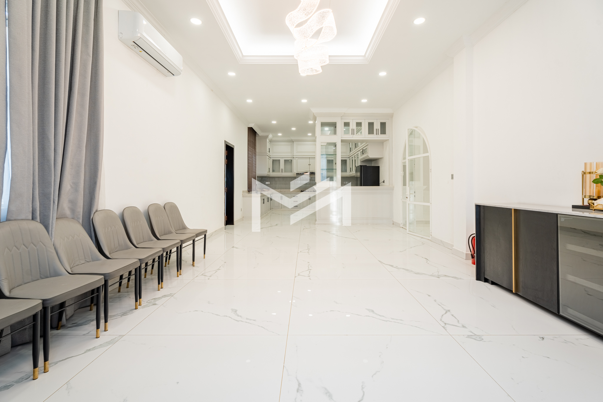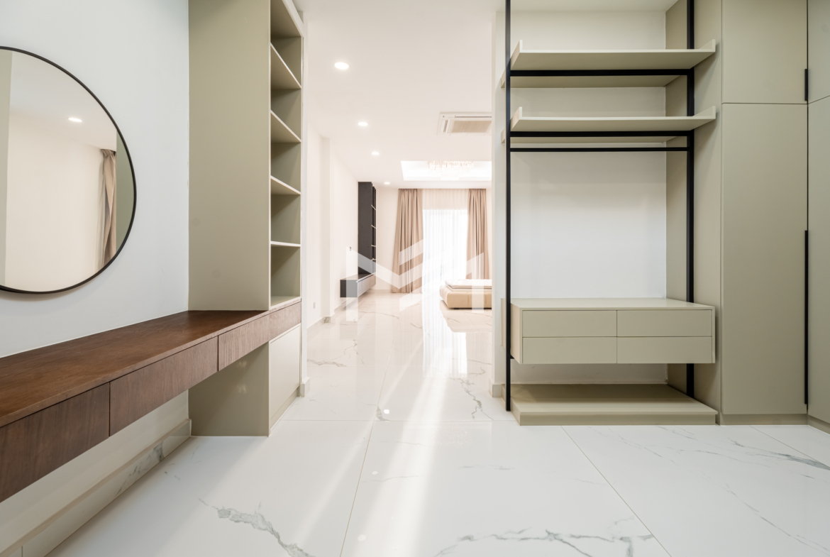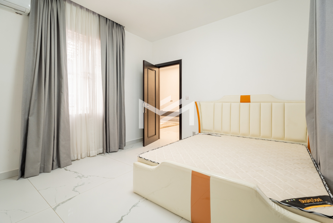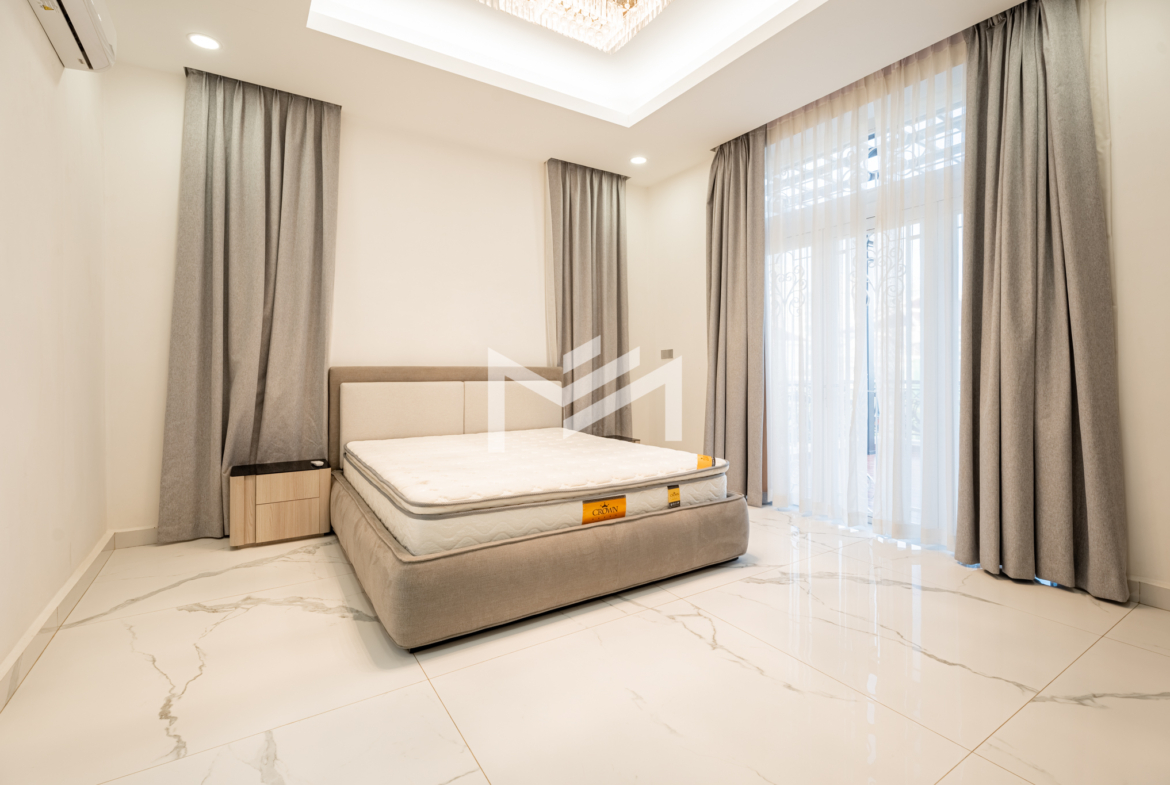 Luxury King Villa for rent in a secured gated community in the north of Phnom Penh, close to AEON Mall 2 and the Ministry of Land. This elegant villa is fully furnished with premium, high-quality furniture and is completely ready to move in. The neighborhood offers 24-hour security, green parks and a peaceful environment suitable for both families and professionals. The location is highly convenient, only about 15 minutes from the Toul Kork area, with easy access to schools, shopping and main roads. Spacious and comfortable, this property is ideal for group sharing or a large family looking for a luxurious home in a safe and well-managed community.