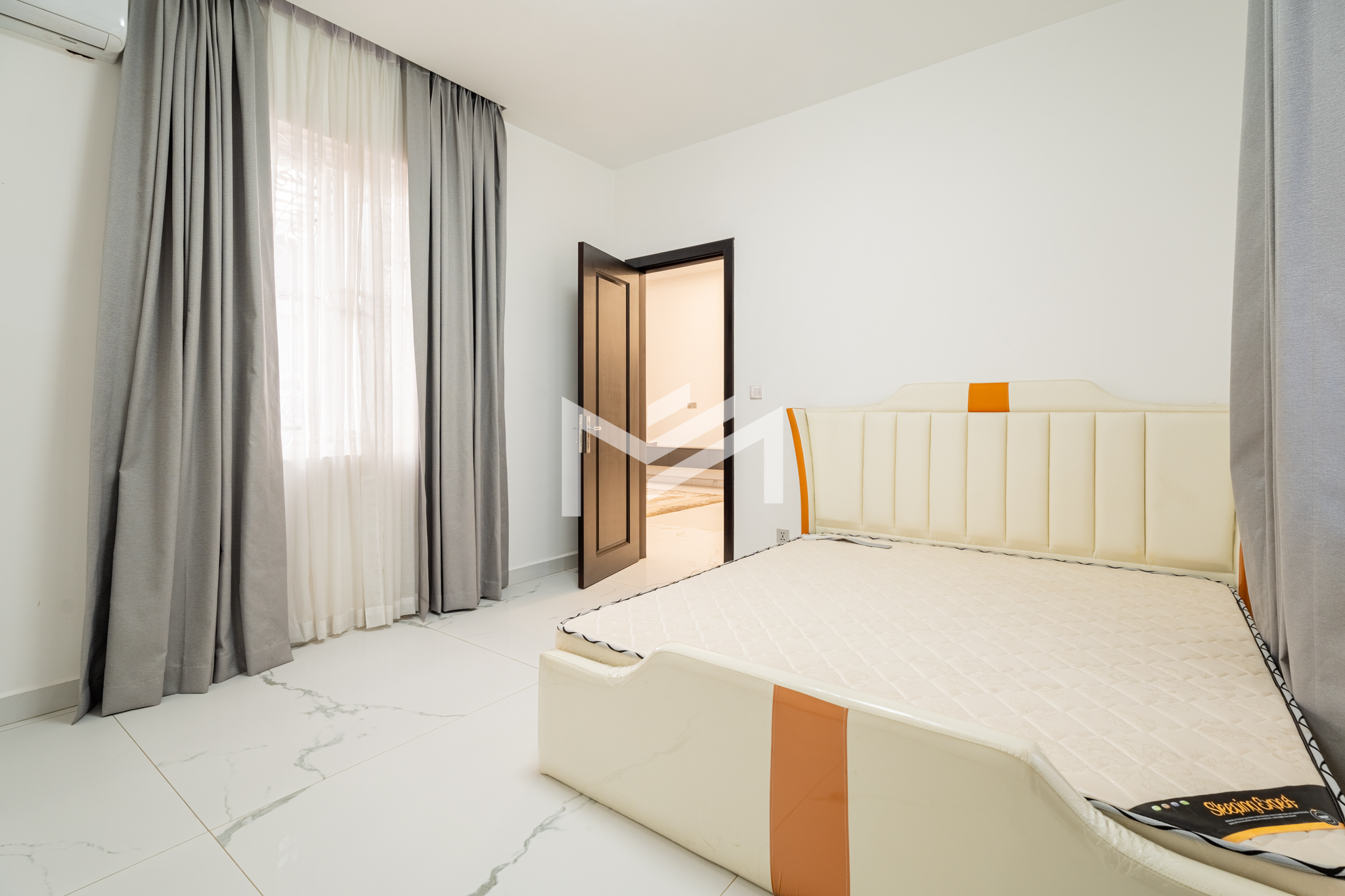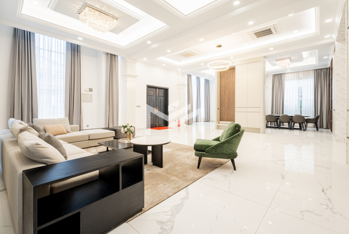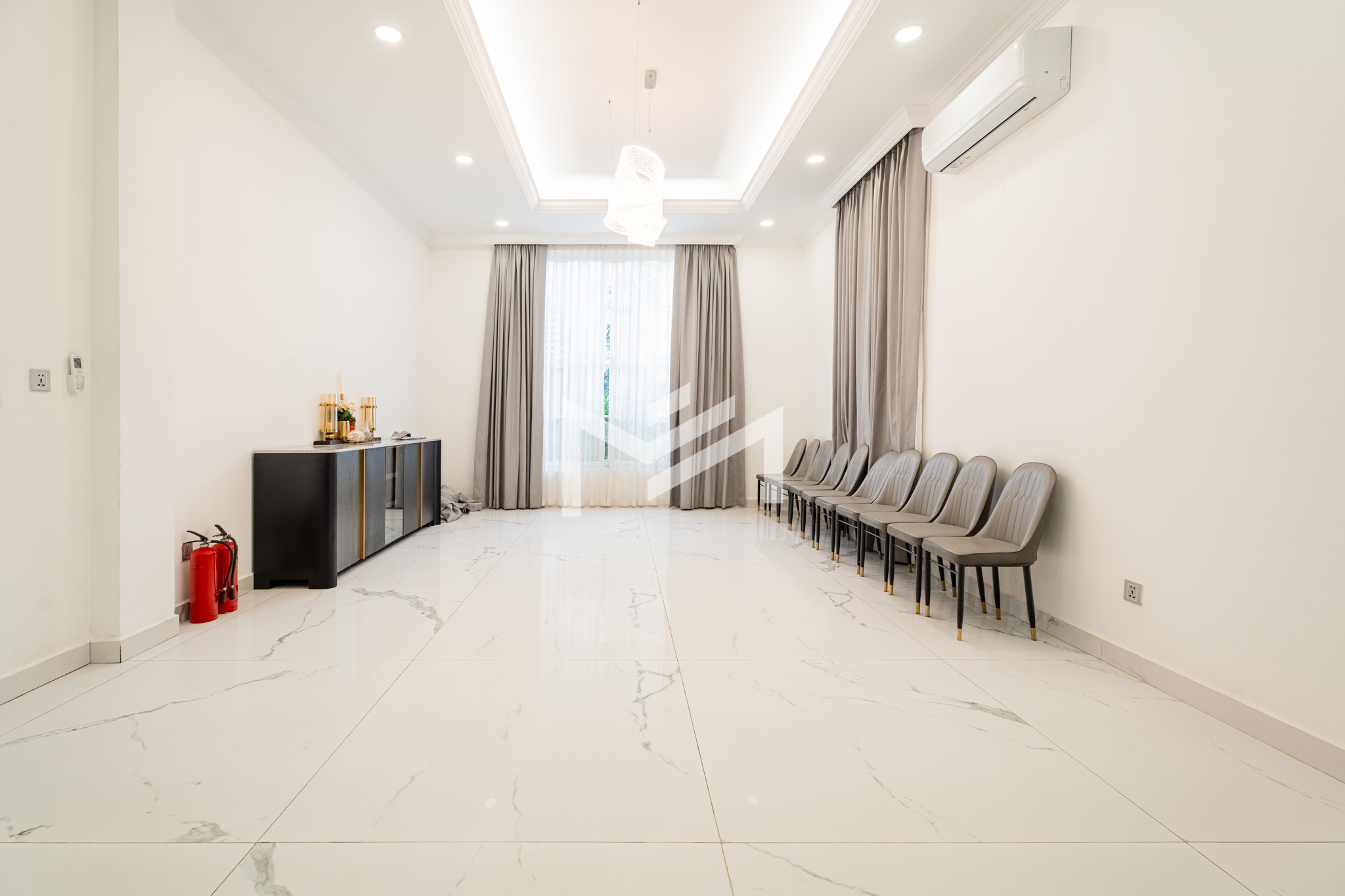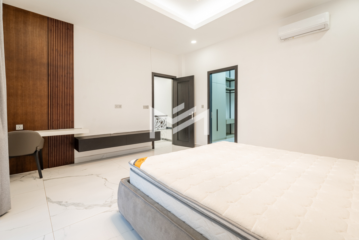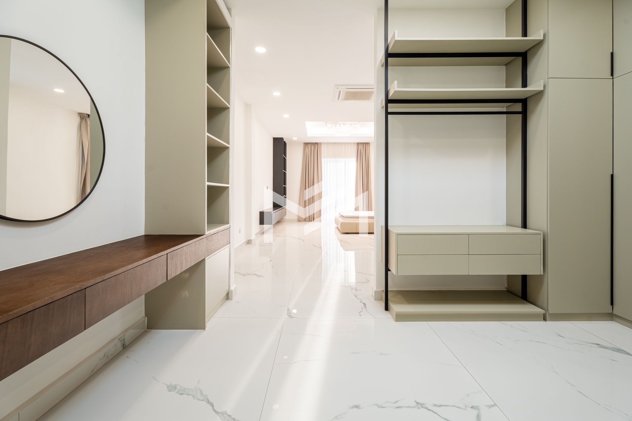 Luxury King Villa for rent in a secured gated community in the north of Phnom Penh, close to AEON Mall 2 and the Ministry of Land. This elegant villa is fully furnished with premium, high-quality furniture and is completely ready to move in. The neighborhood offers 24-hour security, green parks and a peaceful environment suitable for both families and professionals. The location is highly convenient, only about 15 minutes from the Toul Kork area, with easy access to schools, shopping and main roads. Spacious and comfortable, this property is ideal for group sharing or a large family looking for a luxurious home in a safe and well-managed community.
