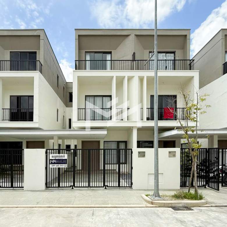 This Twin Villa (Villa Plus Touch) offers a spacious and modern design, just 5KM from Aeon 3 and 15KM from BKK1. With three floors, it provides ample space for comfortable living. The dimension of the villa is 5.5m x 12.45m, South facing. The ground floor features a closed kitchen, helper room, guest toilet, and storage. The first floor includes a master bedroom, a living room lounge, and one bathroom. The second floor has two bedrooms sharing one bathroom, with each front bedroom featuring a private balcony. This ready-to-move-in home is available with bank loan options for easy financing.