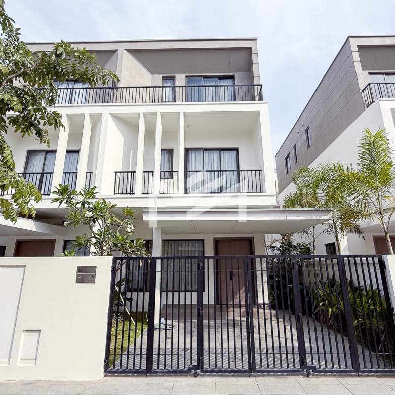 This spacious twin villa offers four bedrooms, each with an attached bathroom. The property is nearly fully furnished, with every bedroom equipped with a wardrobe, bed, and mattress. On the ground floor, you’ll find a guest toilet, storage space, a closed kitchen, and a helper room. A mini garden about two meters wide adds a touch of greenery. Located in a beautiful compound of over 300 homes, the property features a large shared garden and 24-hour security. It’s approximately 15KM from the BKK1 area, making it a peaceful yet convenient choice for families or individuals seeking a comfortable residence outside the busy city center.