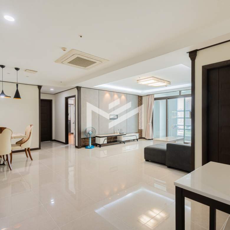Corner unit facing north and west, featuring the best 3-bedroom layout with abundant natural light. Enclosed balcony can be integrated into the living room. Flexible kitchen design—can be closed or open. Prime location in BKK1 within a well-managed condominium.