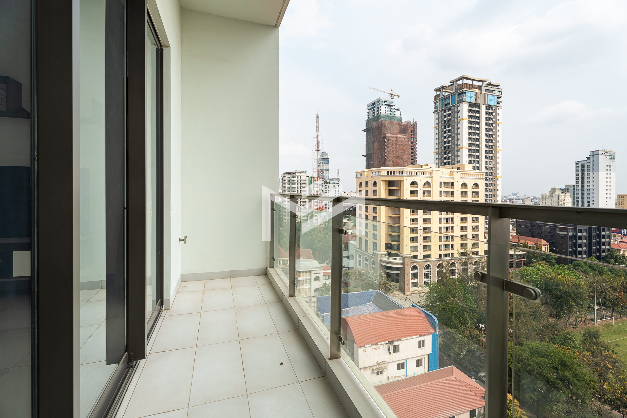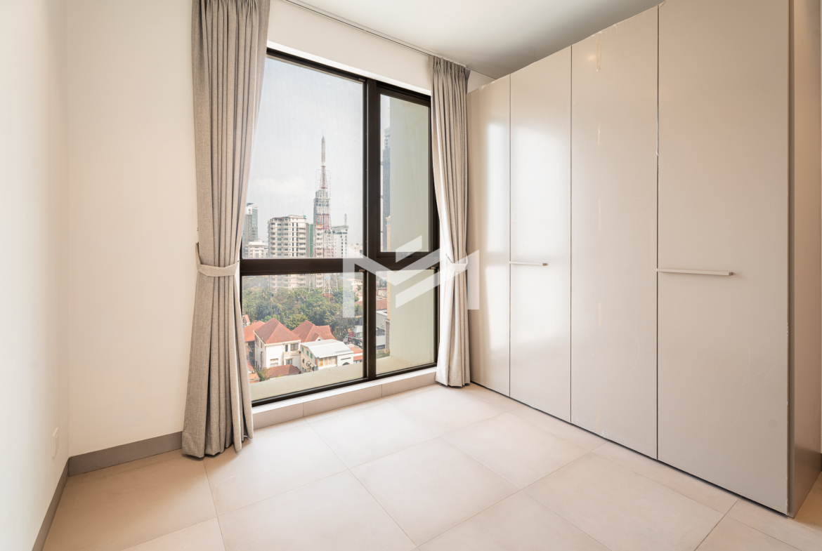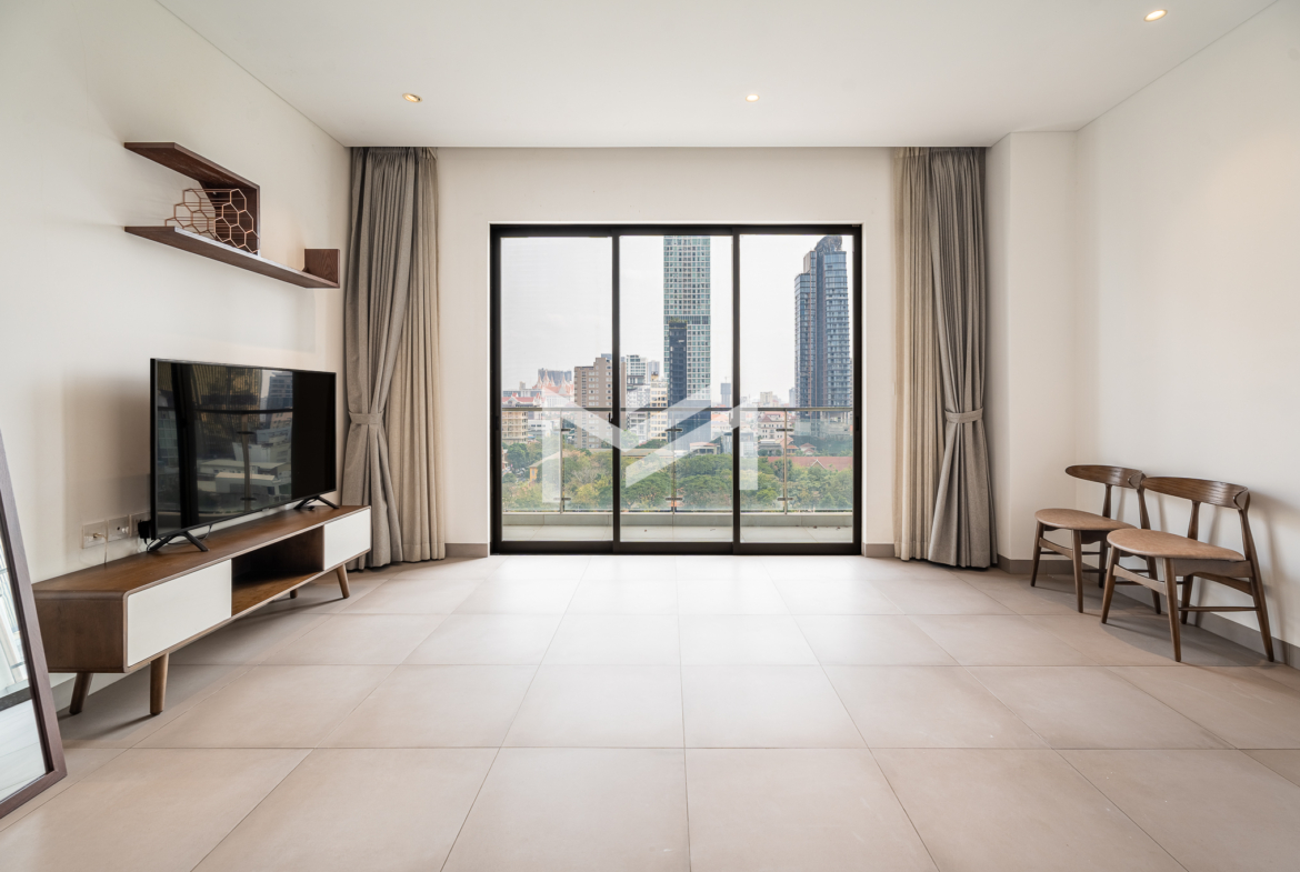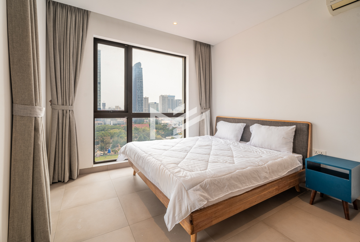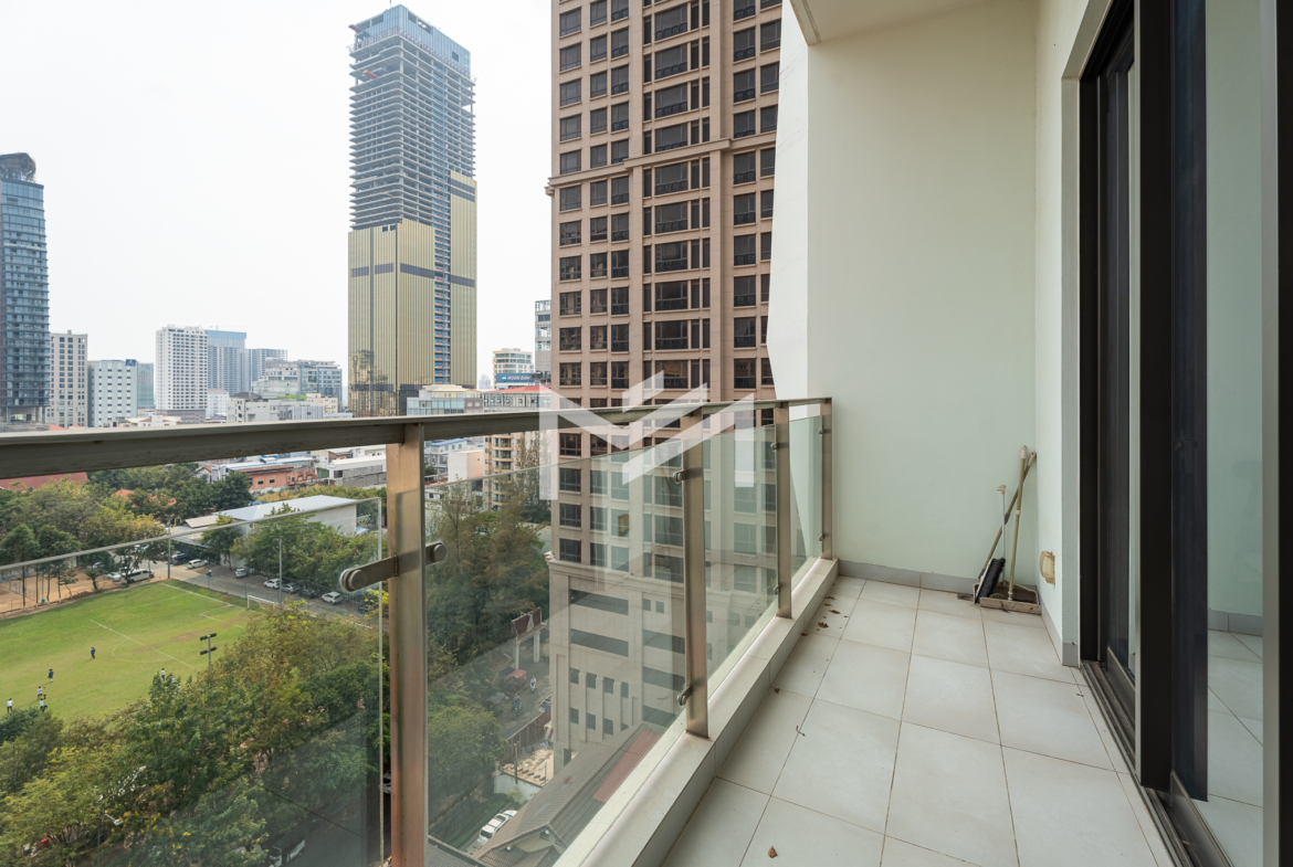 This compact 2-bedroom corner unit enjoys a desirable south and east orientation, allowing for excellent natural light and airflow throughout the day. The layout includes one master bedroom, while the second room can be used flexibly as a guest room or study, making it practical for different lifestyle needs. The unit features a large balcony overlooking a football field, offering open views and a pleasant sunrise setting. It is well suited for a single professional, couple, or a small family seeking comfortable living in a bright and functional space. Centrally located in BKK1, the property provides convenient access to restaurants, cafés, offices, and lifestyle amenities. Residents also enjoy quality facilities including a gym, swimming pool, sunset garden, and sunrise garden, enhancing the overall living experience in one of Phnom Penh’s most sought-after neighborhoods.