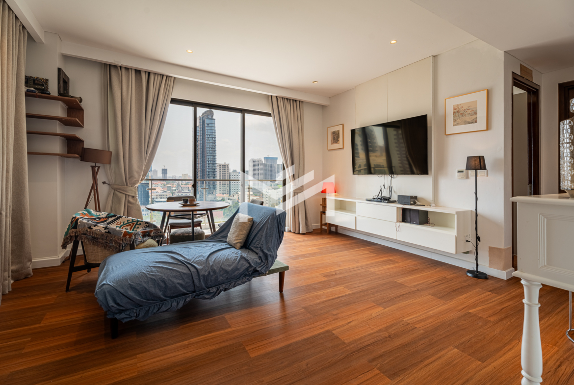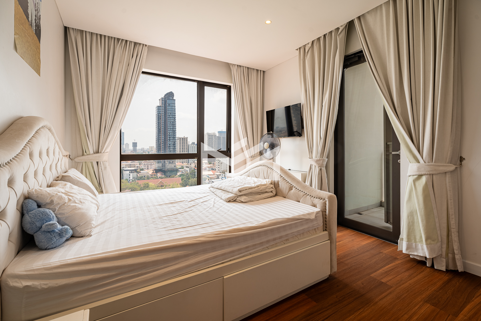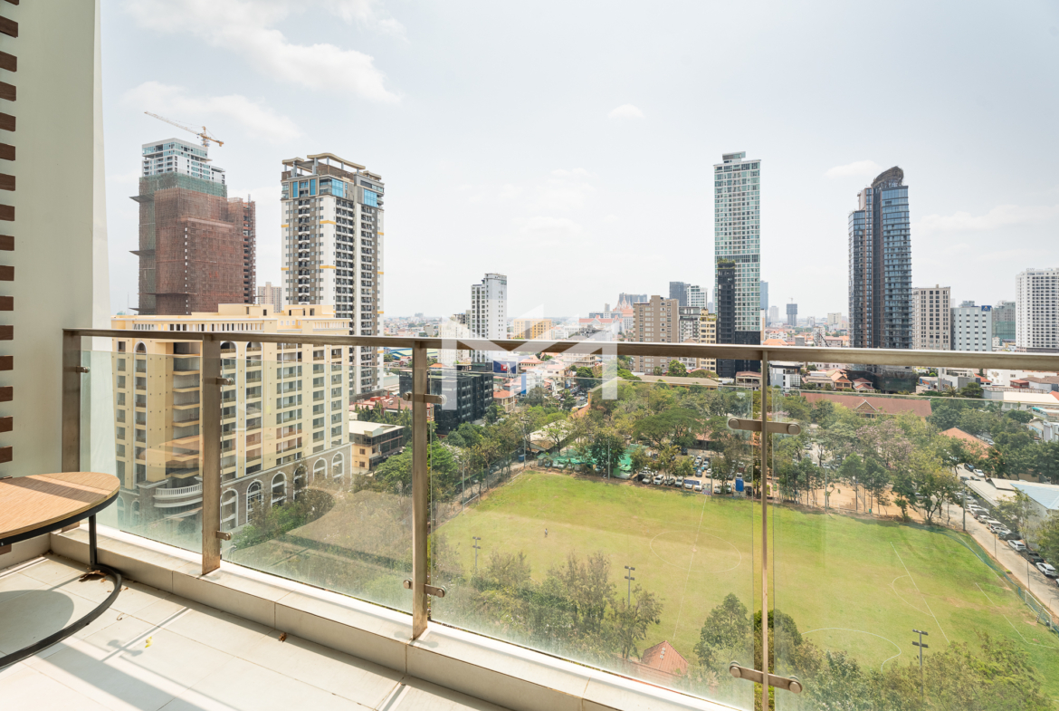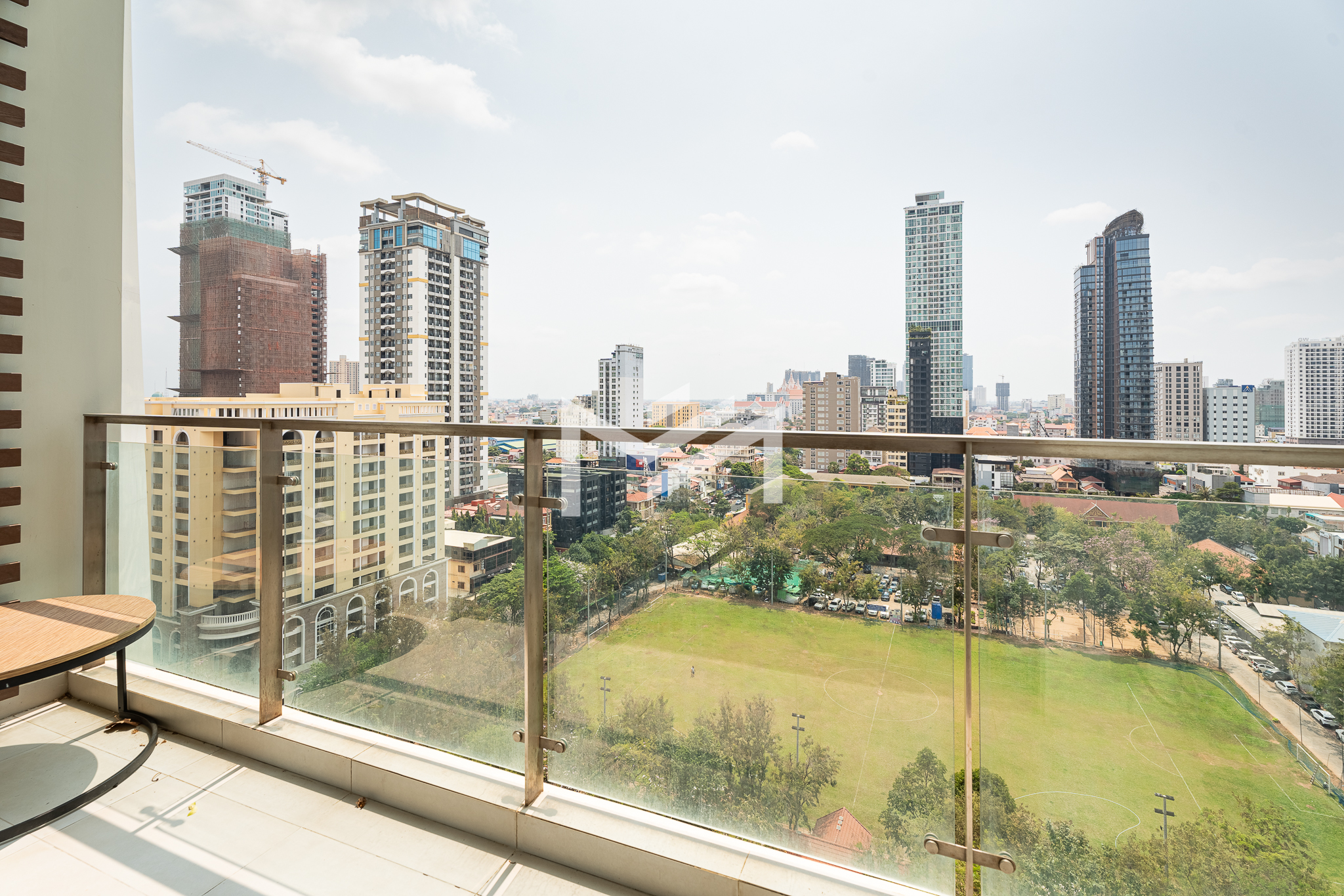 This bright corner unit in the heart of BKK1 features large windows that bring in an abundance of natural light, complemented by beautiful wood flooring throughout. The spacious master bedroom includes a big closet, while the Western kitchen comes fully equipped with a built-in oven. Additional highlights include a storage area for cleaning equipment, a hidden space for a washing machine, and a good-sized balcony overlooking a football field. Located in the center of BKK1, this unit is within walking distance to shops, restaurants, cafés, and all essential amenities—ideal for comfortable, urban living.
