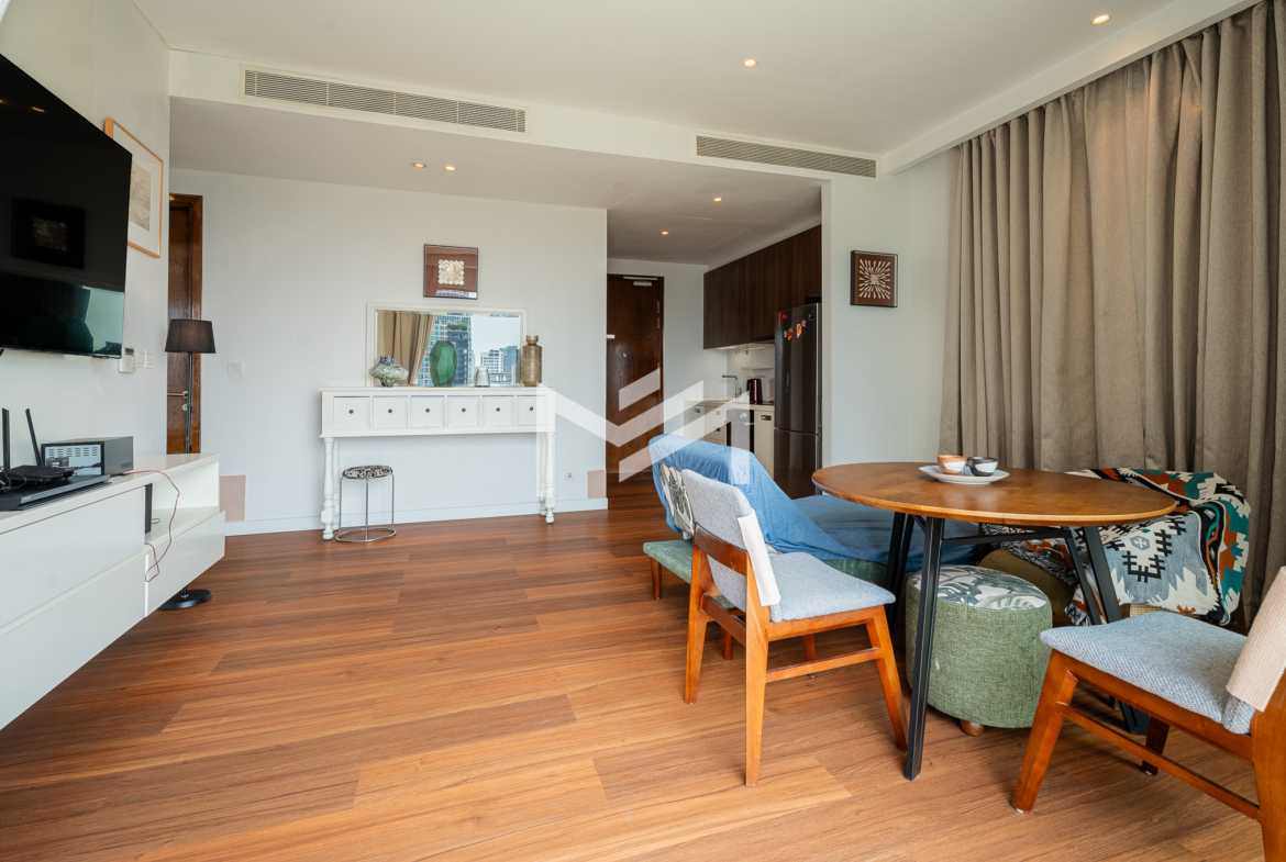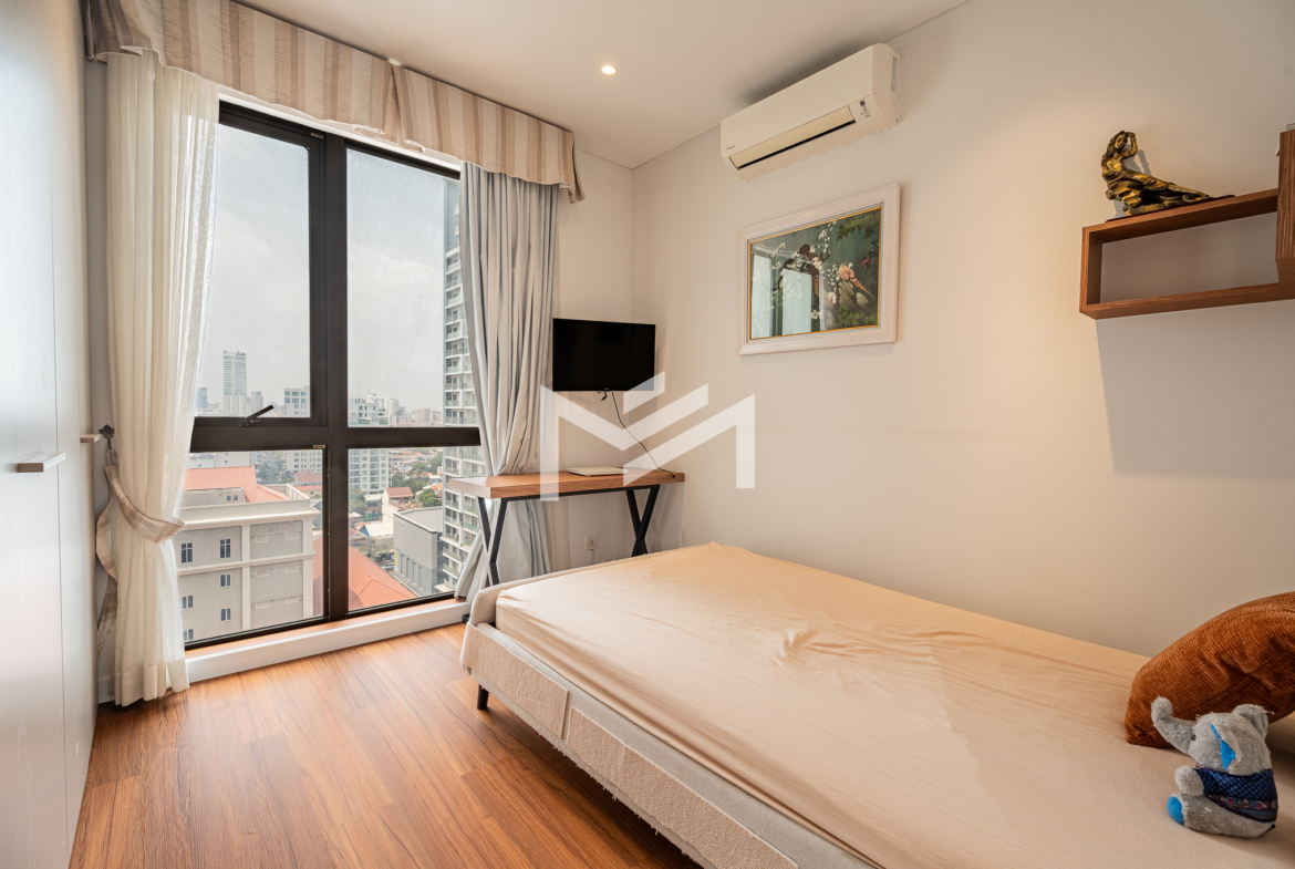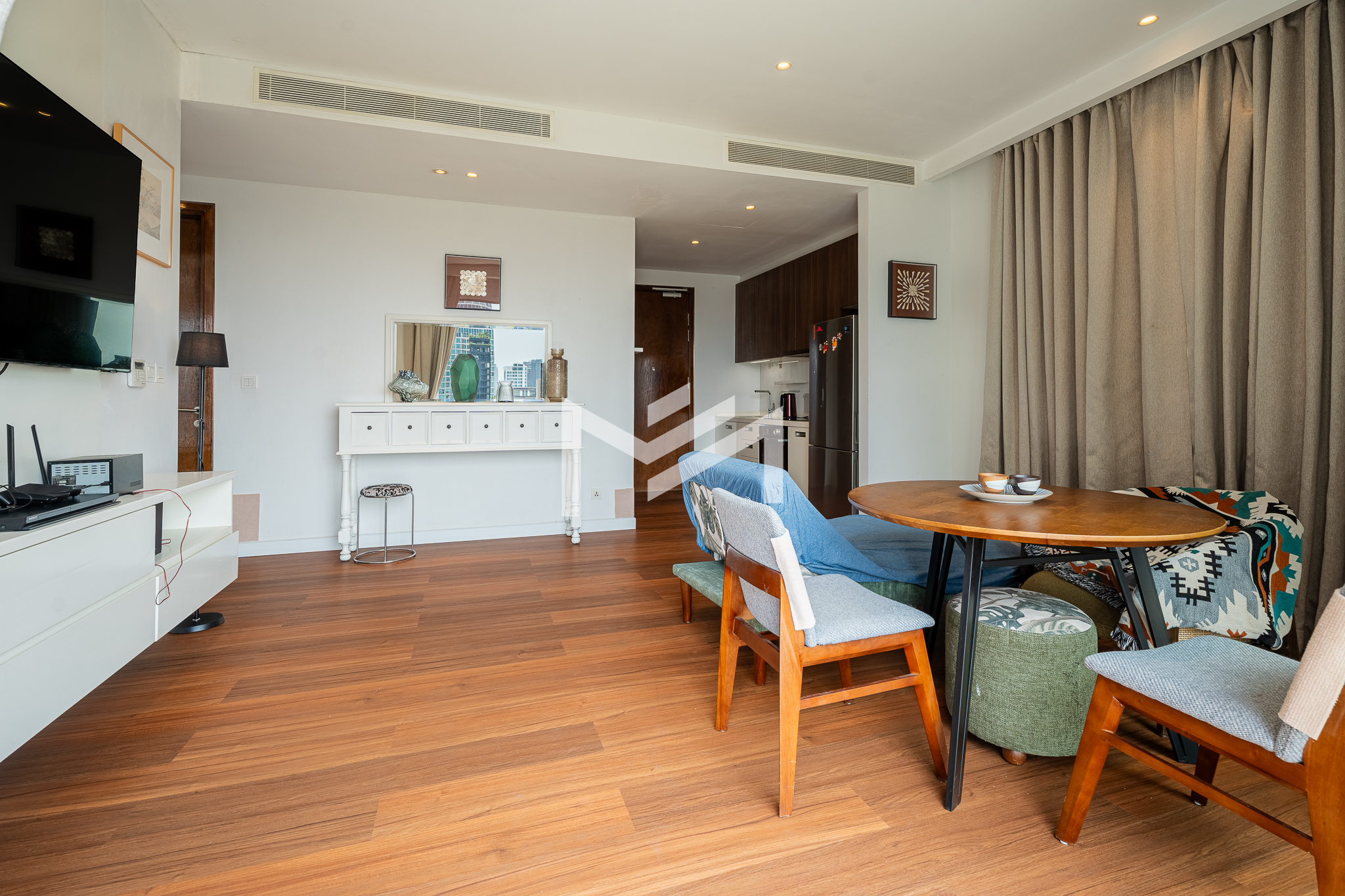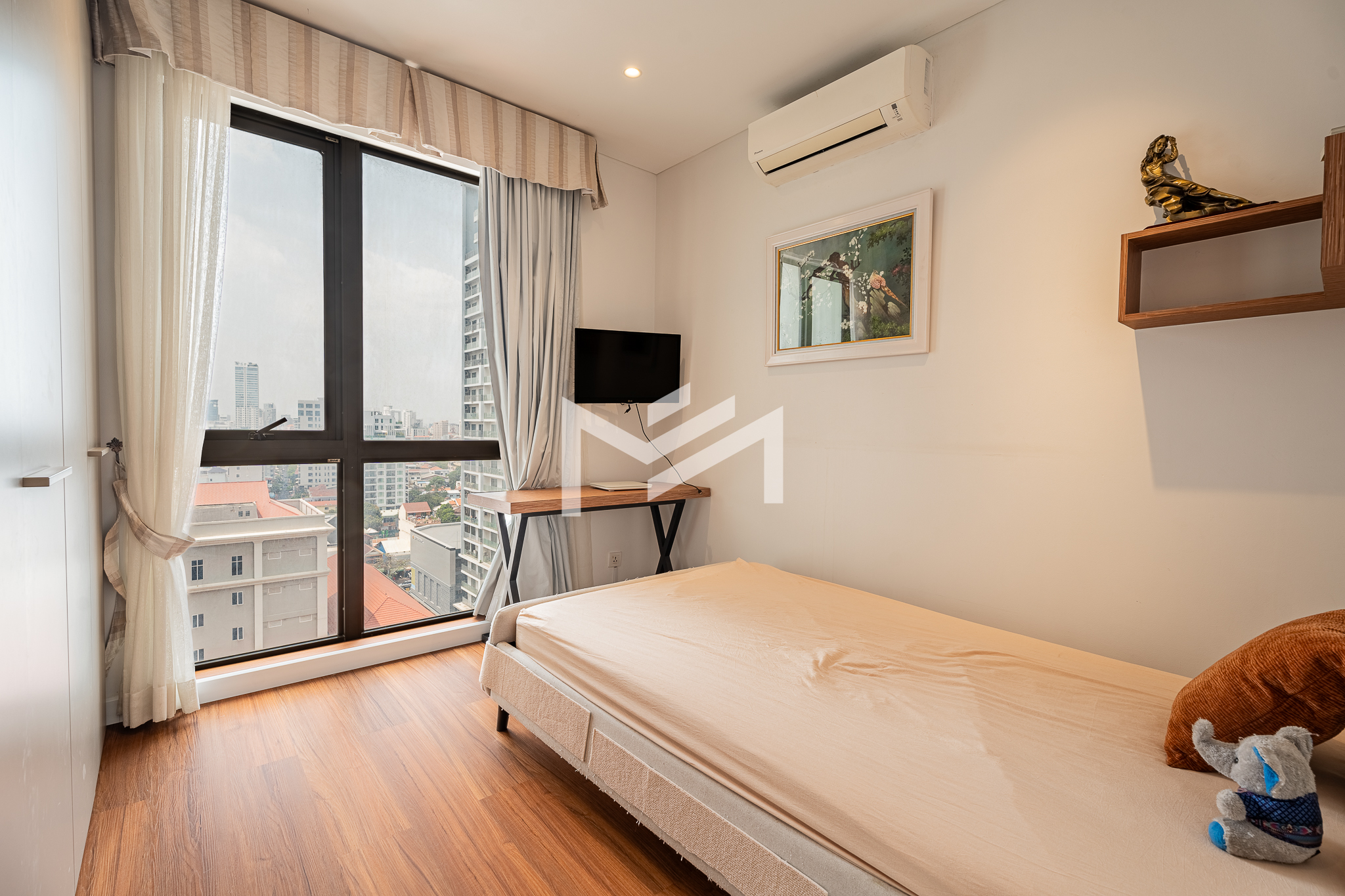 This bright corner unit in the heart of BKK1 features large windows that bring in an abundance of natural light, complemented by beautiful wood flooring throughout. The spacious master bedroom includes a big closet, while the Western kitchen comes fully equipped with a built-in oven. Additional highlights include a storage area for cleaning equipment, a hidden space for a washing machine, and a good-sized balcony overlooking a football field. Located in the center of BKK1, this unit is within walking distance to shops, restaurants, cafés, and all essential amenities—ideal for comfortable, urban living.