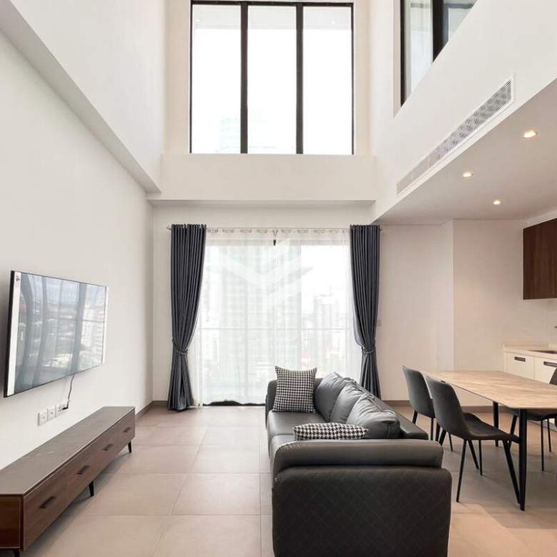 This high-ceiling duplex unit offers a spacious and modern living experience in expat-friendly BKK1. The master bedroom on the upper floor features a private balcony, attached bathroom, and a big closet. The second bedroom on the lower floor has access to an outside bathroom, along with a utility room and an open kitchen. Enjoy beautiful sunrise views, with convenient access to shops, schools, and stores—all within walking distance.