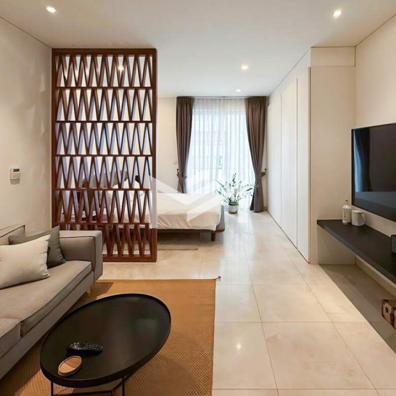 Well-designed and cozy studio unit, comparable in size to a one-bedroom. It features a large built-in closet, a spacious bathroom, and a generously sized kitchen with a built-in oven. The unit comes with centralized air conditioning and a balcony with a patio. Located in one of the best-managed condominium buildings just south of BKK1, this private residence offers only 87 units and exclusive rooftop amenities—a rare comfort that is hard to find in the area.