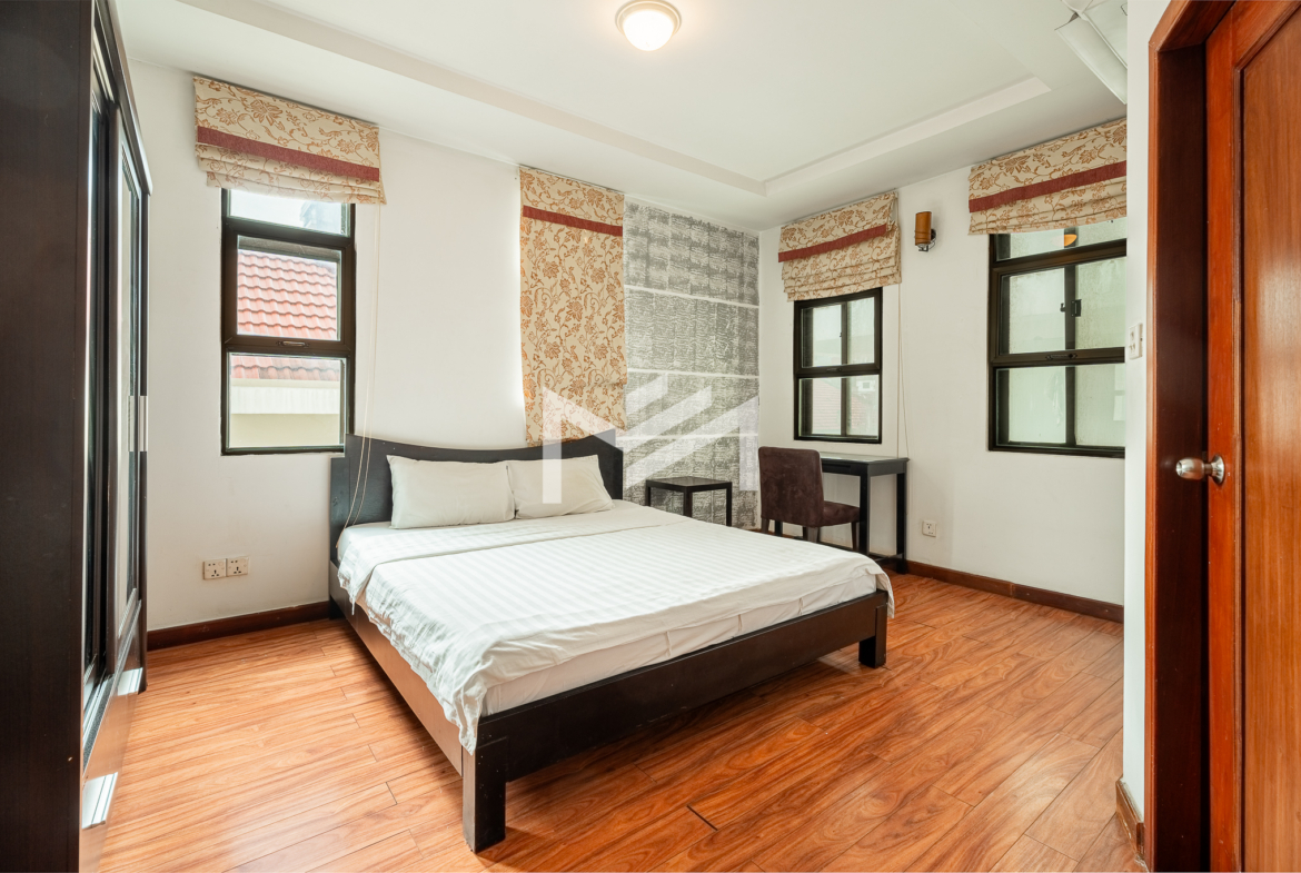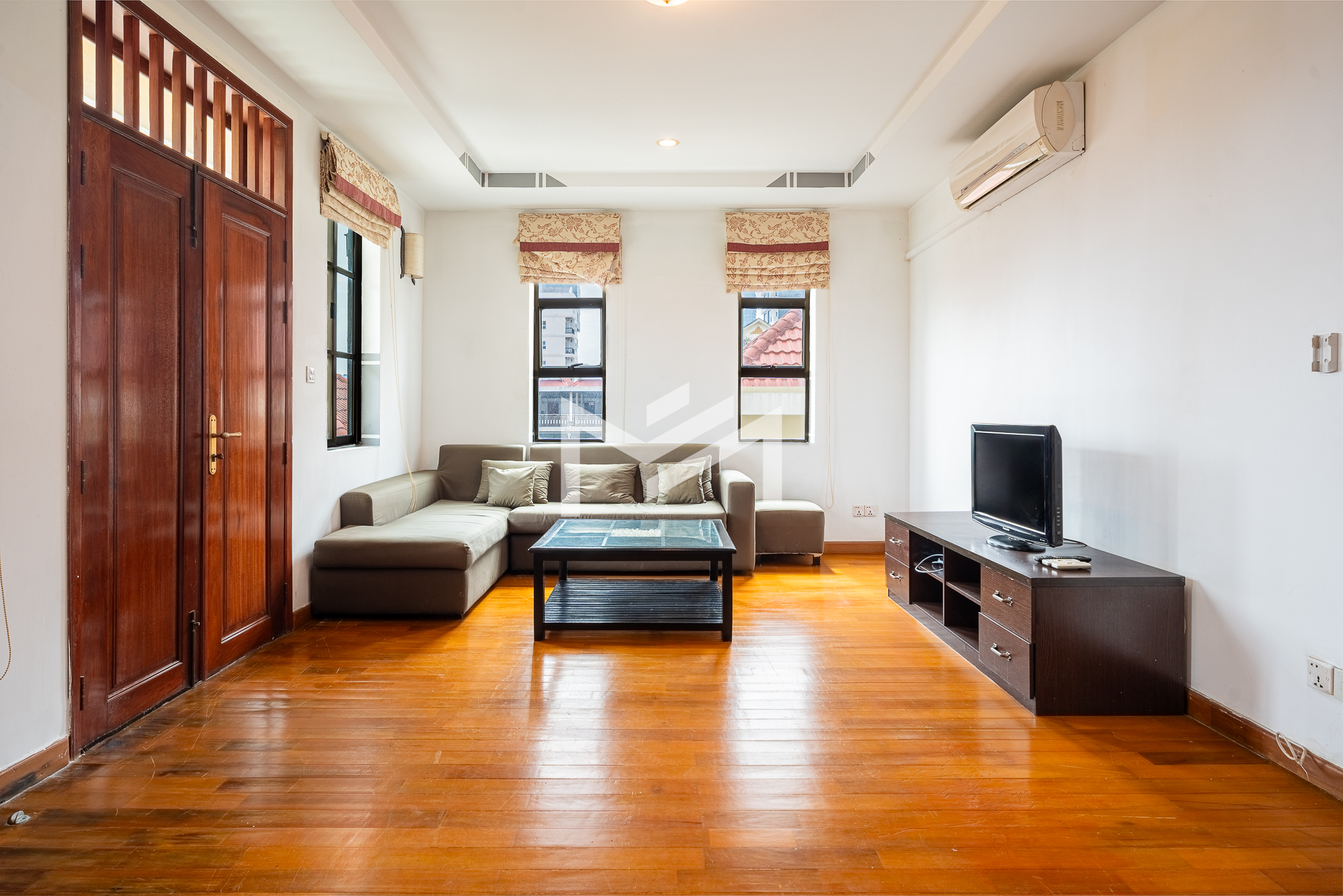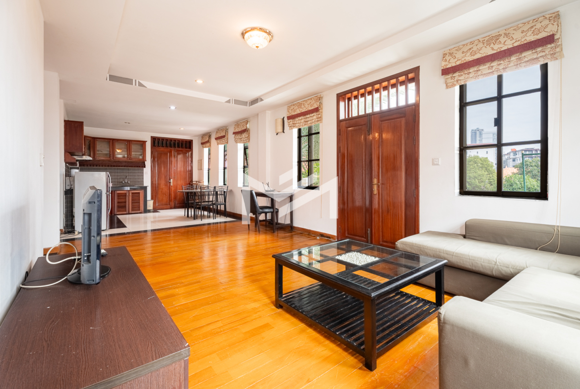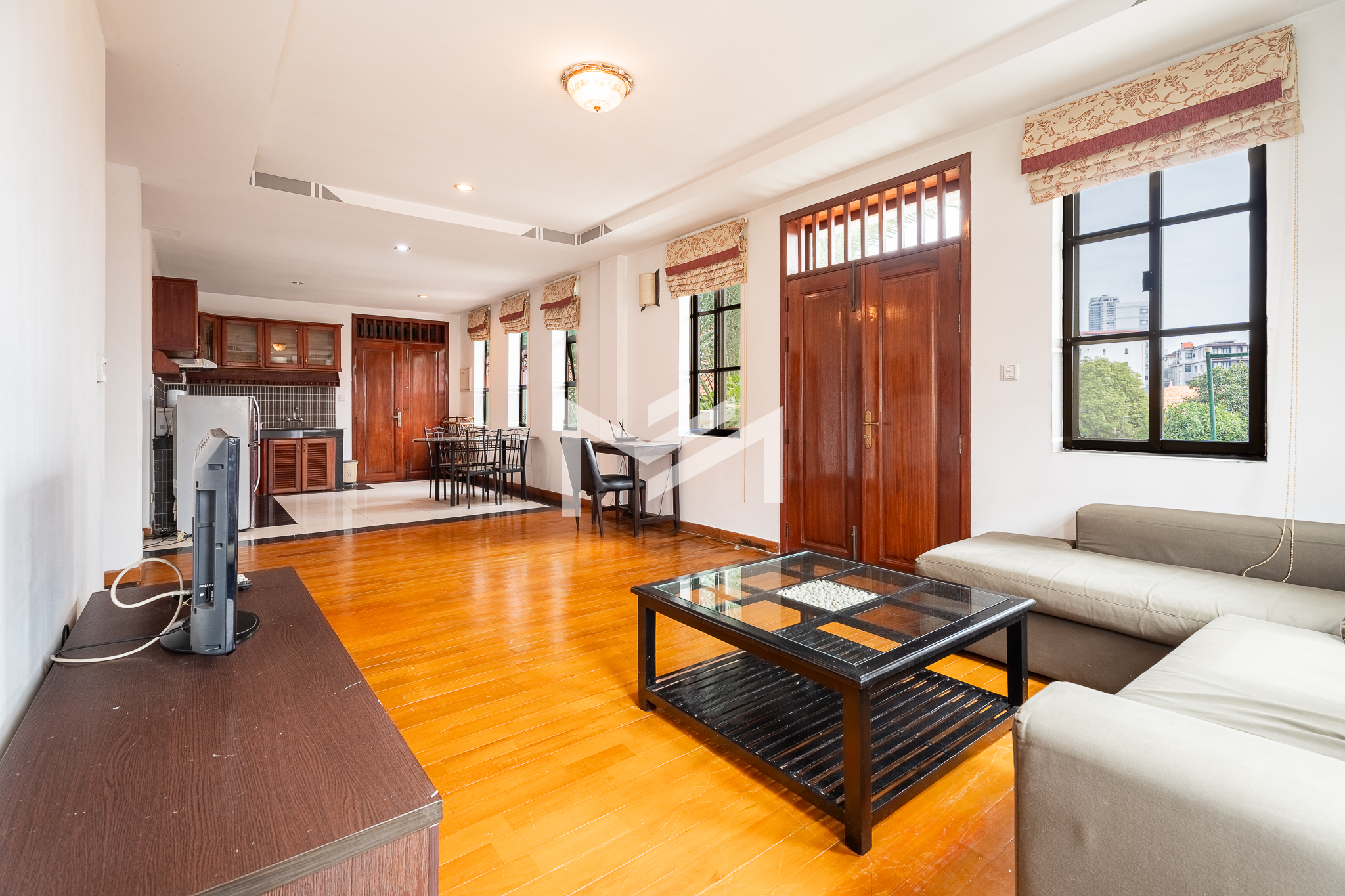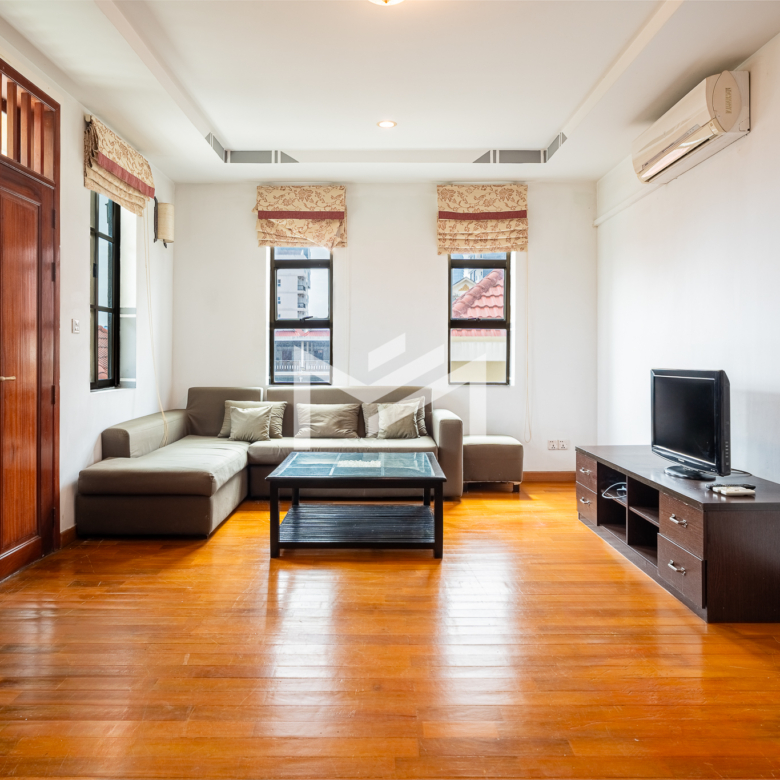 Elegant classical-design residence in a low-rise building, featuring warm wooden flooring and a fully equipped interior. The property offers regular cleaning service and access to gym and swimming pool, ensuring comfort and convenience. Located in the Wat Phnom area, north of Riverside, just steps from Lycée Français René Descartes, close to the French Embassy, and only 5 minutes to Riverside. Ideal for diplomats, expat families, and professionals seeking a refined living environment in the city center.
