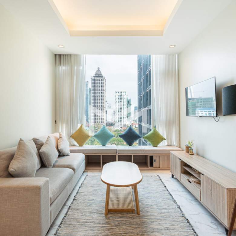 Compact yet warm and beautifully designed. The living room is situated between both bedrooms. The master bedroom features an attached bathroom with a bathtub, while the second bedroom has a private balcony and access to a shared external bathroom. Located in the expat-friendly BKK1 area, within walking distance to all amenities.