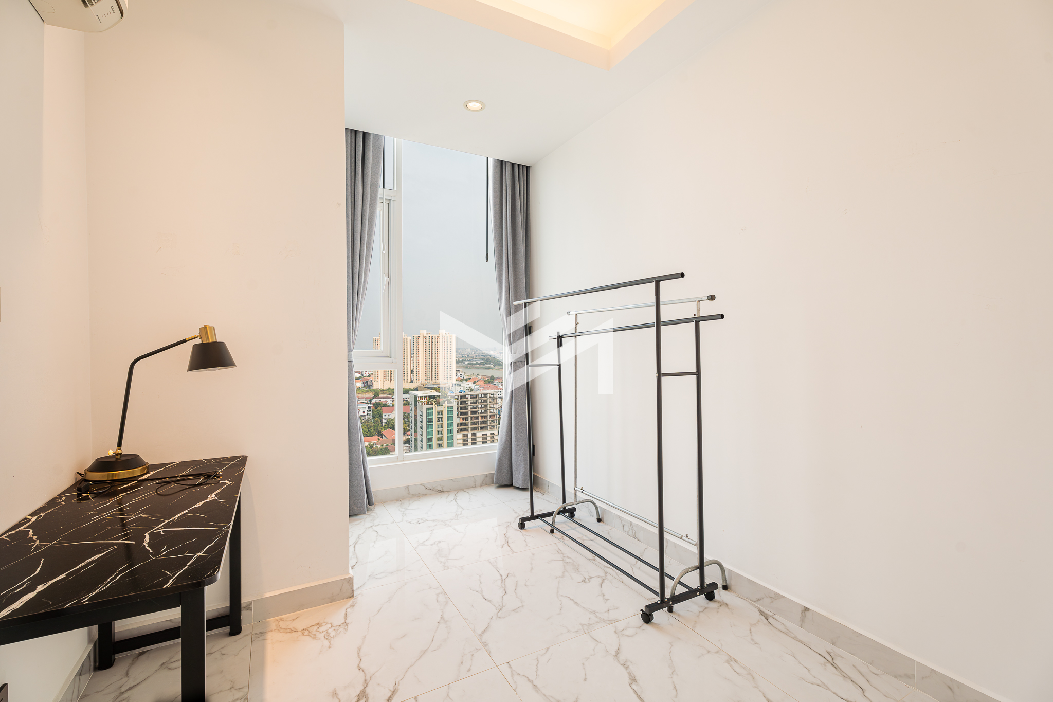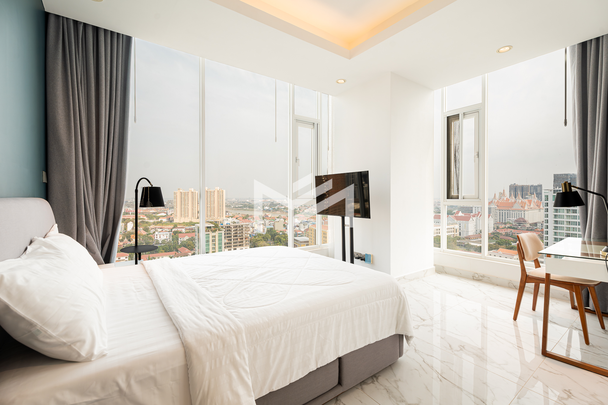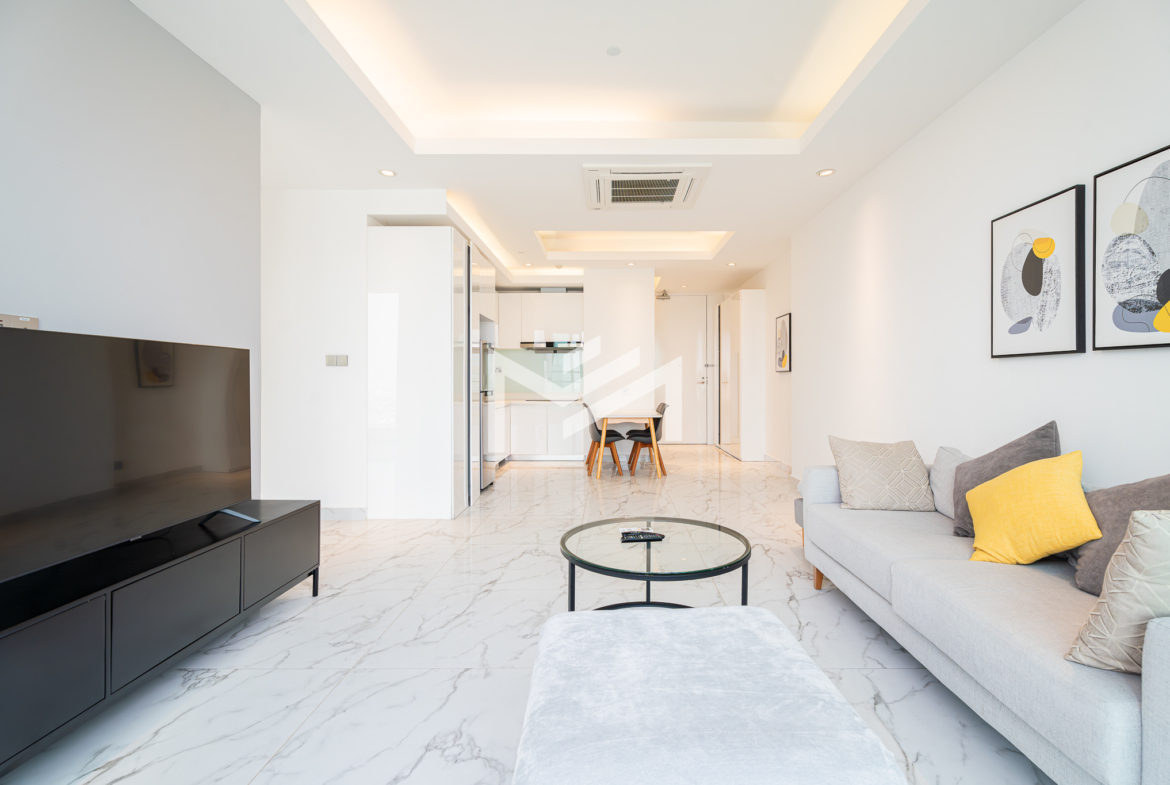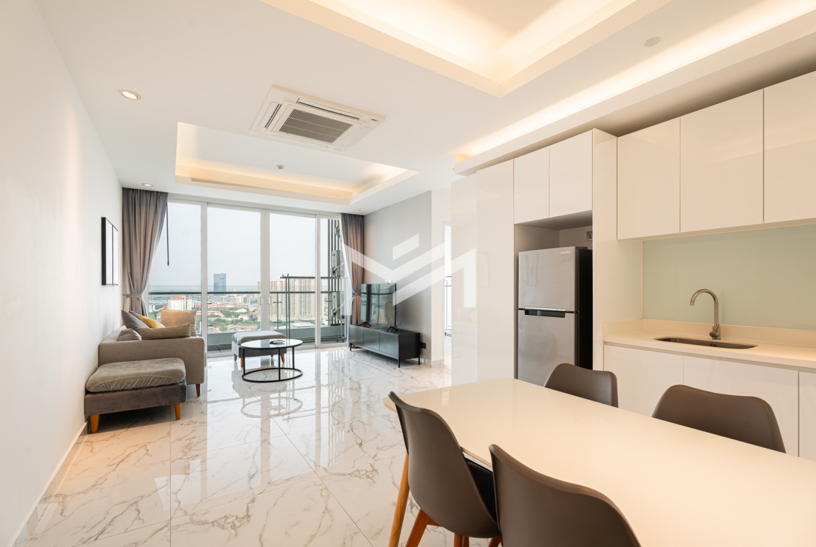 Southeast-facing corner unit on a high floor, offering breathtaking views of both the Mekong and Bassac Rivers. Enjoy the morning sun, abundant natural light, and refreshing airflow throughout the space. The living room extends to a spacious balcony, creating a bright and welcoming atmosphere. The master bedroom comes with an ensuite bathroom featuring both an overhead shower and a bathtub, while the second bedroom is conveniently served by a shared guest bathroom. Practical touches include a hidden cabinet for the washing machine, dedicated housekeeping storage, and a built-in shoe cabinet. This expat-friendly condominium provides exceptional facilities, including an indoor pool, sky pool, fitness center, luxury lobby, café, and mini-mart. Professionally managed and environmentally conscious, it offers the perfect balance of comfort, style, and convenience.