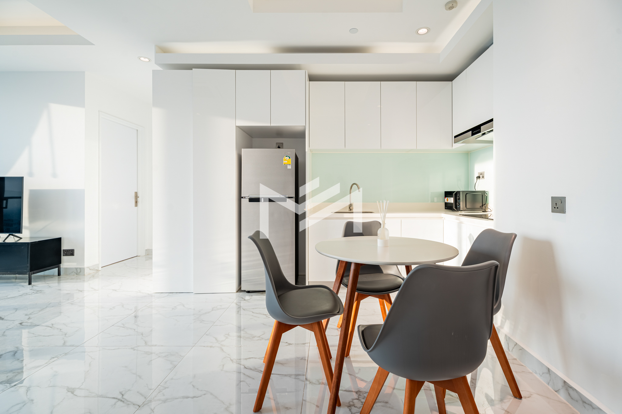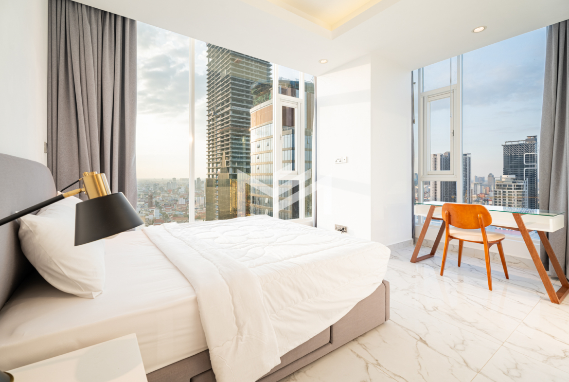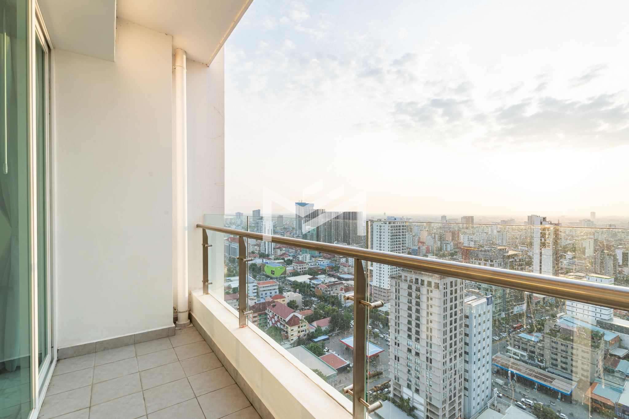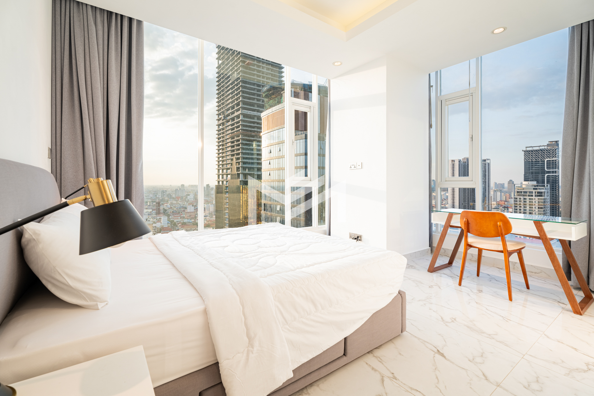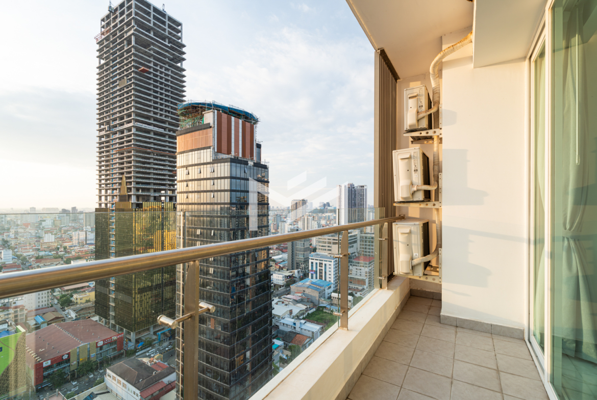 Corner unit facing North and West, filled with natural light and excellent air flow. Enjoy unobstructed views and an open-space living room that extends to a private balcony. The spacious master bedroom comes with an ensuite bathroom and a large closet area, while the second bedroom has access to a shared outside bathroom. Located in a well-managed, expat-friendly building in BKK1, offering a range of facilities and convenient access to restaurants, cafés, supermarkets, and all daily necessities — everything within walking distance.