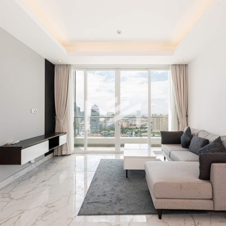 Corner unit on a high floor with stunning sunrise views. The master bedroom is positioned on the corner with an en suite bathroom featuring an overhead shower and bathtub. The second room can be used as a study or guest bedroom and has access to a separate bathroom. A good-sized balcony offers beautiful city views. Located in the heart of BKK1, in a vibrant, expat-friendly neighborhood.