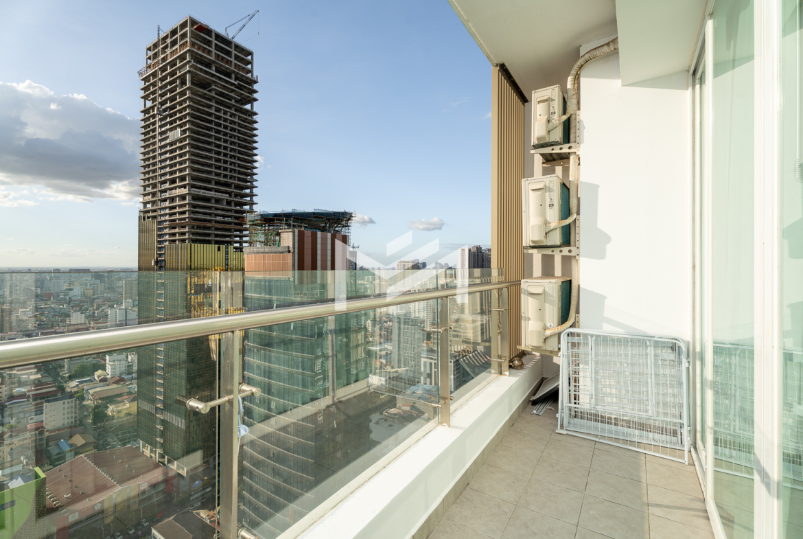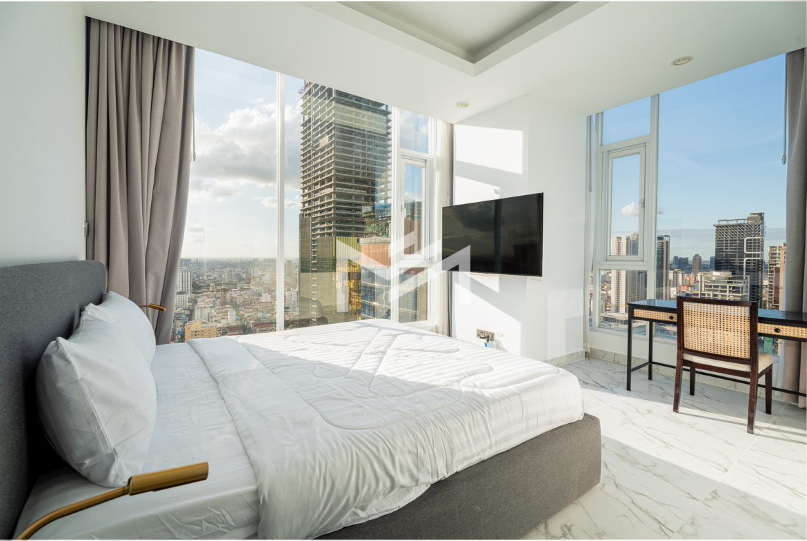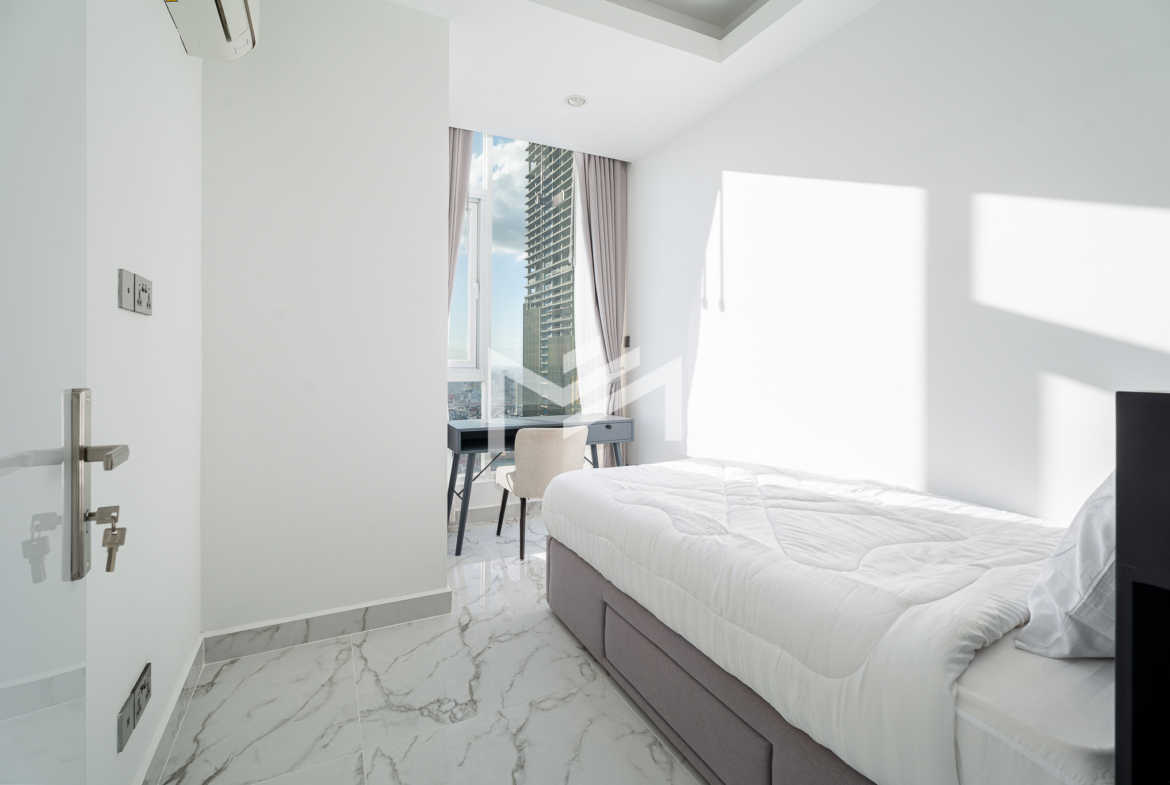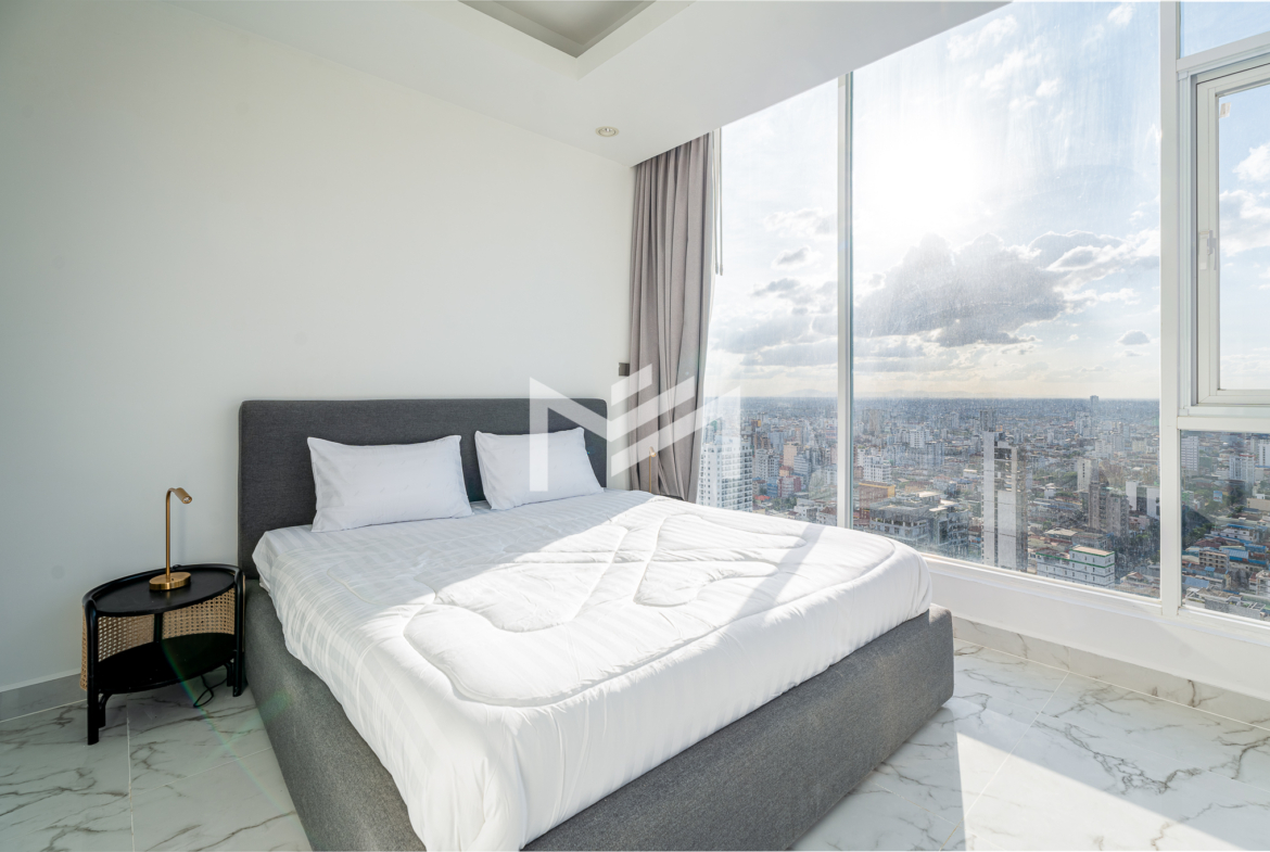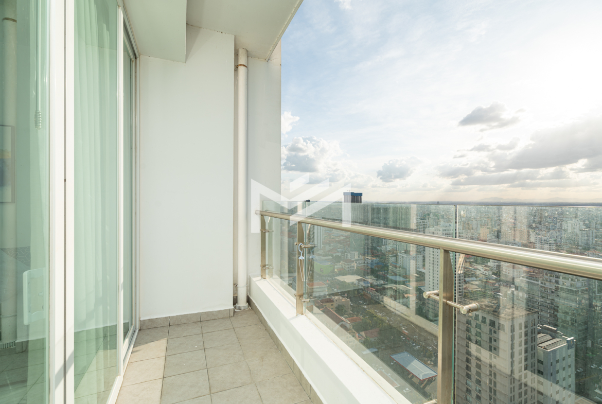 This north and west-facing high-floor unit offers stunning city views in the heart of expat-friendly BKK1. The open living room extends to a balcony, creating a bright and airy space. The master bedroom features an attached bathroom with a bathtub, while the second room can be used as a study or a single bedroom. Perfect for those seeking comfort and convenience in a prime location, this unit is ideal for singles, couples, or small families.