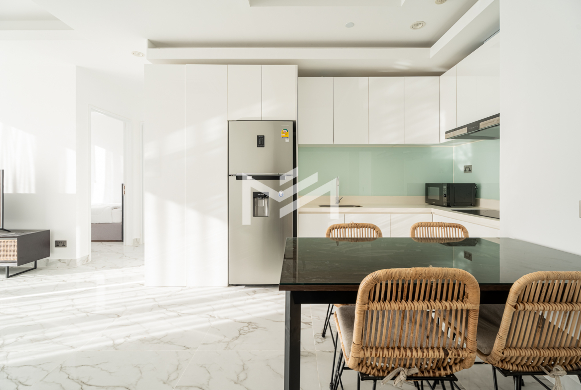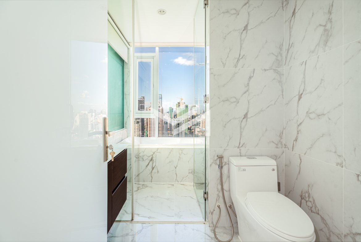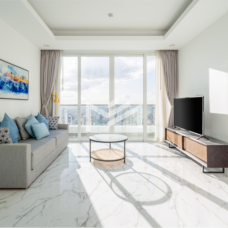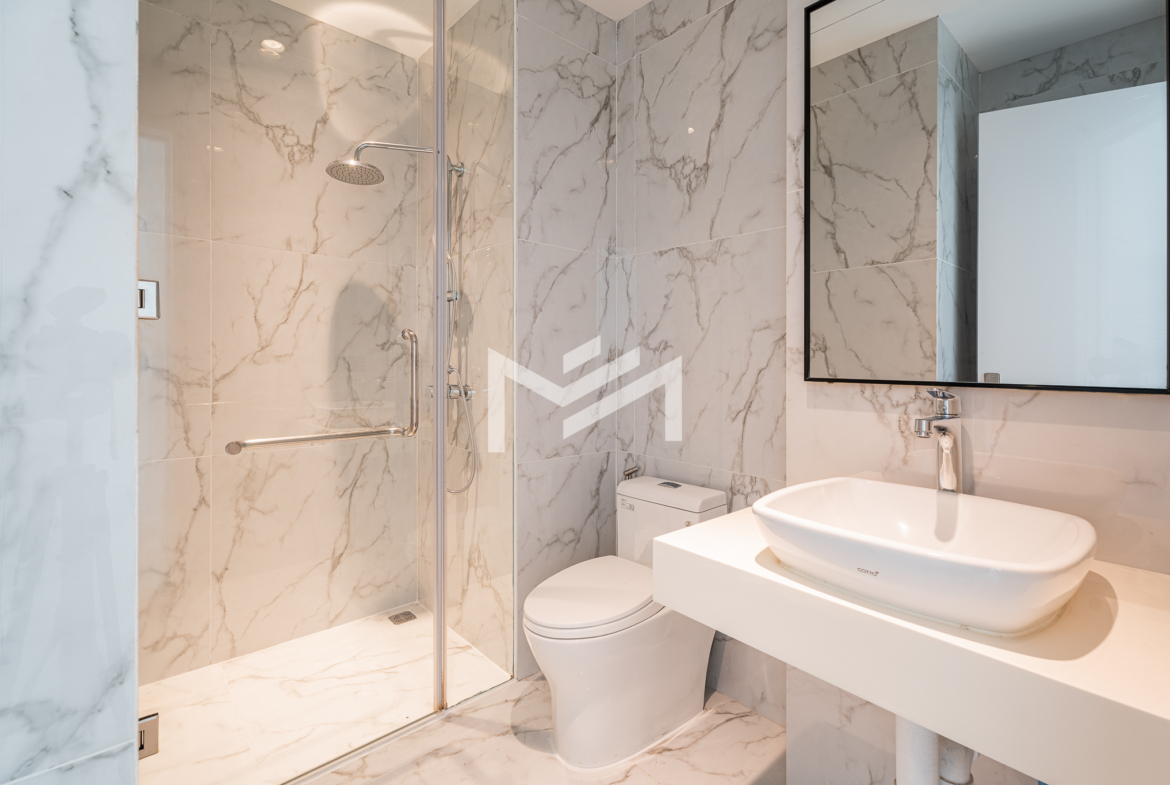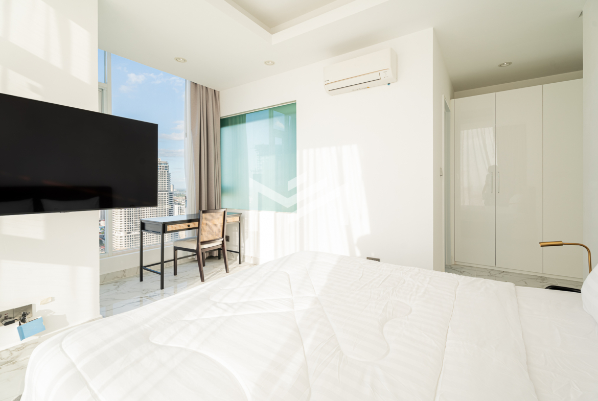 This north and west-facing high-floor unit offers stunning city views in the heart of expat-friendly BKK1. The open living room extends to a balcony, creating a bright and airy space. The master bedroom features an attached bathroom with a bathtub, while the second room can be used as a study or a single bedroom. Perfect for those seeking comfort and convenience in a prime location, this unit is ideal for singles, couples, or small families.