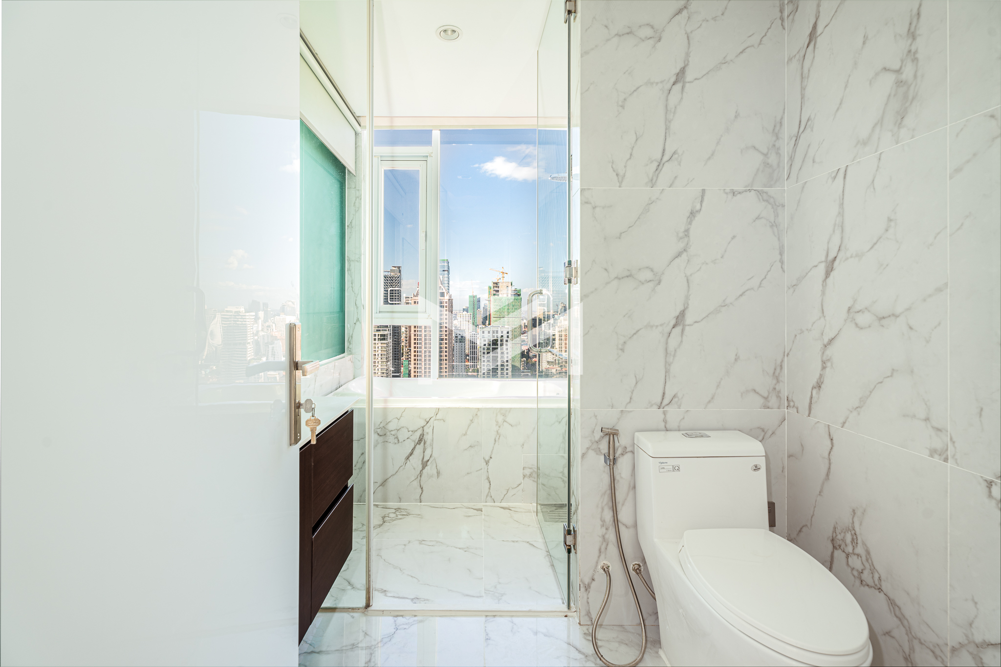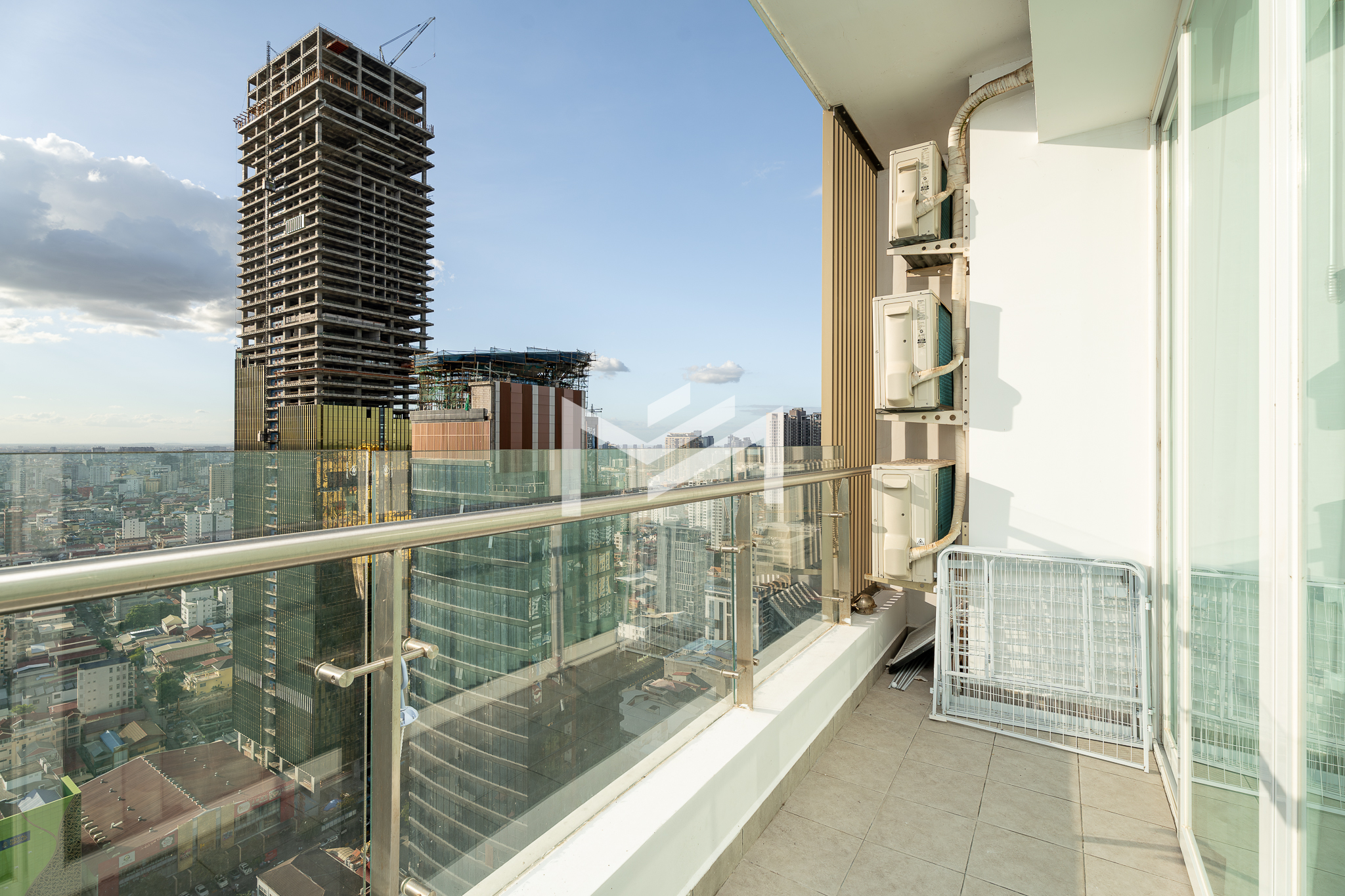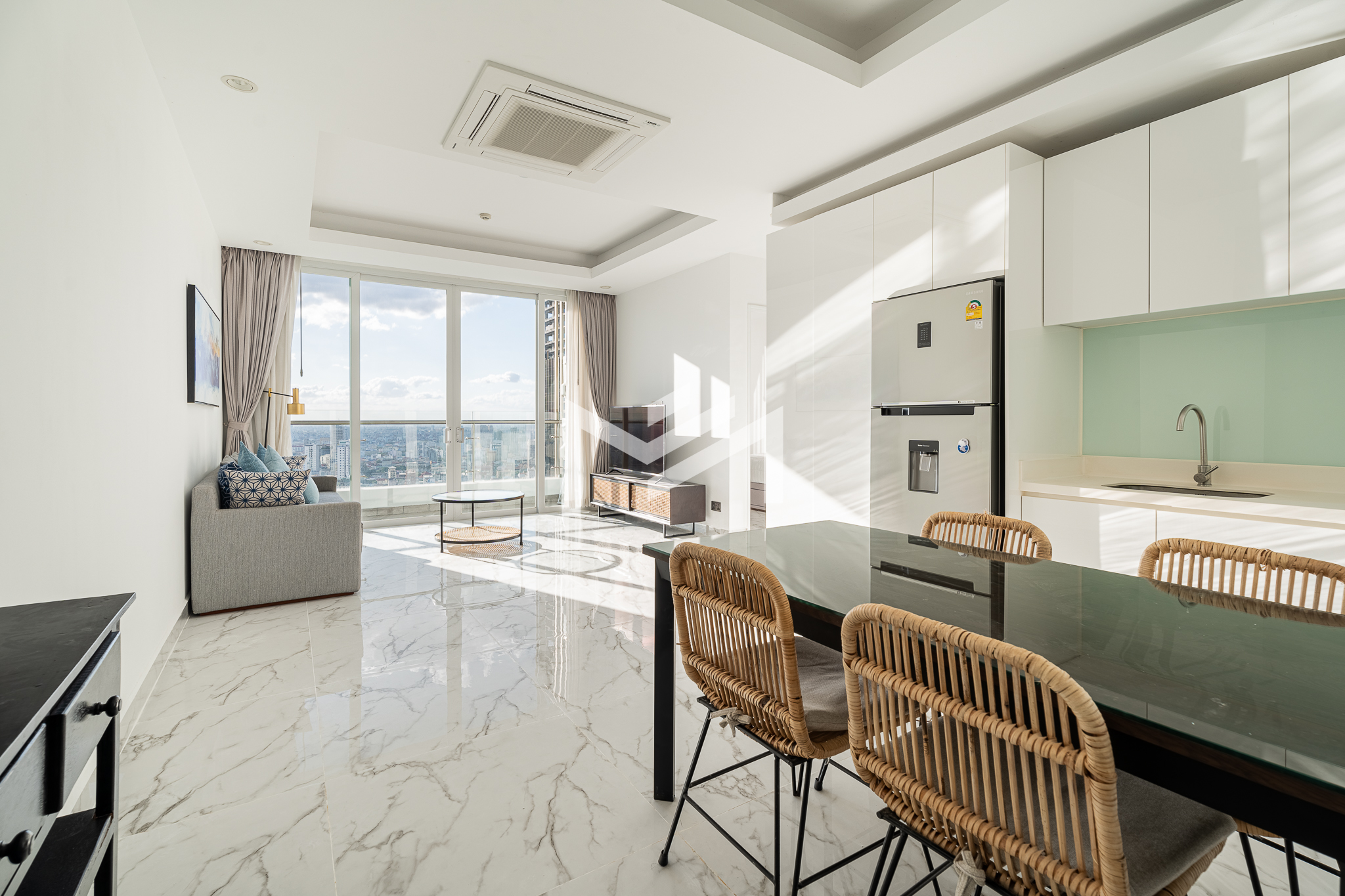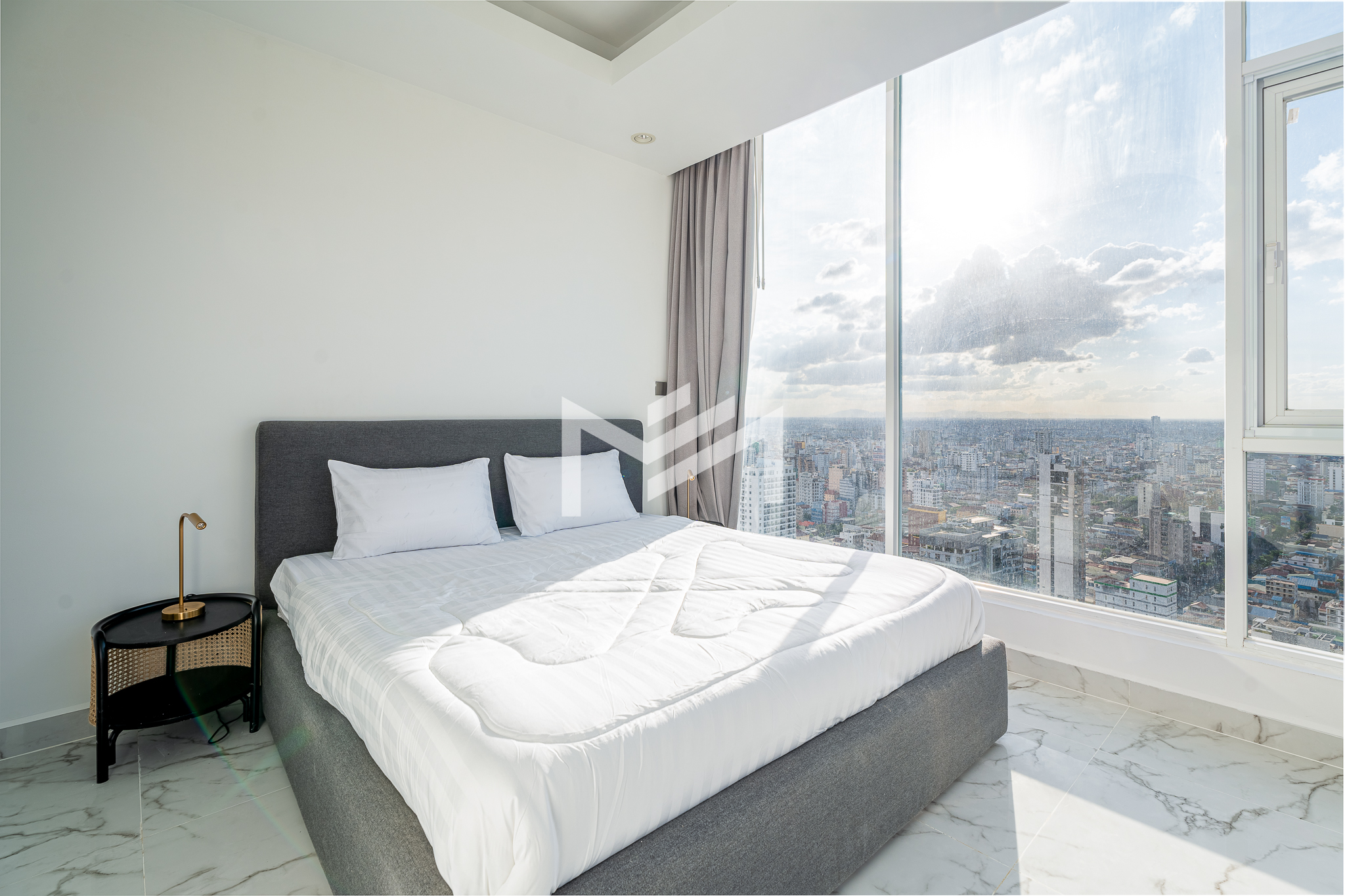 This north and west-facing high-floor unit offers stunning city views in the heart of expat-friendly BKK1. The open living room extends to a balcony, creating a bright and airy space. The master bedroom features an attached bathroom with a bathtub, while the second room can be used as a study or a single bedroom. Perfect for those seeking comfort and convenience in a prime location, this unit is ideal for singles, couples, or small families.