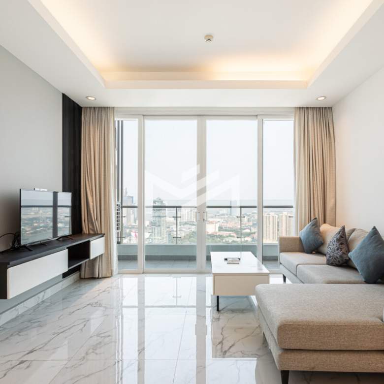 This corner unit on a high floor enjoys morning sun and stunning views of the Mekong River. The open living room extends to a balcony, creating a bright and airy space. The master bedroom features an attached bathroom with a bathtub, while the second room can serve as a study or a bedroom with a single bed.