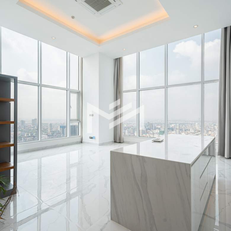 This luxury penthouse in expat-friendly BKK1 features an impressive 5-meter-high ceiling, offering 360-degree views of Phnom Penh and breathtaking sunset panoramas. Designed for modern elegance, the luxury kitchen includes a built-in oven and a spacious island with storage underneath. The unit is available semi-furnished, with an option for fully furnished upon request.
