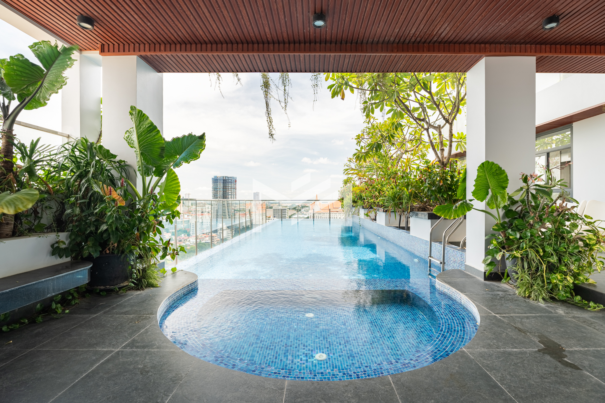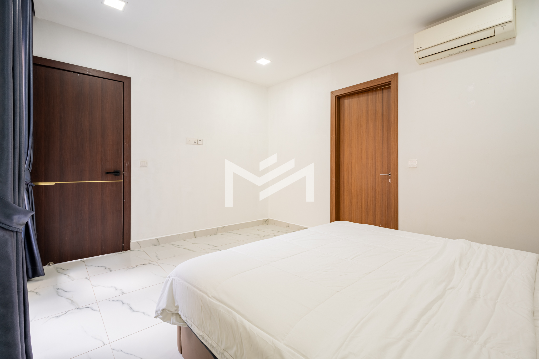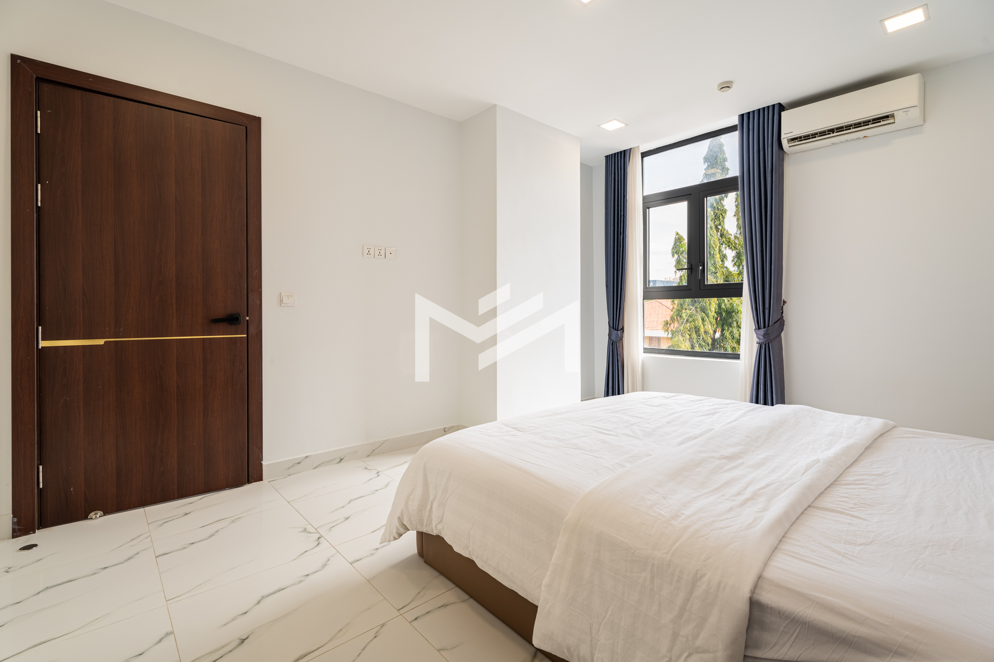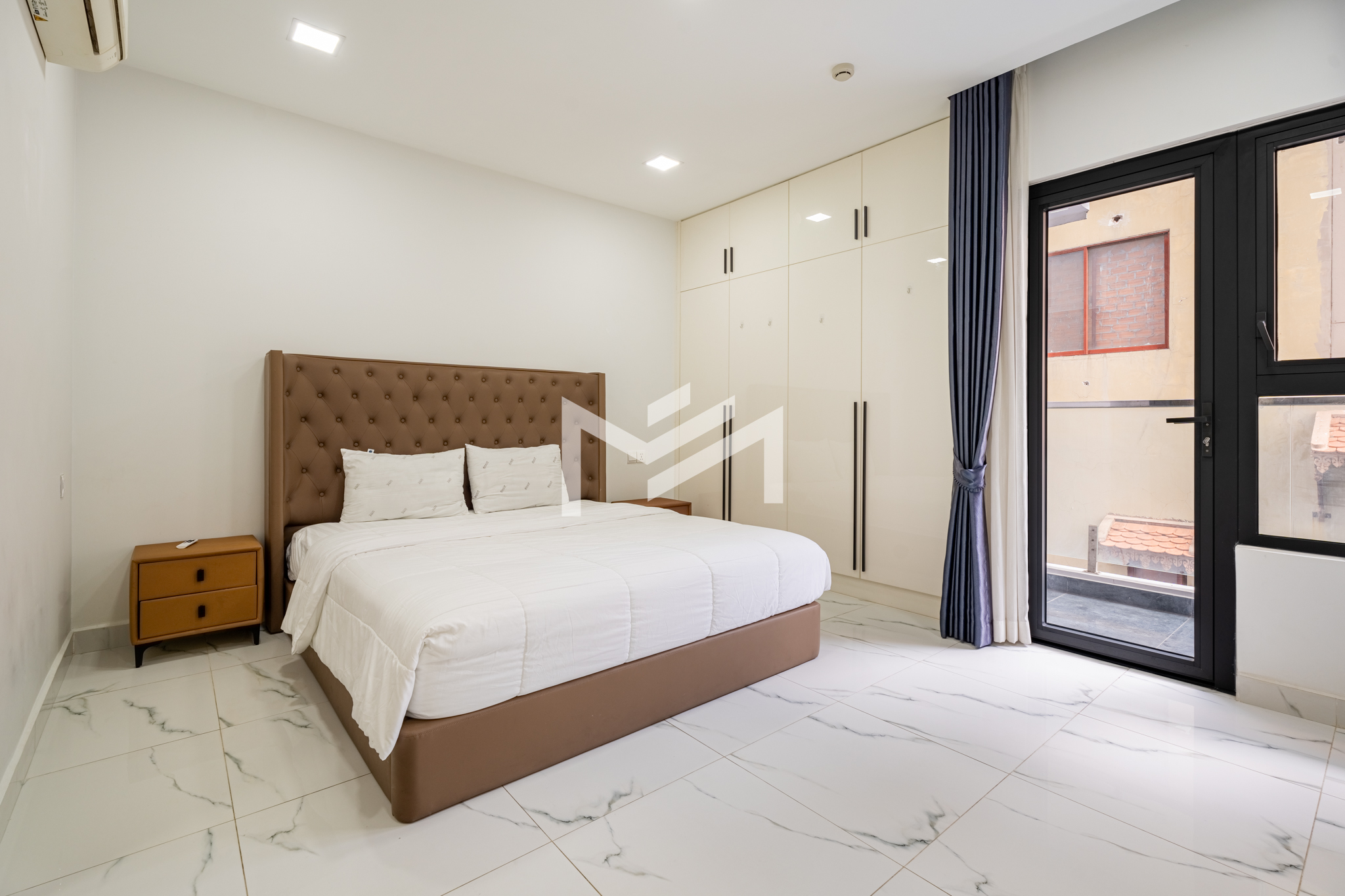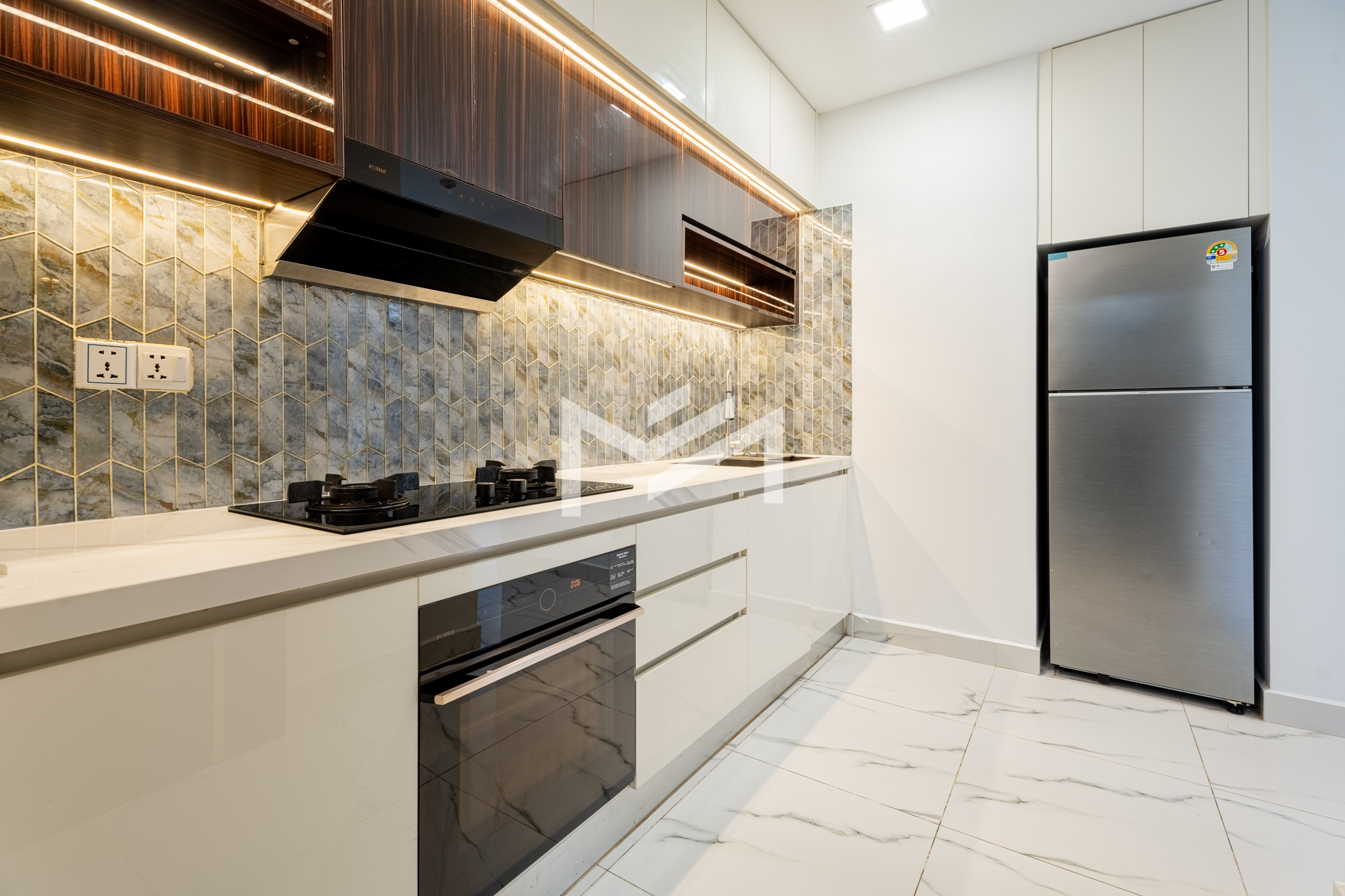 Modern design with an open living space and balcony. The kitchen comes fully equipped with a built-in oven. Large windows throughout the unit bring in plenty of natural light. Residents can enjoy access to a rooftop swimming pool, 24-hour security, and cleaning service. Located just south of BKK1 (about a 5-minute drive), this apartment offers great value — an ideal choice for singles or small families seeking a comfortable, modern home at a more economical price compared to the main expat area.
