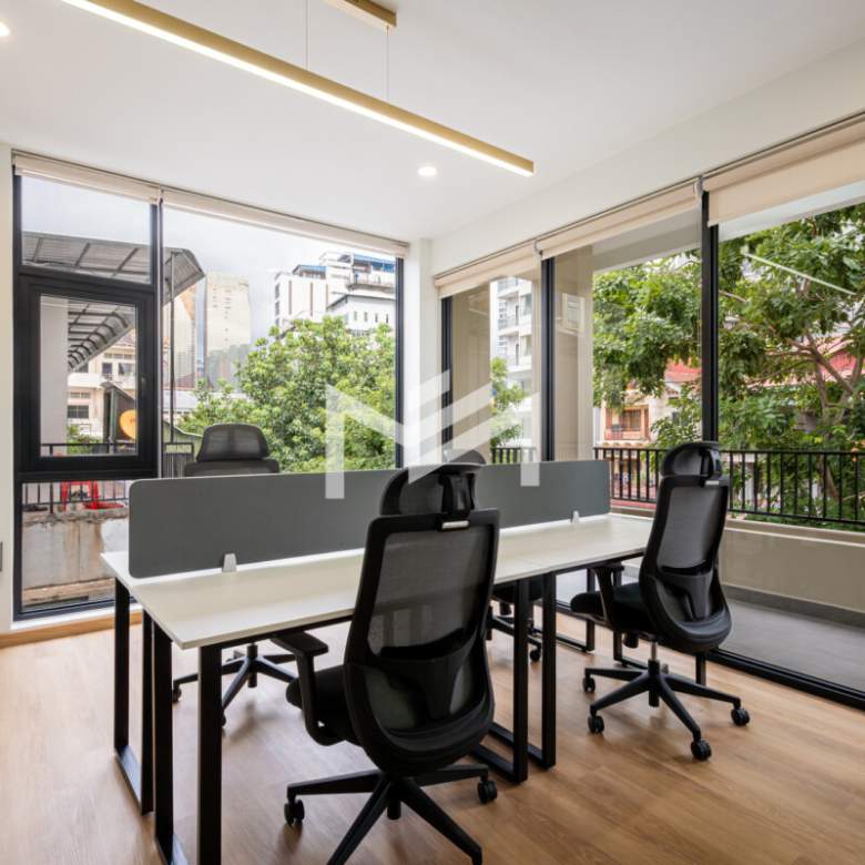 Furnished office with 4 workstations, document cabinet, and a private balcony. This bright unit comes move-in ready, complete with Wi-Fi and 1 car parking space. Ideally located near Independence Monument, AEON Mall, Super Duper, and Guardian Pharmacy—all within walking distance—and just 5 minutes from BKK1.