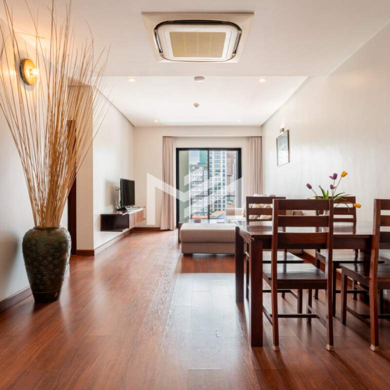 Very spacious 1-bedroom apartment featuring wooden floors, an open-plan living room, and a large kitchen filled with natural light and airflow. The generously sized bedroom comes with carpet flooring for added comfort. Fully equipped and serviced with cleaning and regular bedding changes. Residents enjoy a rooftop swimming pool, 24-hour security, and a central BKK1 location within a vibrant expat community.