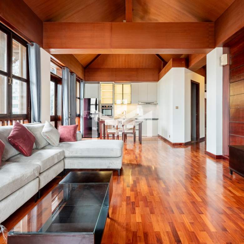 Spacious penthouse on the top floor of a low-rise residential building with only 6 floors. Featuring elegant wooden flooring, a large kitchen with built-in oven, and wide glass windows that fill the home with natural light. The residence offers a generously sized bedroom with a big closet and a modern bathroom complete with both overhead shower and bathtub.