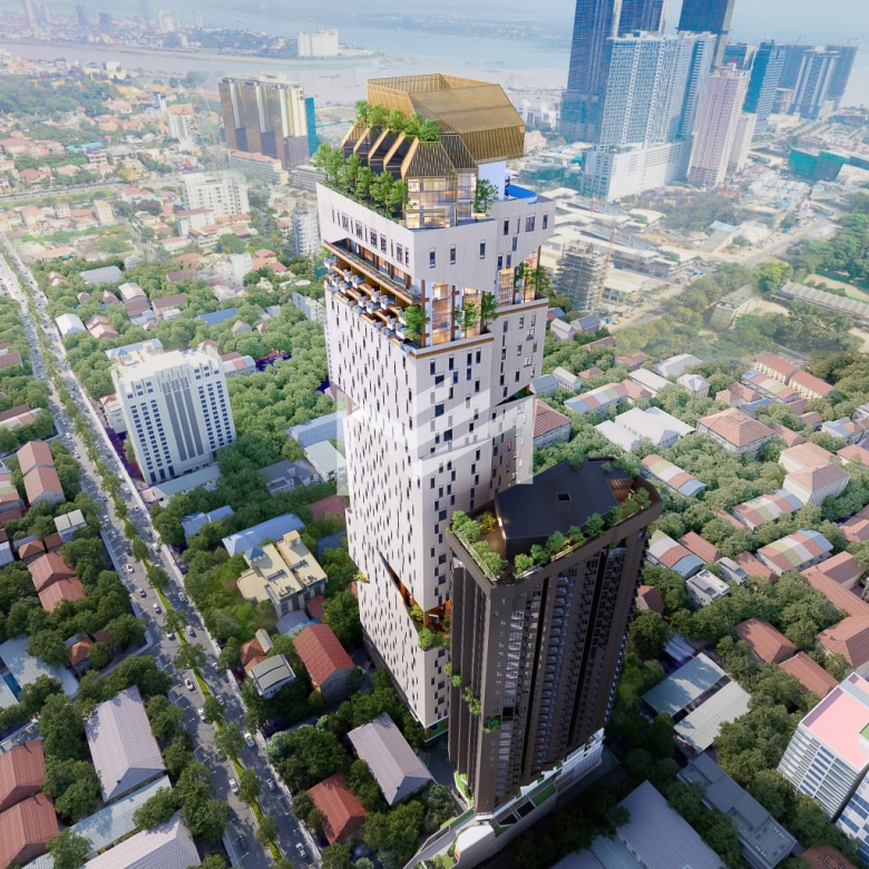Each unit includes raised flooring, air-conditioning provisions, an electronic meter, shared pantry, and disability-accessible bathrooms. The project also offers public green spaces, a retail podium, a link bridge to ODOM Living, six sky villages, a luxury hotel, and an exclusive club.