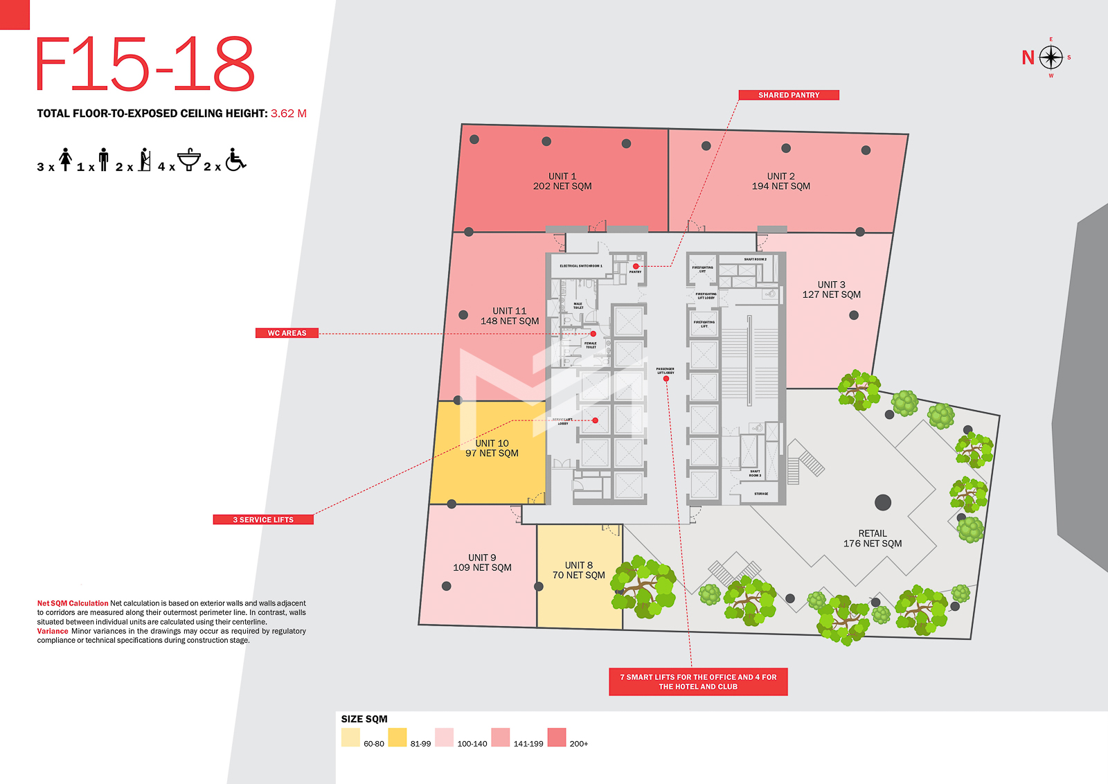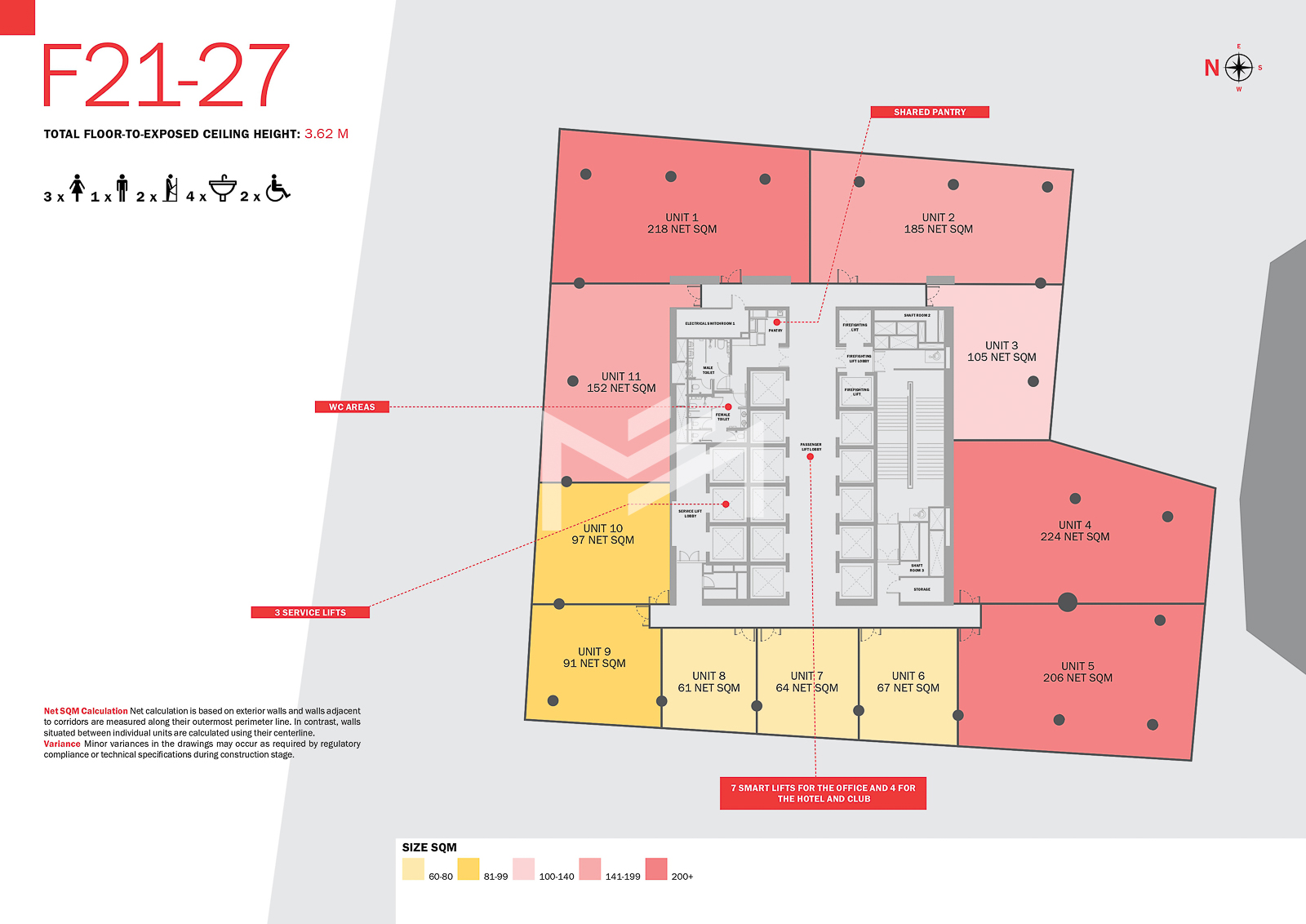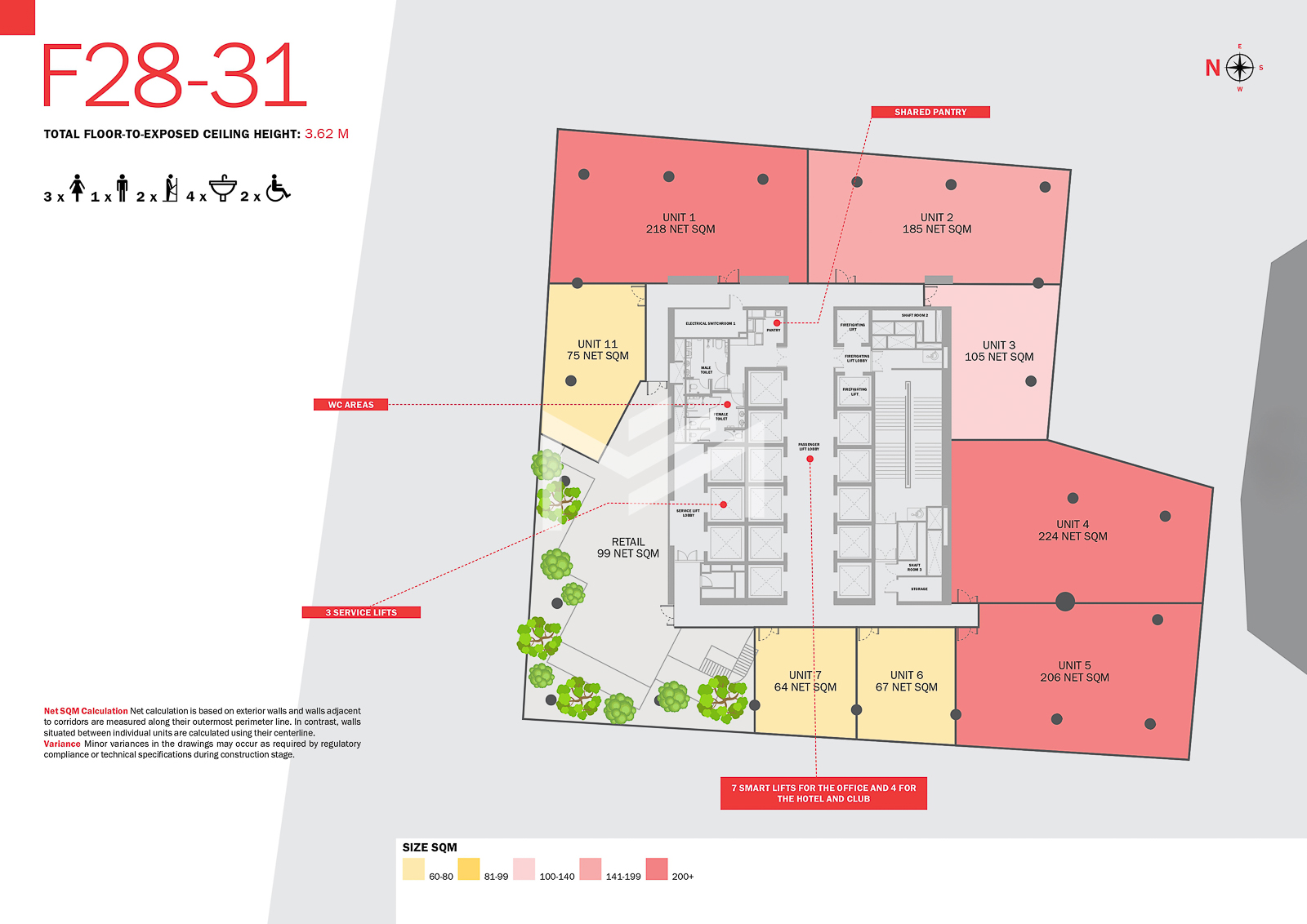 Odom Tower is the only strata-title office space available for sale, offering freehold ownership in a Grade A building. The development features five floors of retail space, underground parking, and office units from Levels 5 to 38, with sizes ranging from 62 sqm to 217 sqm net, or up to 1,515 sqm for a whole floor.