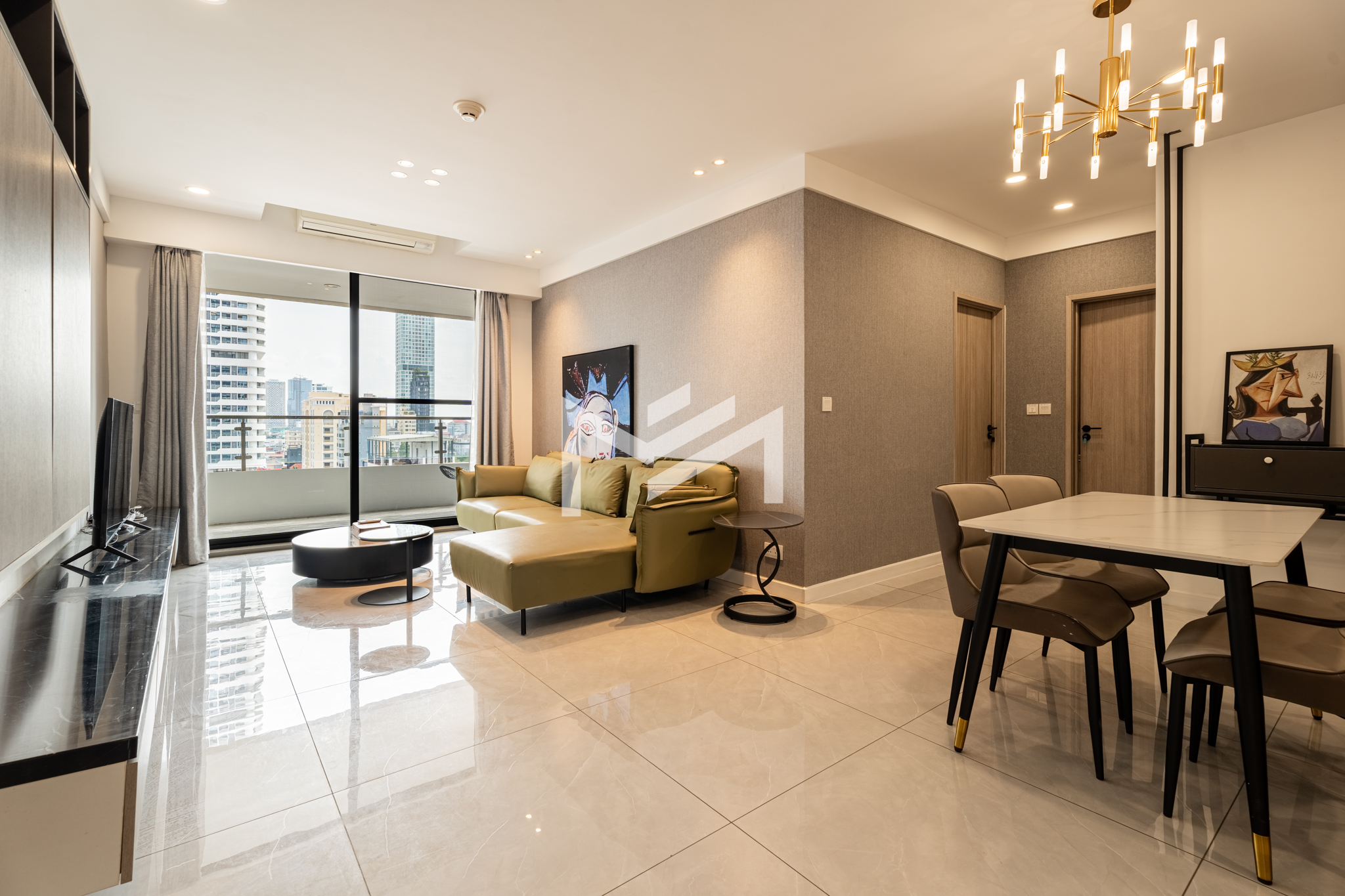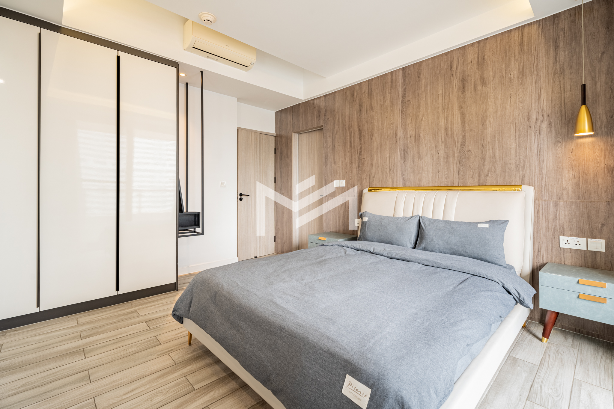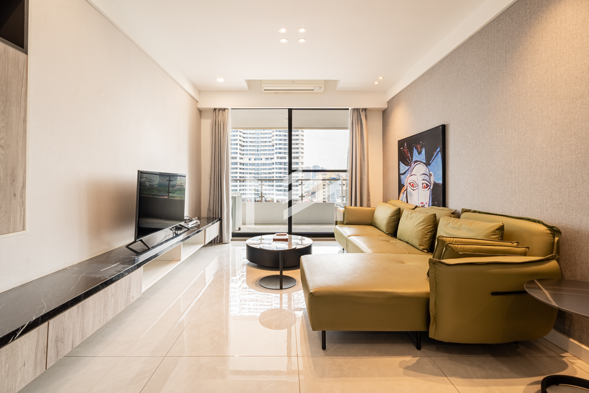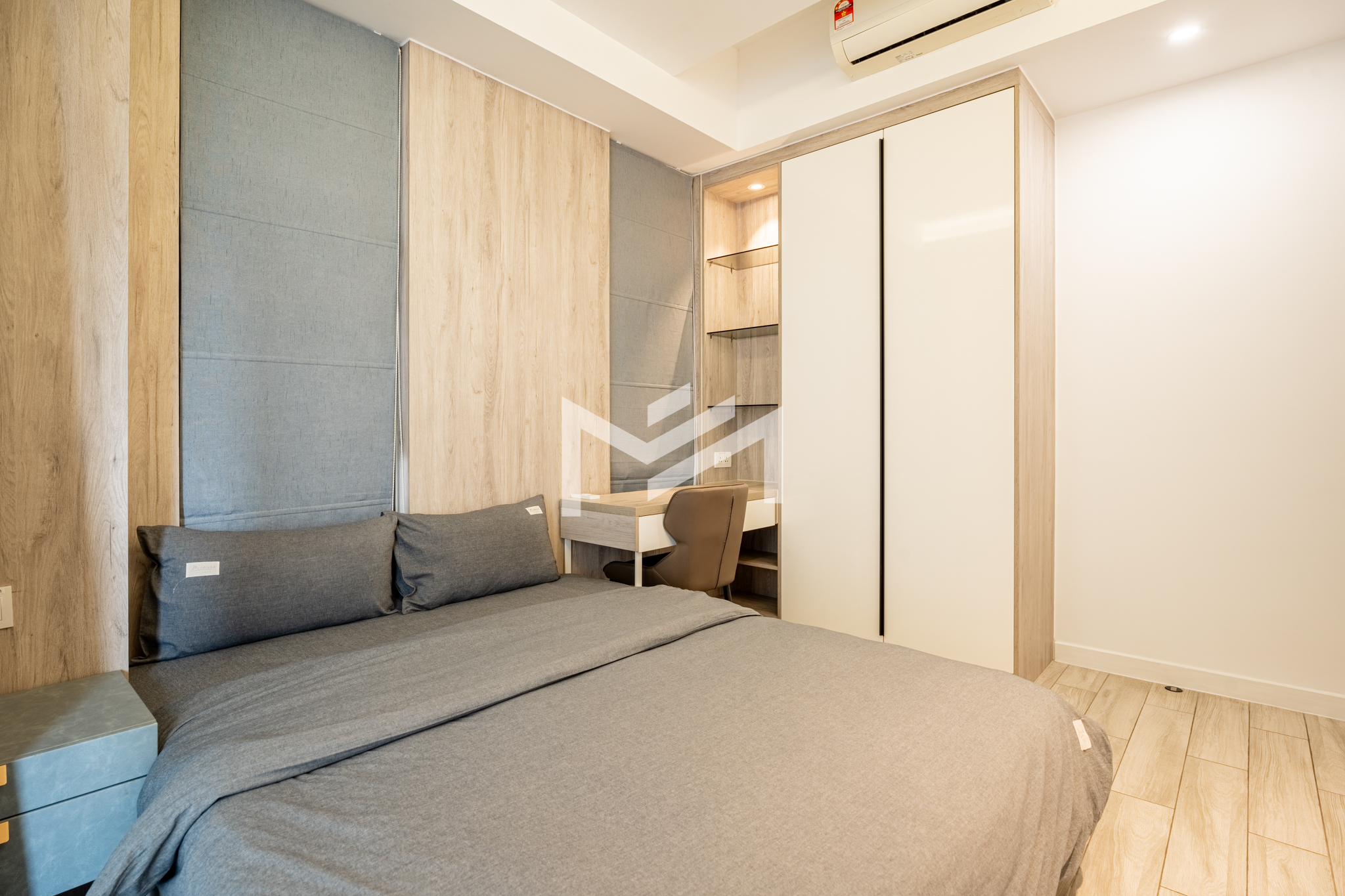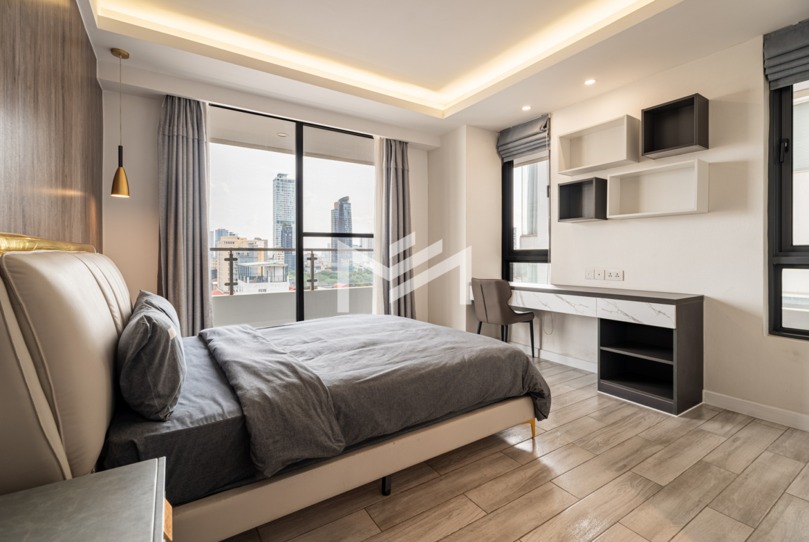 Compact 2-bedroom unit on the 10th floor with clear city views of the BKK1 area. Suitable for couples, small families, or colleagues sharing together. Fully equipped and ready to move in—just bring your suitcase. Services are available within the building, offering convenience for tenants who prefer living in the heart of Phnom Penh without needing a vehicle. Enjoy access to the gym and swimming pool, included in the rent. Expat-friendly residence in prime BKK1.