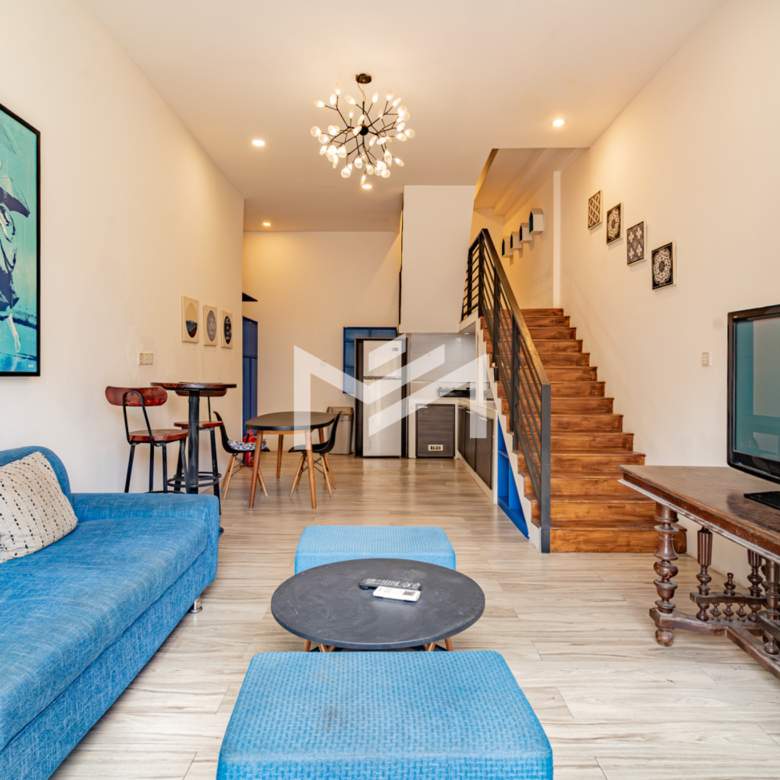 A charming flat with colonial-style exterior and newly renovated interior. This duplex home features a characterful mix of modern furnishings and classic details. Bright and airy with plenty of natural light and good airflow throughout. Easy stair access, located in the prime Wat Phnom area within Phnom Penh CBD—just steps away from Exchange Square, Vattanac Capital, and Wat Phnom.