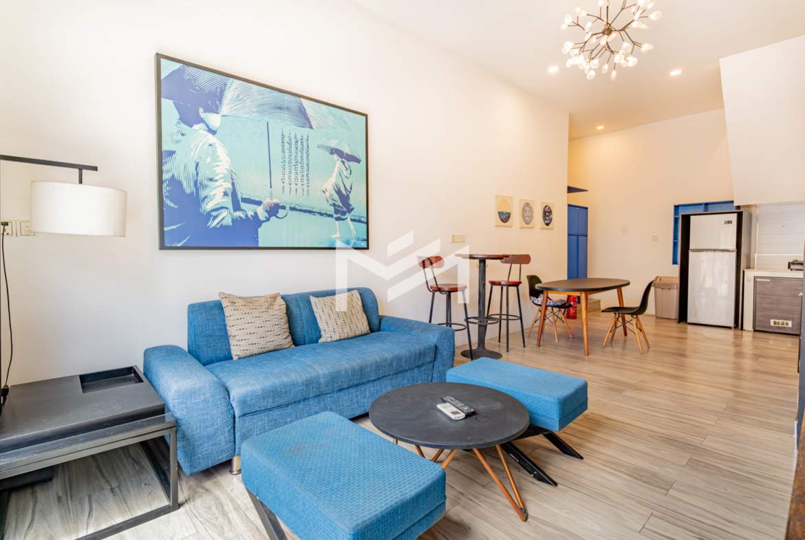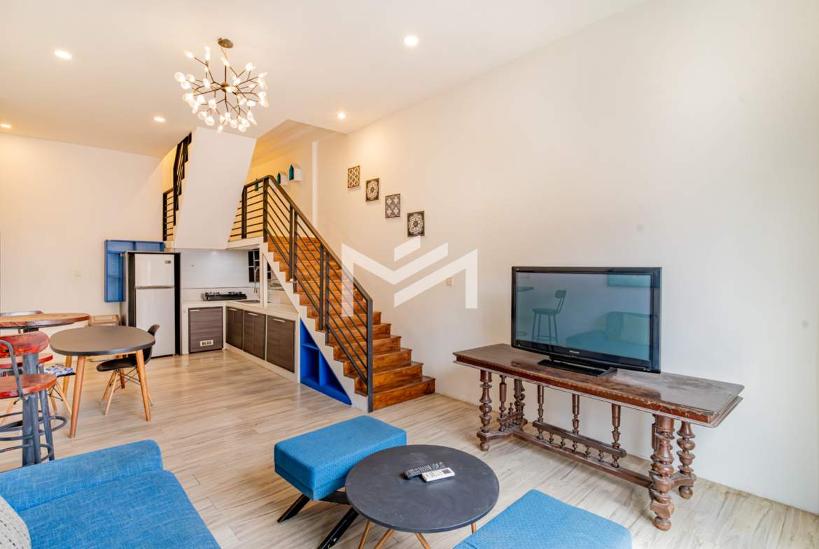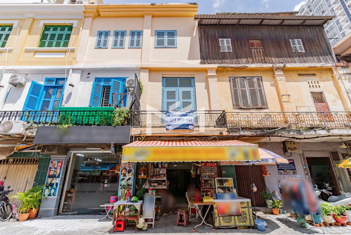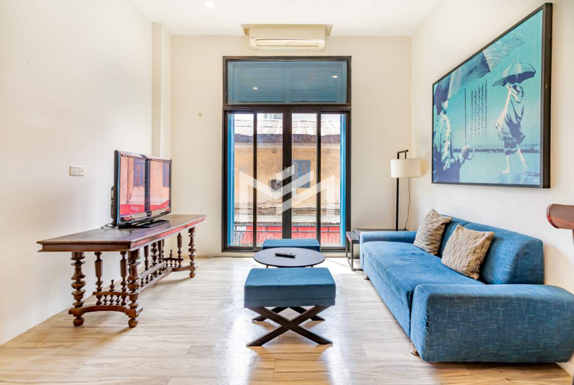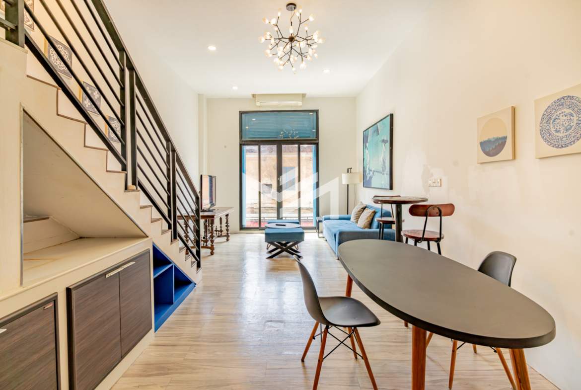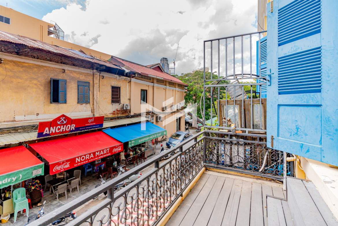 A charming flat with colonial-style exterior and newly renovated interior. This duplex home features a characterful mix of modern furnishings and classic details. Bright and airy with plenty of natural light and good airflow throughout. Easy stair access, located in the prime Wat Phnom area within Phnom Penh CBD—just steps away from Exchange Square, Vattanac Capital, and Wat Phnom.