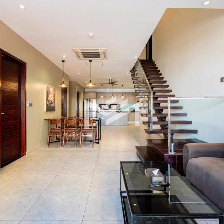 Spacious duplex unit featuring three bedrooms on the lower floor and a grand master suite on the upper level, complete with a luxurious walk-in closet and ensuite bathroom. The upper floor offers expansive space with stunning views overlooking the rooftop pool. Ideal for families seeking comfort and privacy, the property is located in a peaceful local neighborhood in BKK2, just approximately 5 minutes from BKK1.