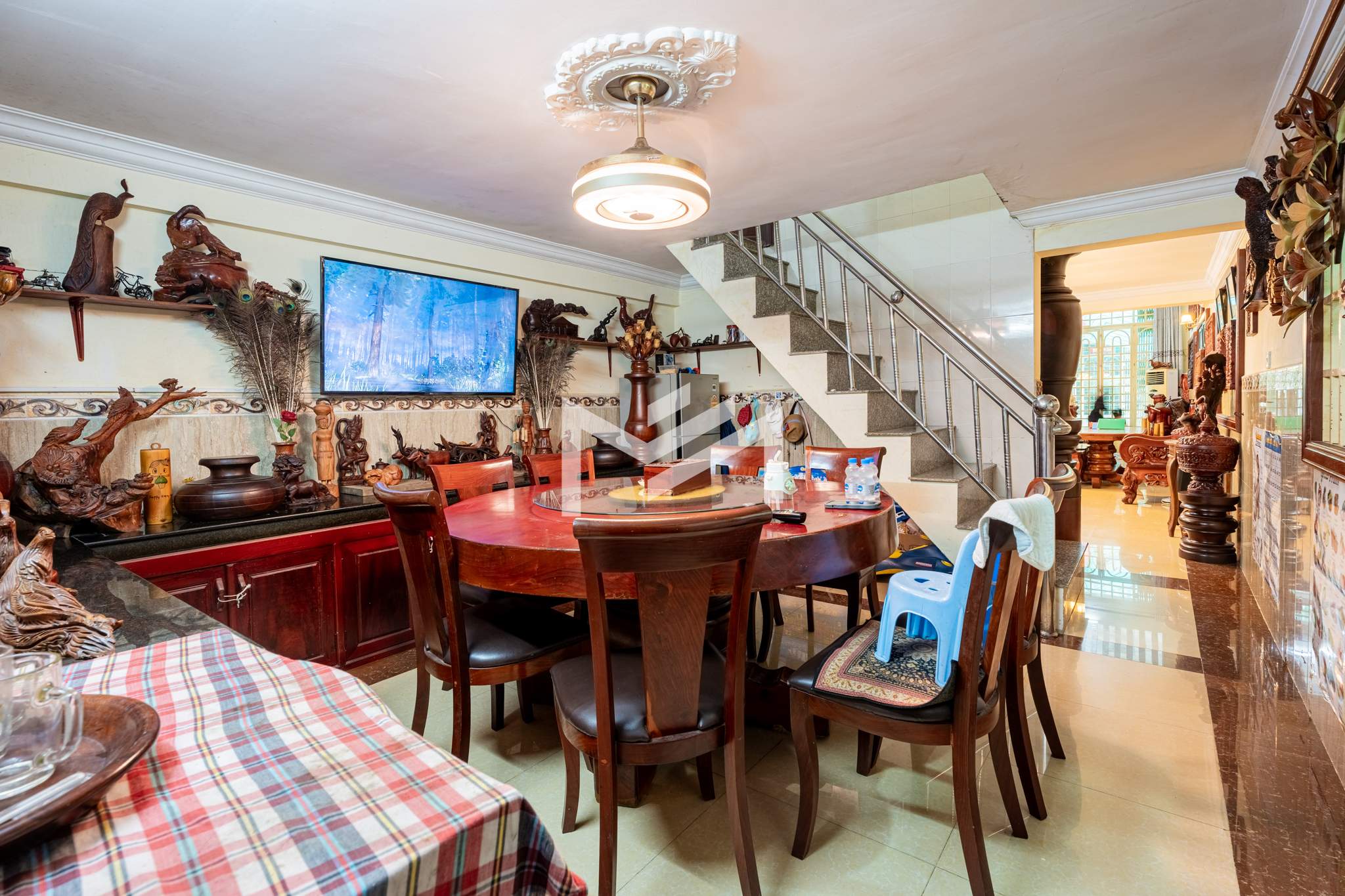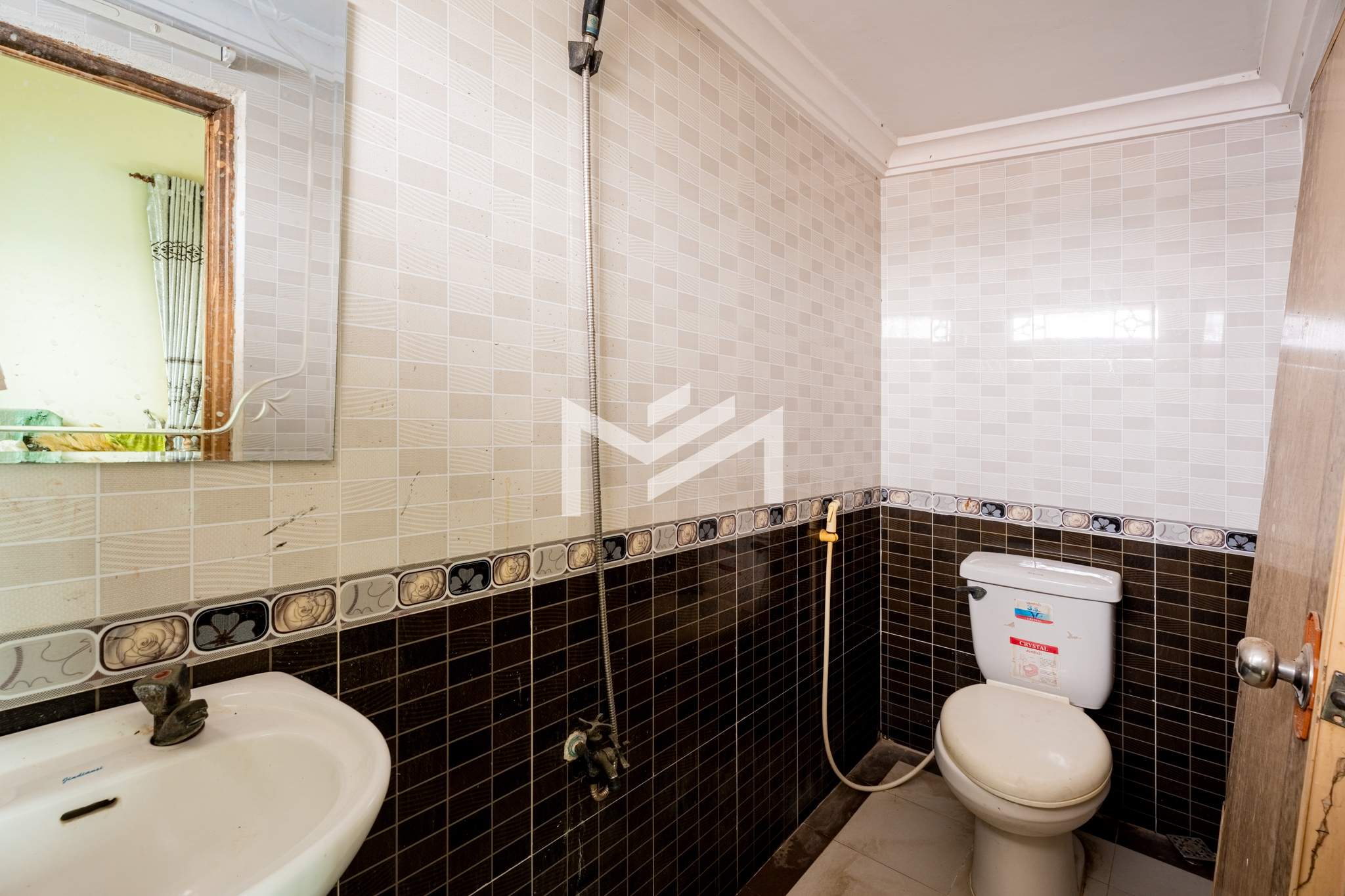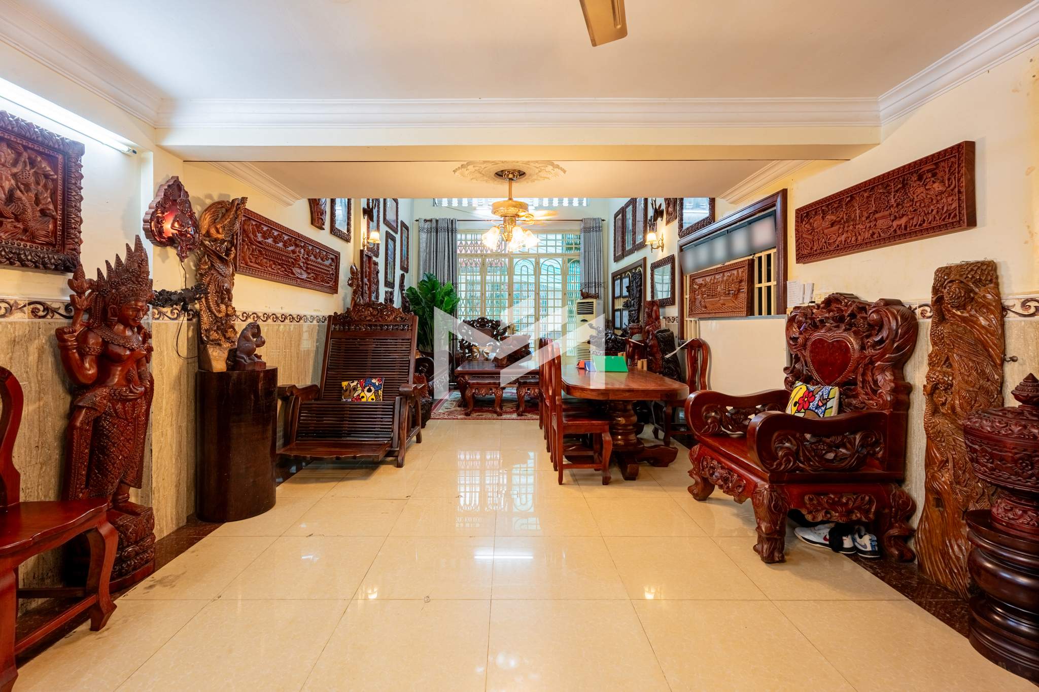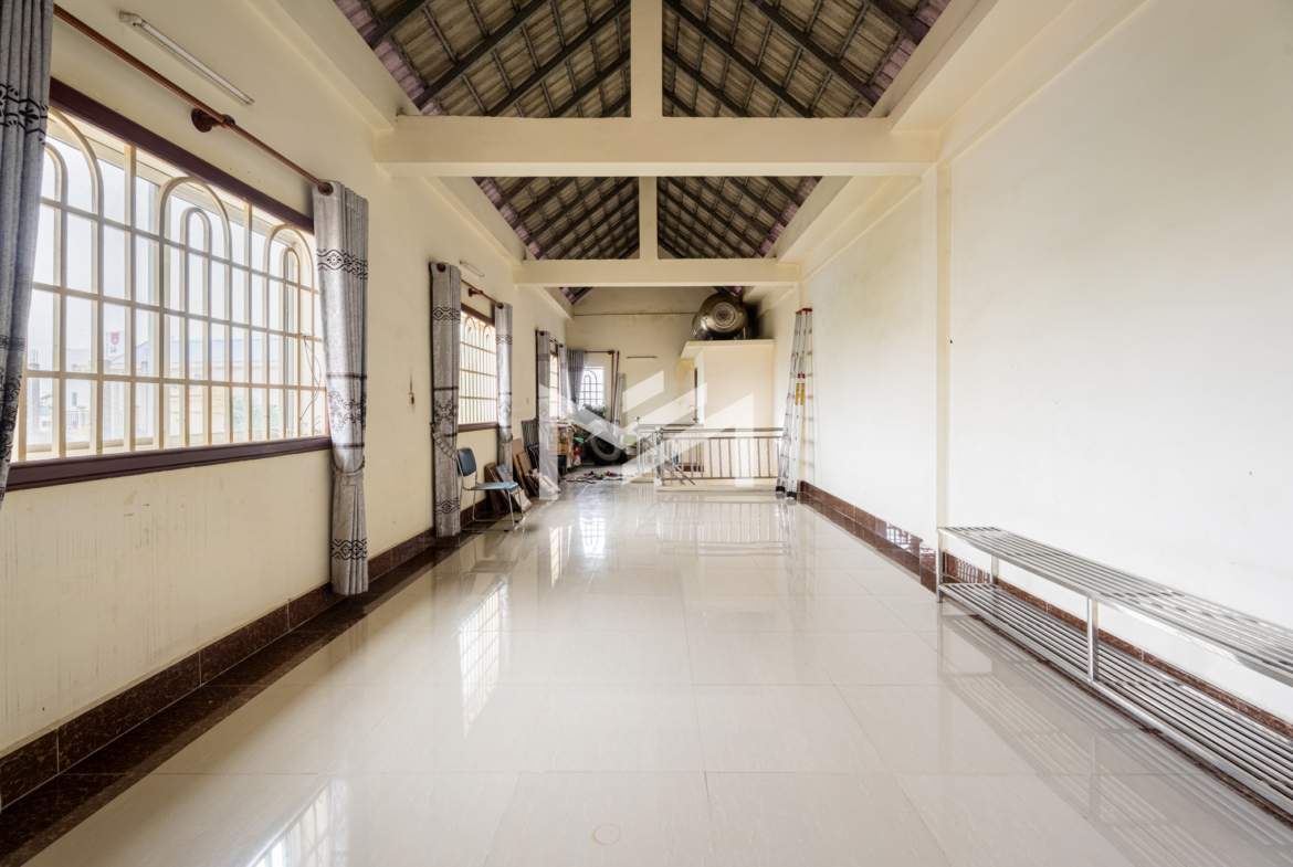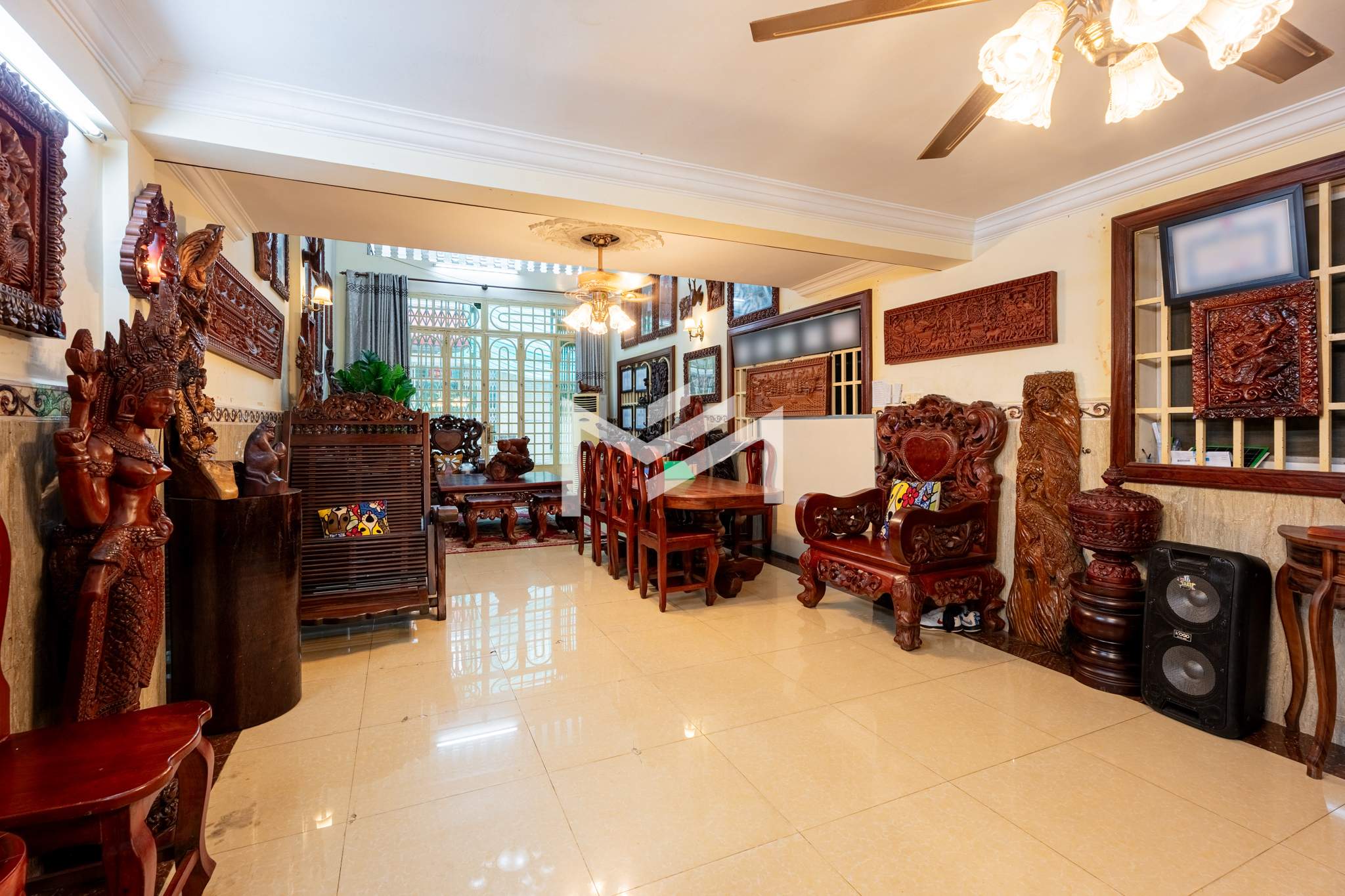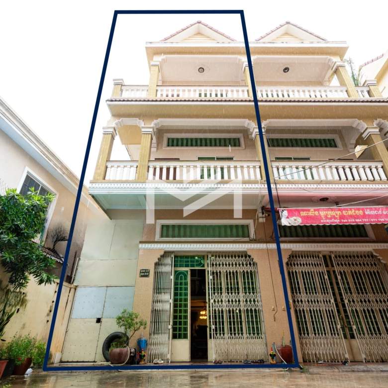 A Cambodian-style Pteas Lveng (Flat House) with the typical “I-shape” layout. The ground floor offers an open hall with a back kitchen and a small backyard. Additional levels include a mezzanine floor, first floor, second floor, and an open rooftop. There is about 2m of front yard space for parking. This is a great option for buyers looking for an affordable house to renovate and live in, located close to the city yet within a quiet, low-density, and purely local neighborhood. The property comes with a hard title and is conveniently situated near the Russian Market area.