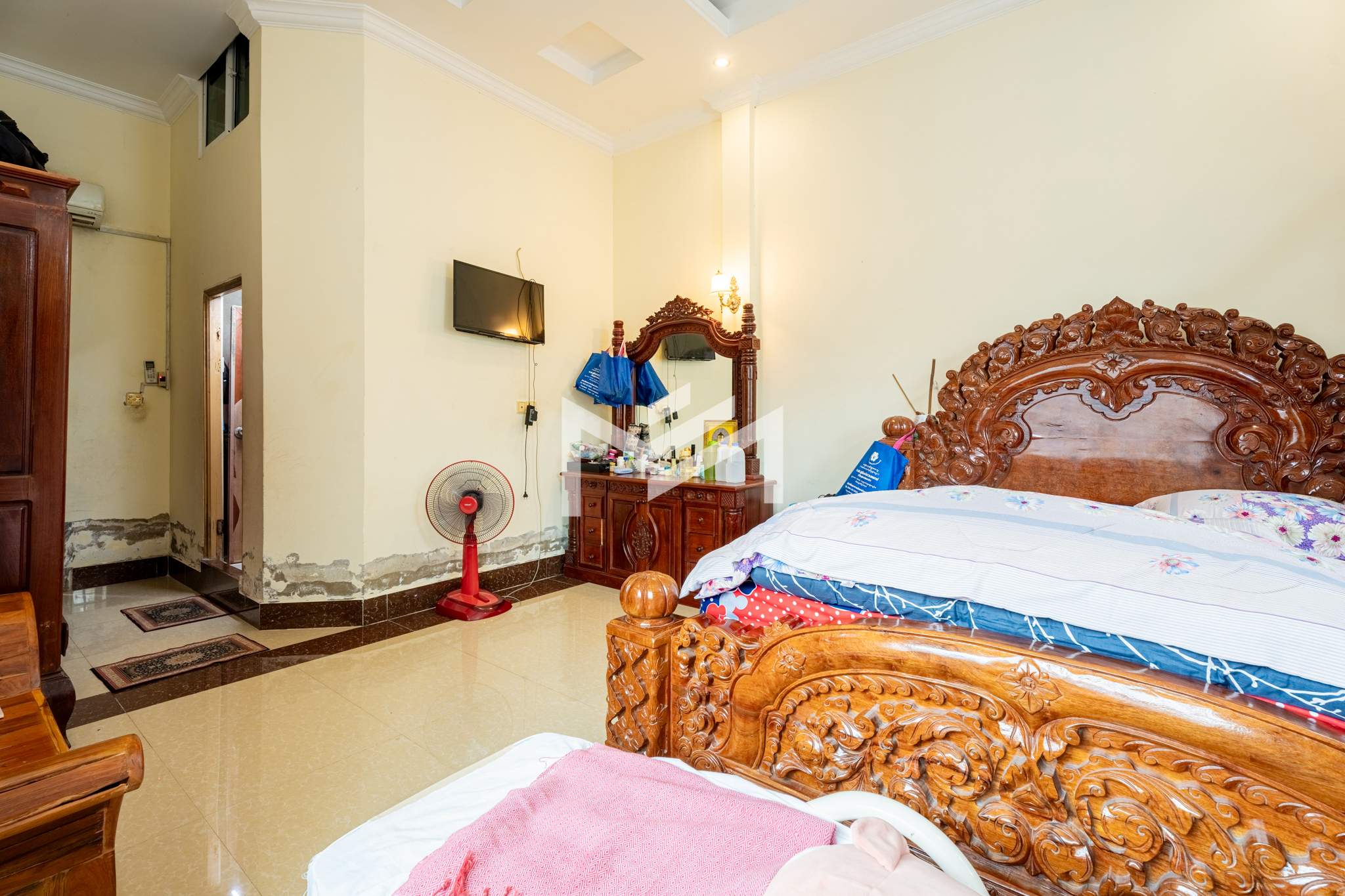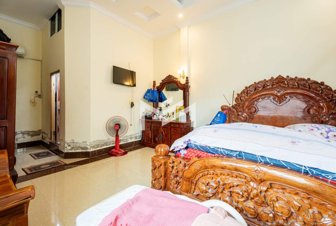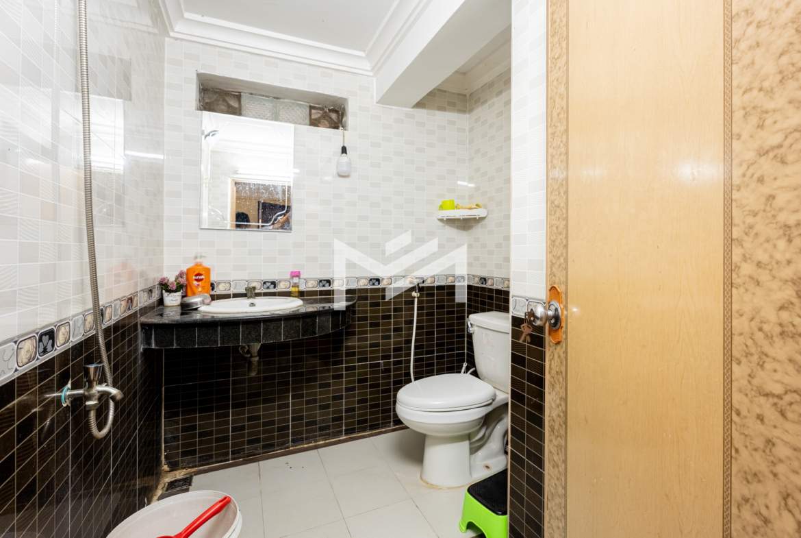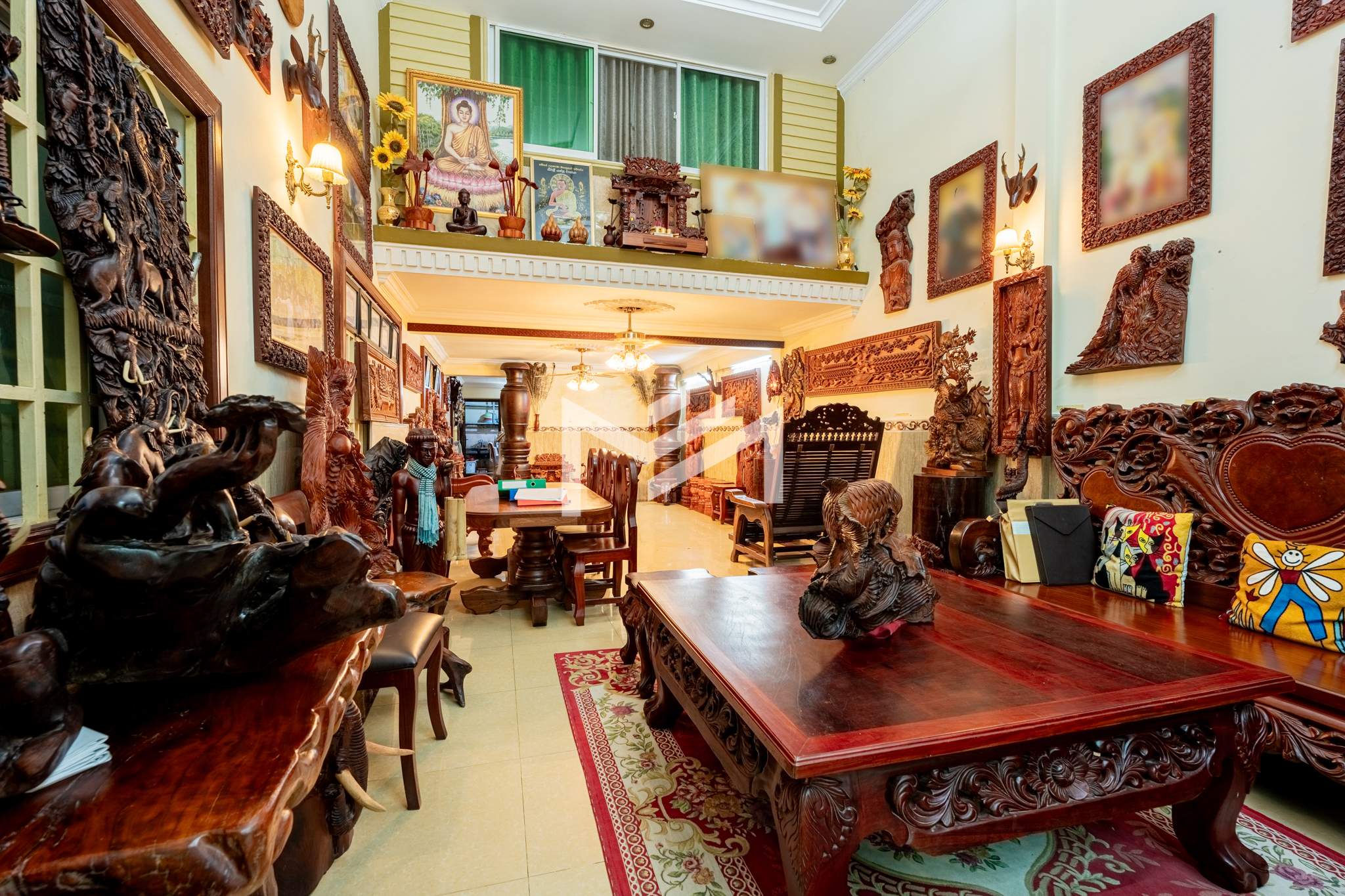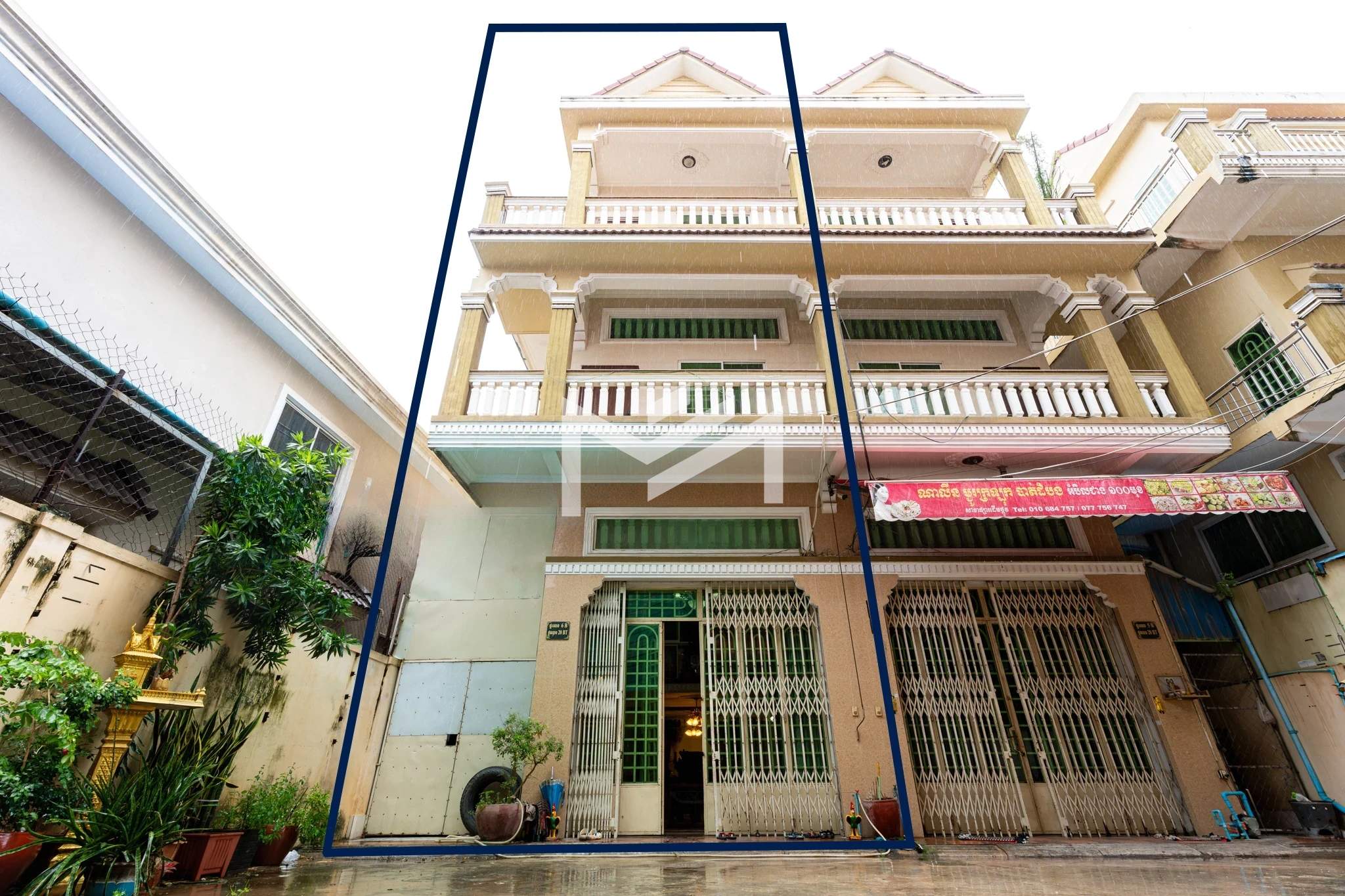 A Cambodian-style Pteas Lveng (Flat House) with the typical “I-shape” layout. The ground floor offers an open hall with a back kitchen and a small backyard. Additional levels include a mezzanine floor, first floor, second floor, and an open rooftop. There is about 2m of front yard space for parking. This is a great option for buyers looking for an affordable house to renovate and live in, located close to the city yet within a quiet, low-density, and purely local neighborhood. The property comes with a hard title and is conveniently situated near the Russian Market area.