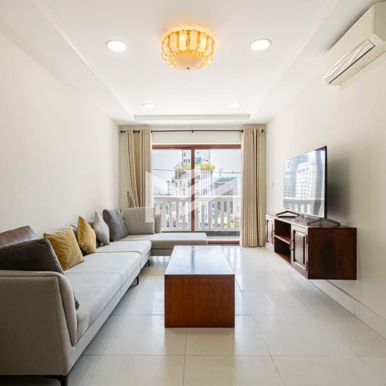 This I-shaped unit features a closed kitchen at the entrance, followed by the second bedroom and master bedroom with an en-suite bathroom. The living room runs parallel, extending to the front balcony, creating an open and airy feel. A well-maintained unit, perfect for comfortable living. Located in the heart of BKK1, this apartment provides unparalleled convenience—everything you need is just steps away, eliminating the need for a vehicle.