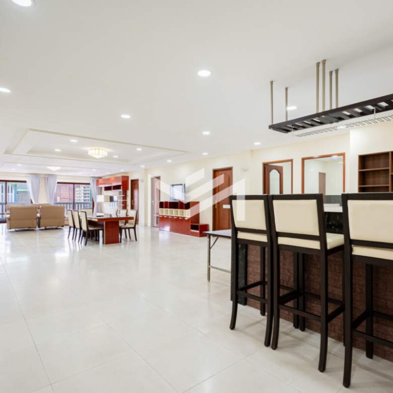 Spacious living room with a luxurious open kitchen equipped with an oven, dishwasher, and large two-door fridge. Each bedroom offers generous space, and the unit exudes a penthouse feel. Located on a high floor with excellent views, in a well-managed building in the heart of BKK1, within an expat-friendly neighborhood.