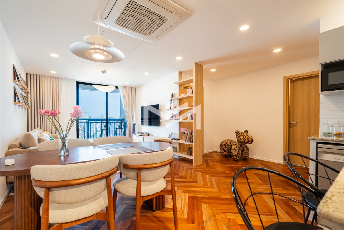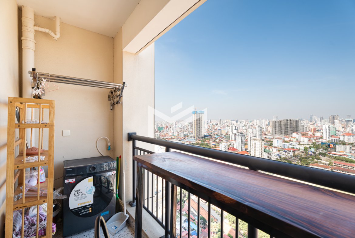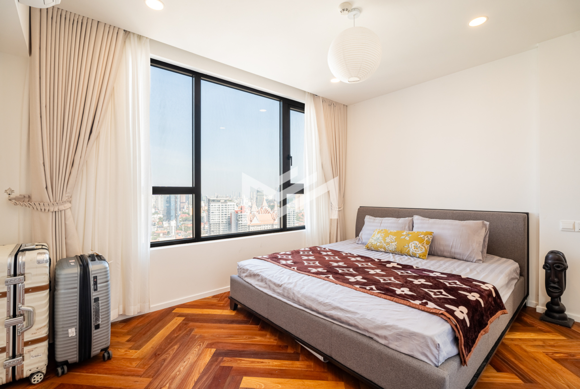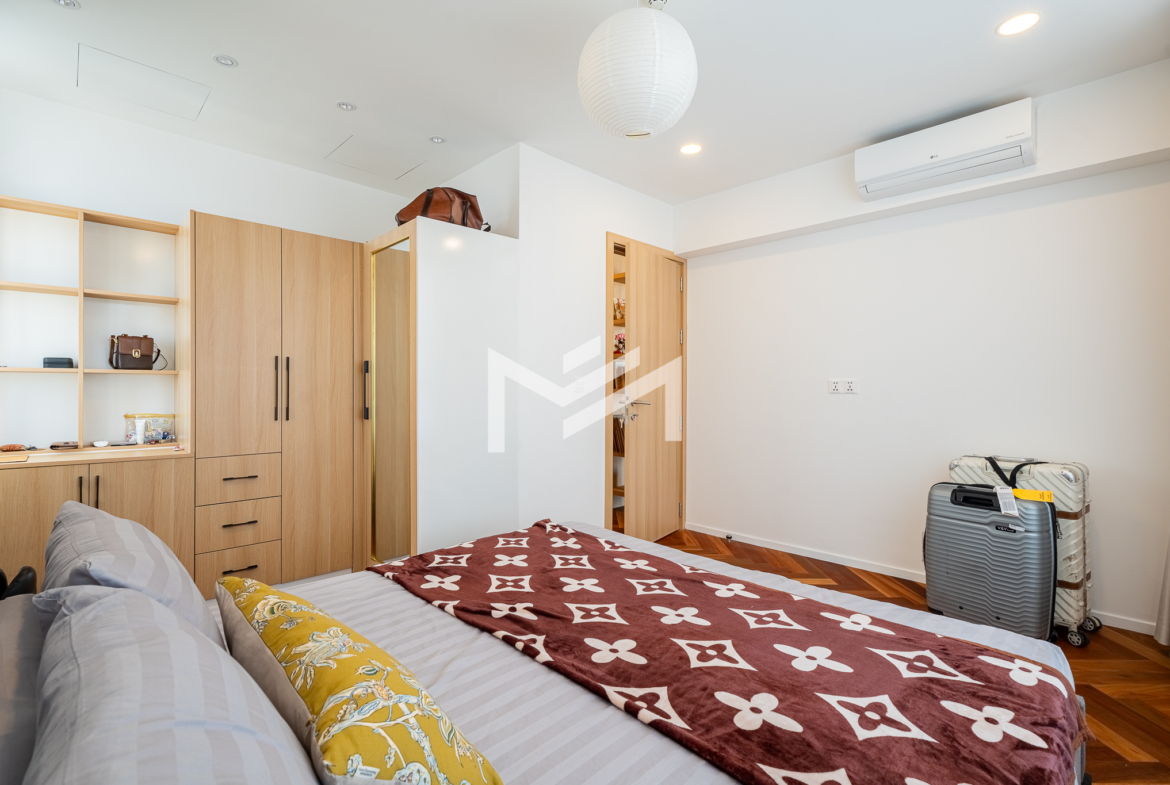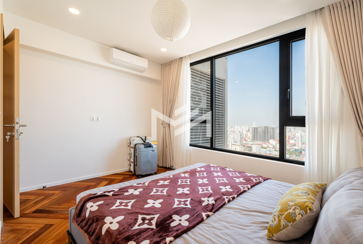 Well-designed and cozy 2-bedroom unit featuring elegant Korean wood flooring and a modern western kitchen equipped with a built-in oven and dishwasher. The unit offers large-capacity ceiling air-conditioning, a balcony off the living room fitted with a washing machine and clothes rack, and ample built-in storage throughout. Fully furnished and ready to move in, ideal for long-term living. Situated on a high floor with excellent open views, residents enjoy premium amenities including a gym, swimming pool, jogging area, and a green, well-planned community. Conveniently located south of BKK1, just a 5-minute drive, offering both tranquility and easy access to city conveniences. A brand-new unit with great views, a pleasant green environment, and an affordable price point—an excellent option for comfortable short or long-term residence.