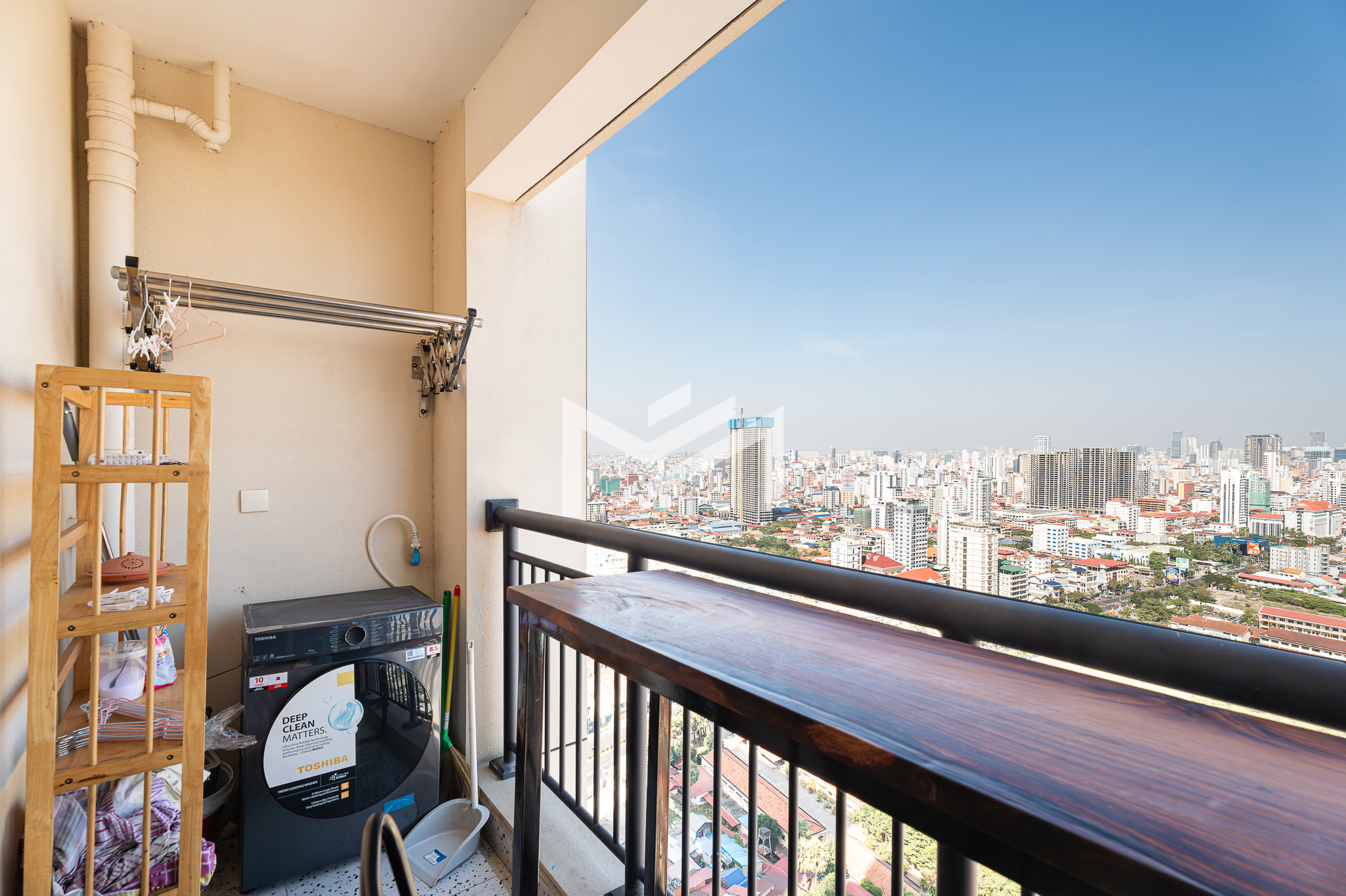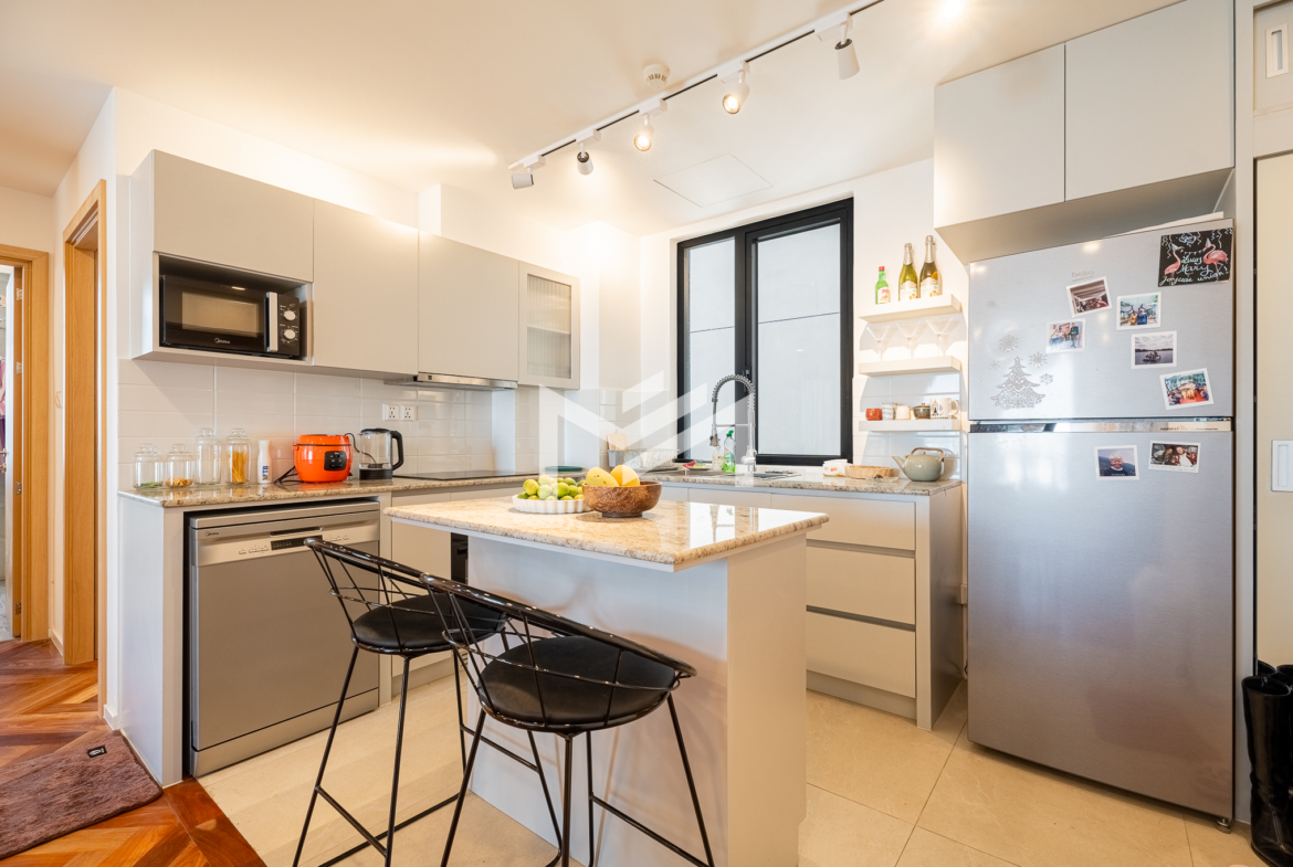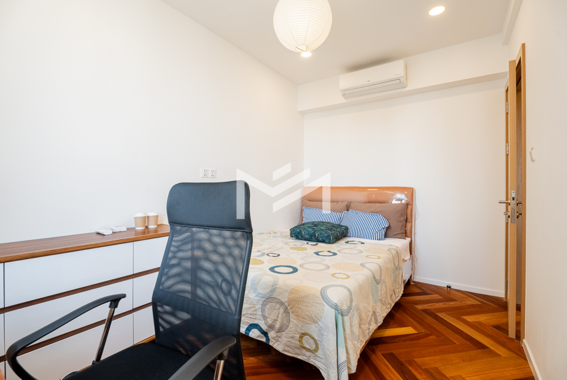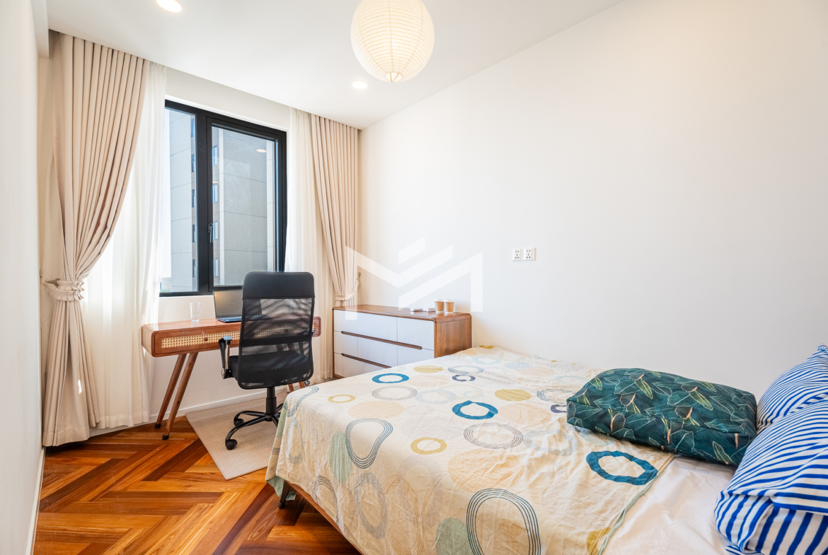 Well-designed and cozy 2-bedroom unit featuring elegant Korean wood flooring and a modern western kitchen equipped with a built-in oven and dishwasher. The unit offers large-capacity ceiling air-conditioning, a balcony off the living room fitted with a washing machine and clothes rack, and ample built-in storage throughout. Fully furnished and ready to move in, ideal for long-term living. Situated on a high floor with excellent open views, residents enjoy premium amenities including a gym, swimming pool, jogging area, and a green, well-planned community. Conveniently located south of BKK1, just a 5-minute drive, offering both tranquility and easy access to city conveniences. A brand-new unit with great views, a pleasant green environment, and an affordable price point—an excellent option for comfortable short or long-term residence.