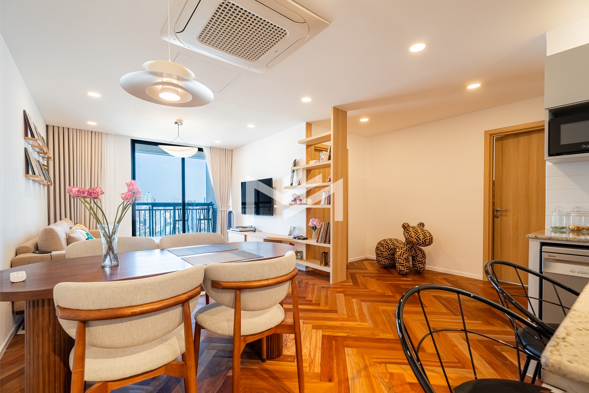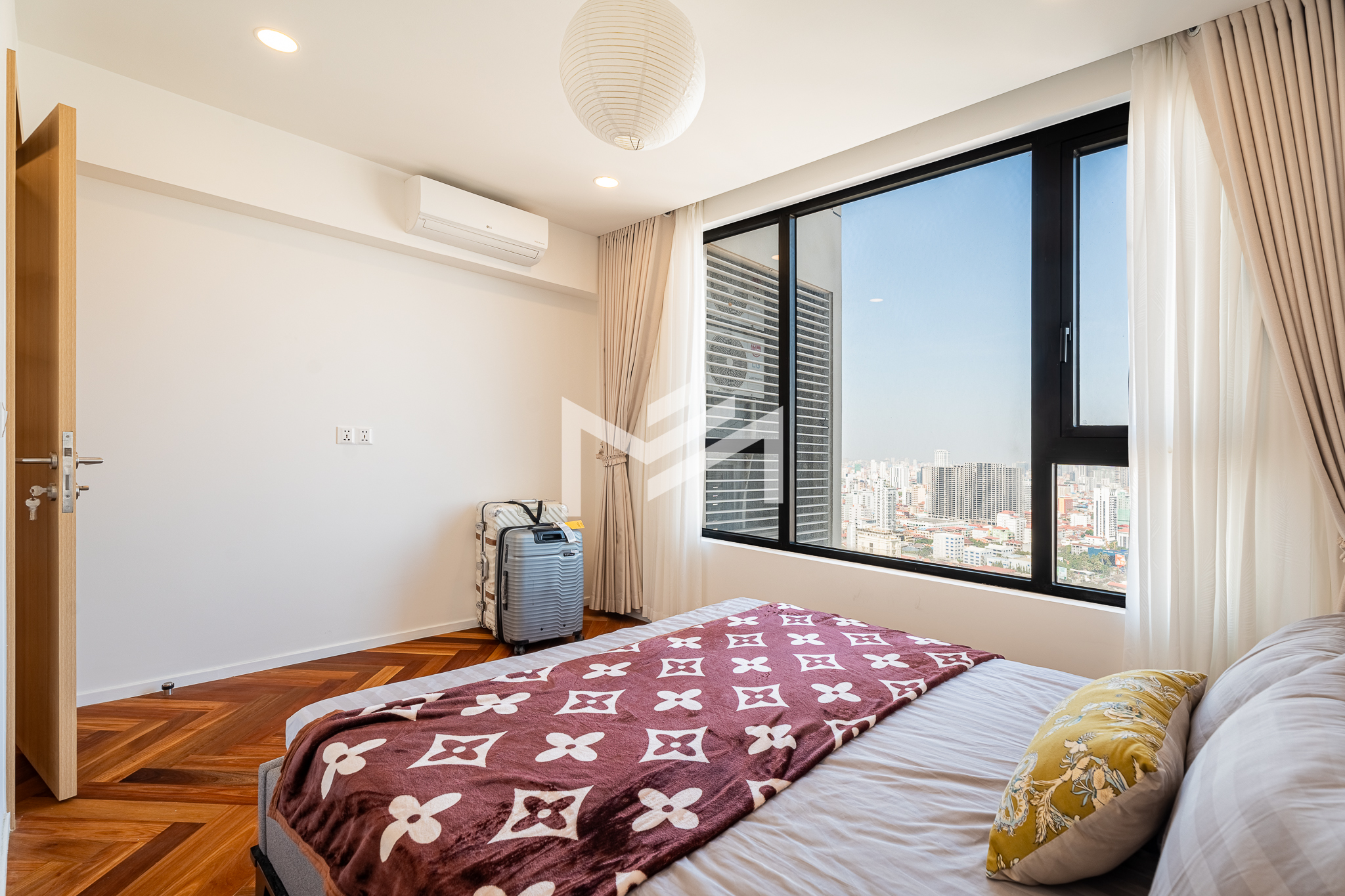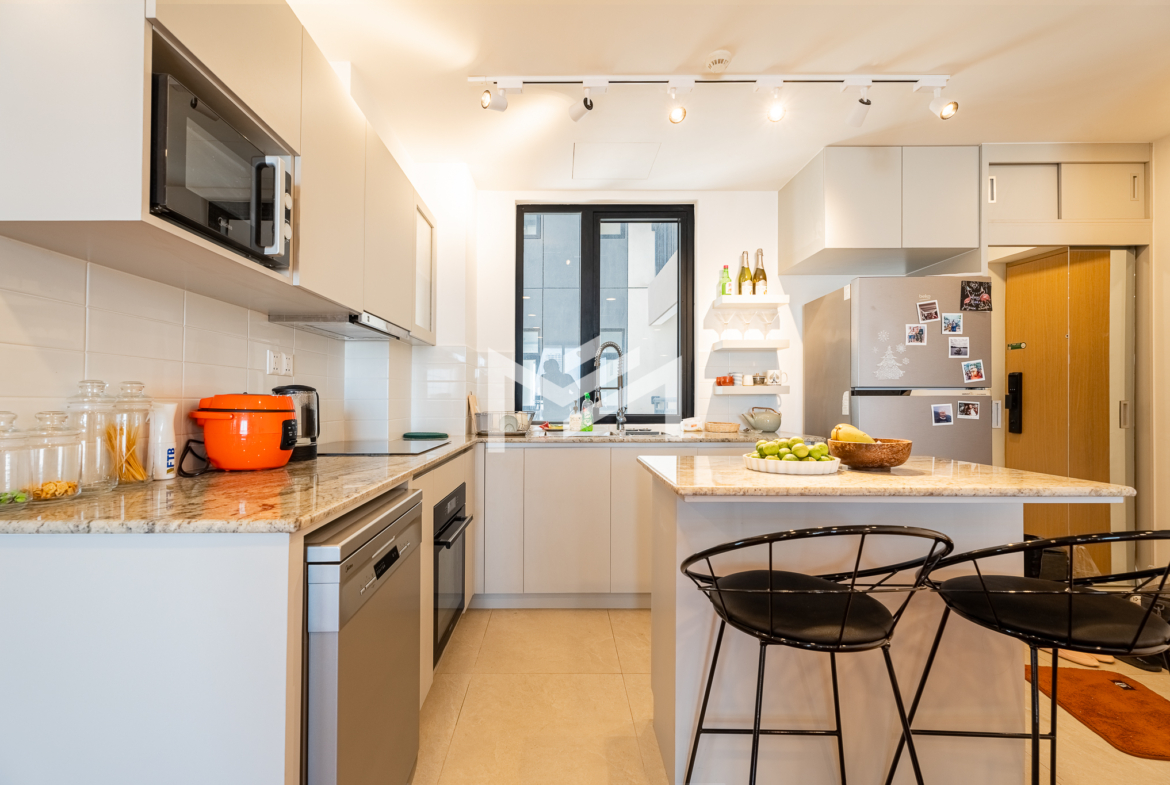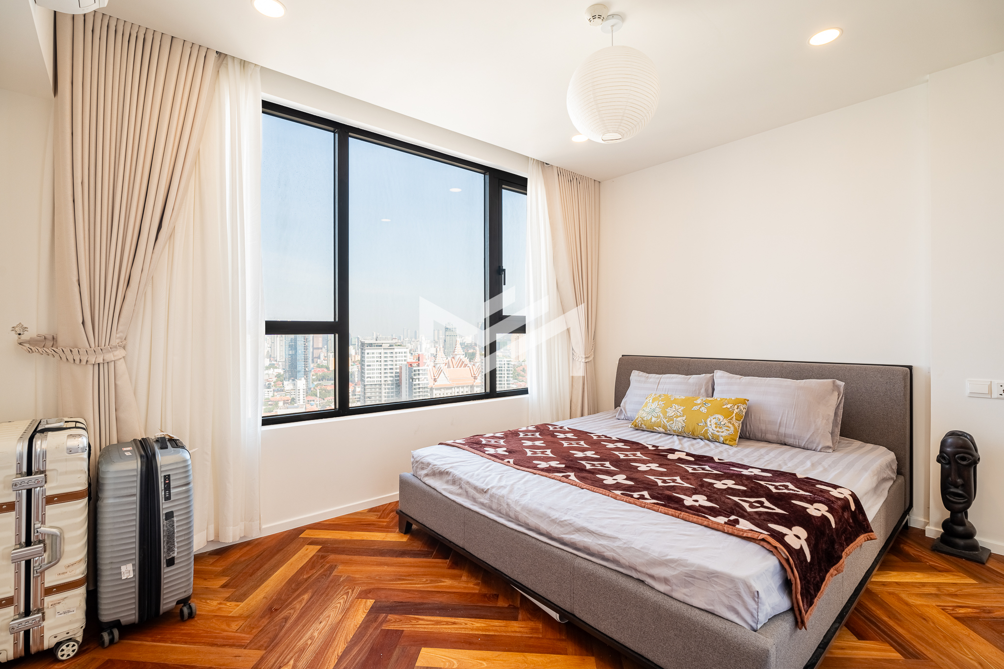 Well-designed and cozy 2-bedroom unit featuring elegant Korean wood flooring and a modern western kitchen equipped with a built-in oven and dishwasher. The unit offers large-capacity ceiling air-conditioning, a balcony off the living room fitted with a washing machine and clothes rack, and ample built-in storage throughout. Fully furnished and ready to move in, ideal for long-term living. Situated on a high floor with excellent open views, residents enjoy premium amenities including a gym, swimming pool, jogging area, and a green, well-planned community. Conveniently located south of BKK1, just a 5-minute drive, offering both tranquility and easy access to city conveniences. A brand-new unit with great views, a pleasant green environment, and an affordable price point—an excellent option for comfortable short or long-term residence.