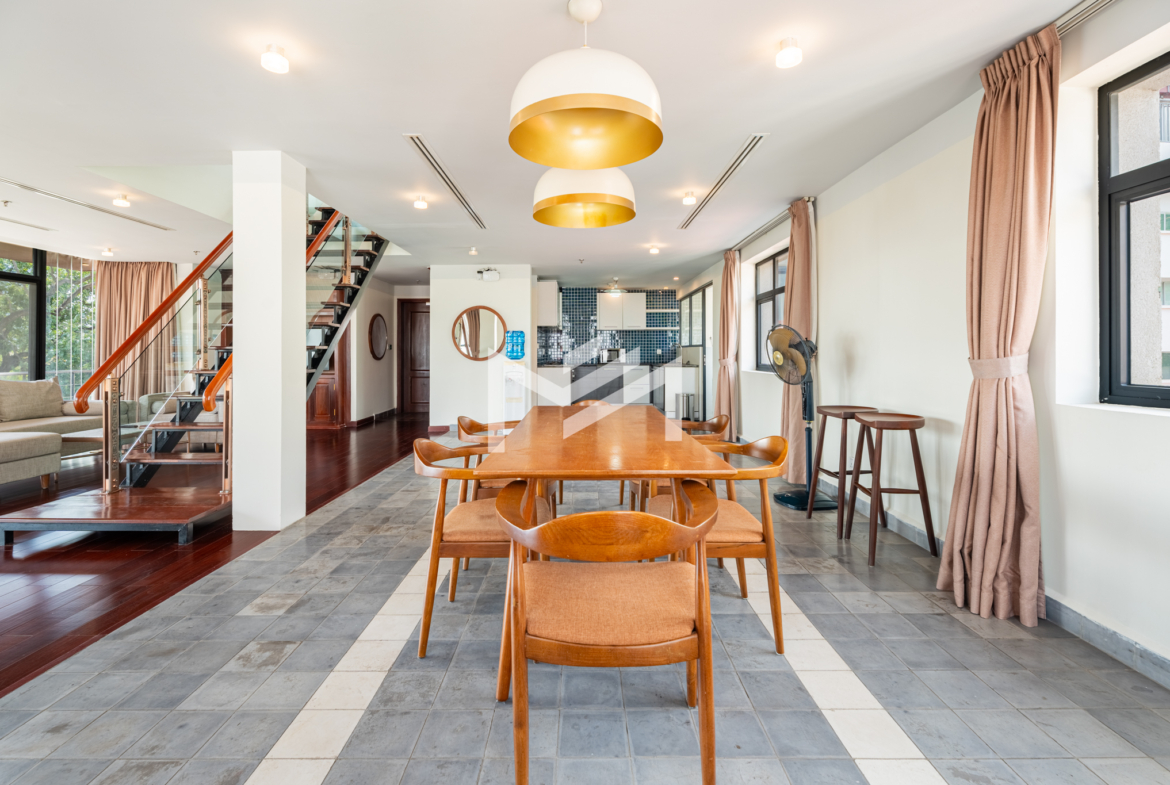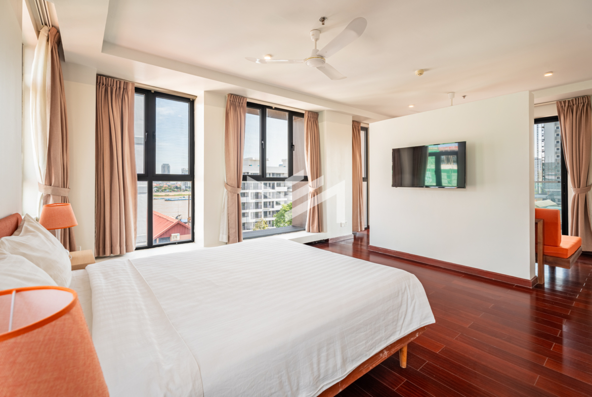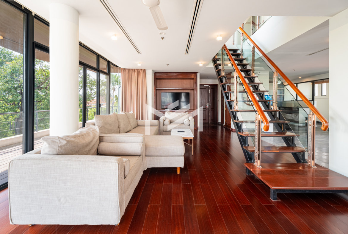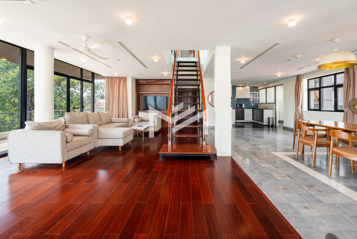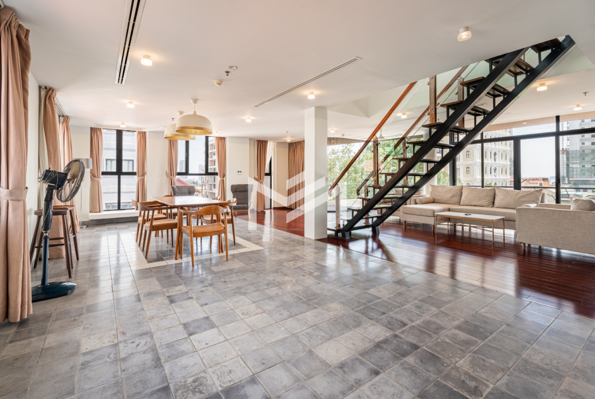 Discover this exceptional duplex corner penthouse, perfectly positioned to enjoy morning sunrise, panoramic river views, and a truly calm, peaceful atmosphere. Designed for comfort and luxury, the home features a large terrace, expansive living room, and elegant wood flooring throughout. This beautiful low-rise building feels like a private sanctuary in the heart of the city. Enjoy a refreshing swim in the serene pool, shaded by mature trees, giving you the feeling of being in a resort. Cleaning service and bed-linen change are included, ensuring a hassle-free lifestyle, along with 24-hour security for complete peace of mind. Located in the CBD near Wat Phnom, steps away from Exchange Square, Vattanac Capital, and less than 5 minutes to Central Market, this penthouse offers unmatched convenience in one of Phnom Penh’s most vibrant and historic districts.